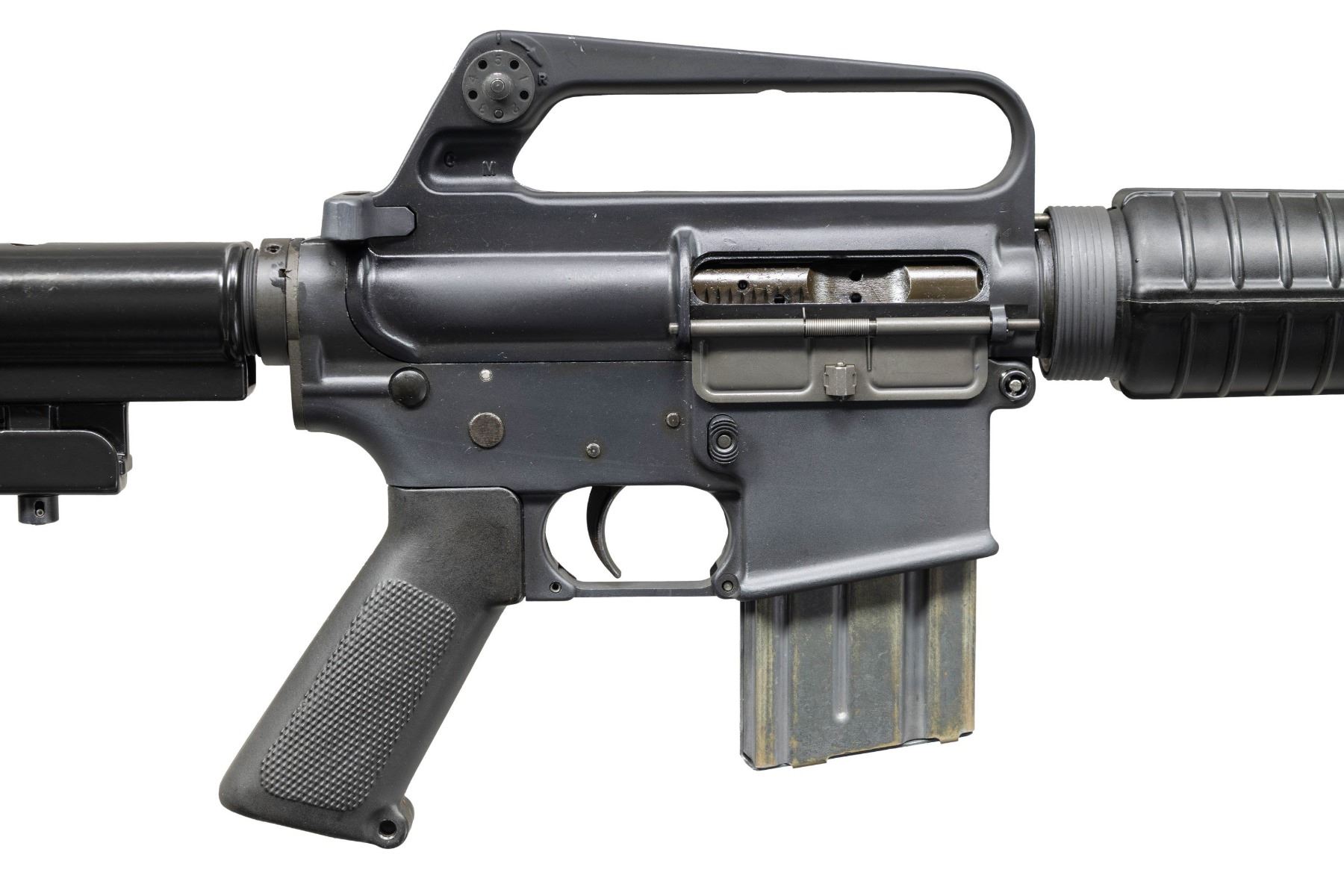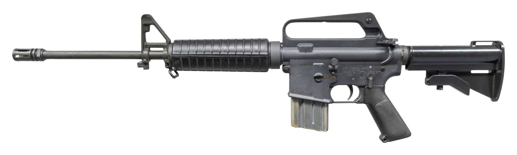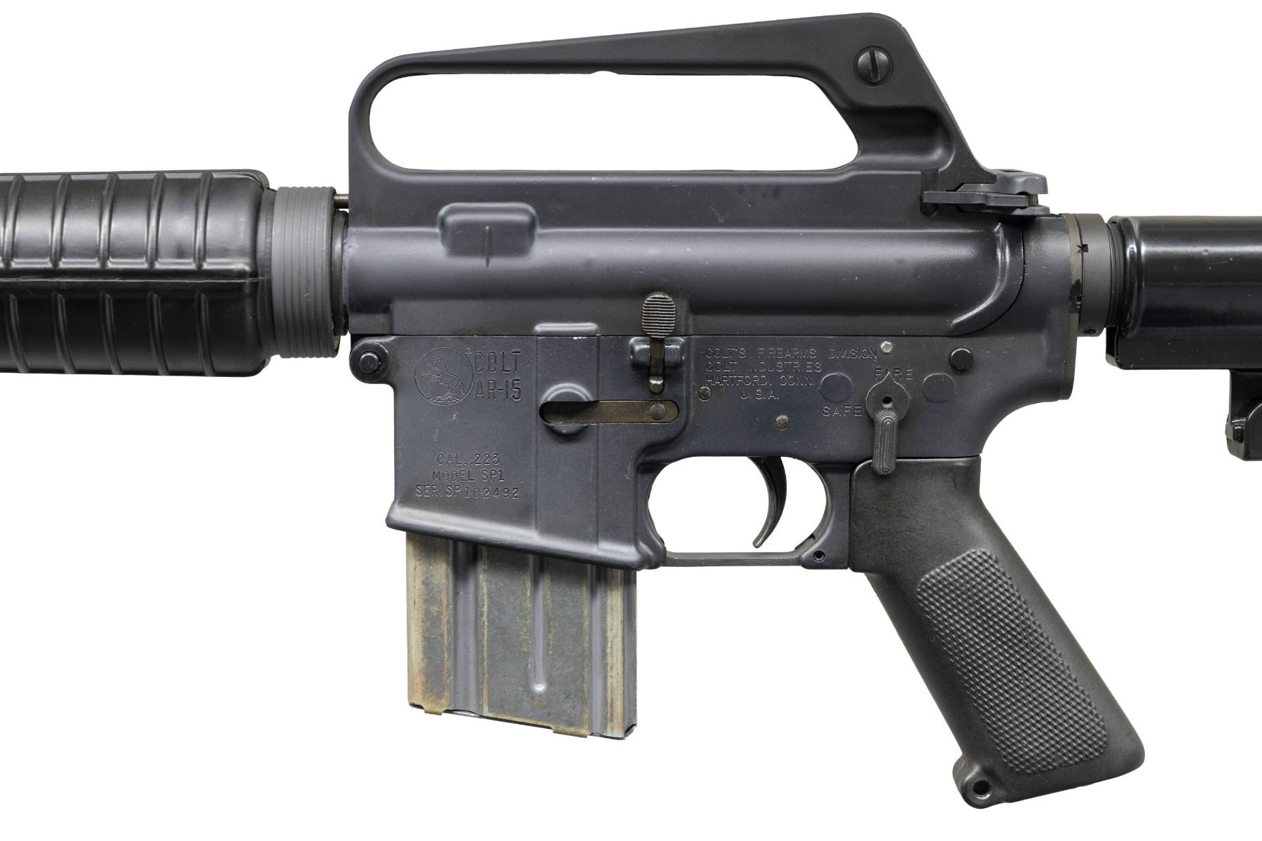 Cal. 5.56x45mm (.223 Rem.). S# SP102492. Bbl. 16". An SP1 Colt AR-15 select fire carbine. Threaded barrel terminated w/ A1 flash hider, marked "C MP B". Protected post front sight / bayonet lug / gas block. Round carbine handguards retained w/ strait wall delta ring. Carry handle upper receiver w/ dual aperture rear peep sight. No forward assist or brass deflector. 2 position collapsible, aluminum shoulder stock. NFA Paperwork lists "Colt's Firearms Division, Colt Industries, Hartford, CT" as manufacturer though it appears to be an aftermarket select fire conversion. MAGS: (2 total) 1 aluminum 30 rd. & 1 aluminum 20 rd. CONDITION: finish complete & consistent w/ light handling wear in the form of thinning on some high spots. Front takedown pin replaced w/ push pin. Internal finish deletion in areas of full auto conversion. Castle nut staking & paint finish not regulated. Bright bore w/ descent rifling. Fire control mechanism appears to function correctly when cycled by hand. NATIONAL FIREARMS ACT MG REQUIRING BATF TRANSFER BEFORE TAKING POSSESSION. FULLY TRANSFERABLE.(03-1914/JZ). MODERN CLASS III. $15,000-25,000.