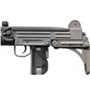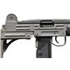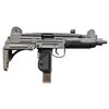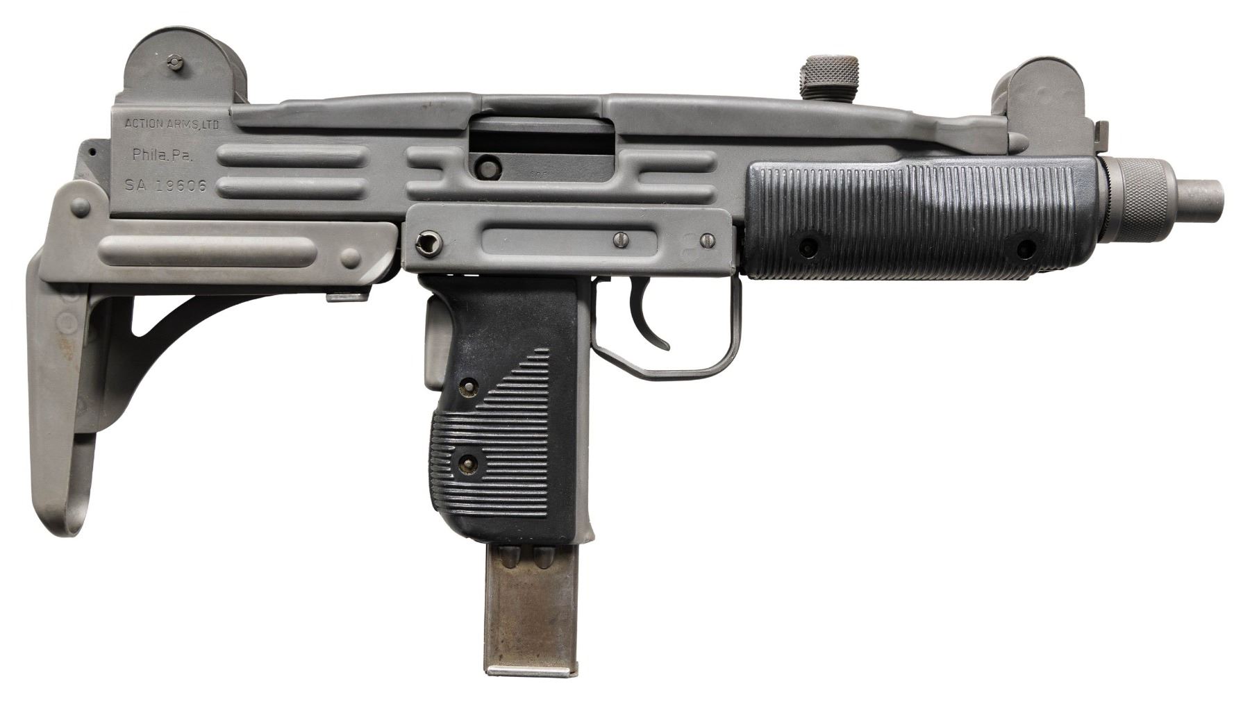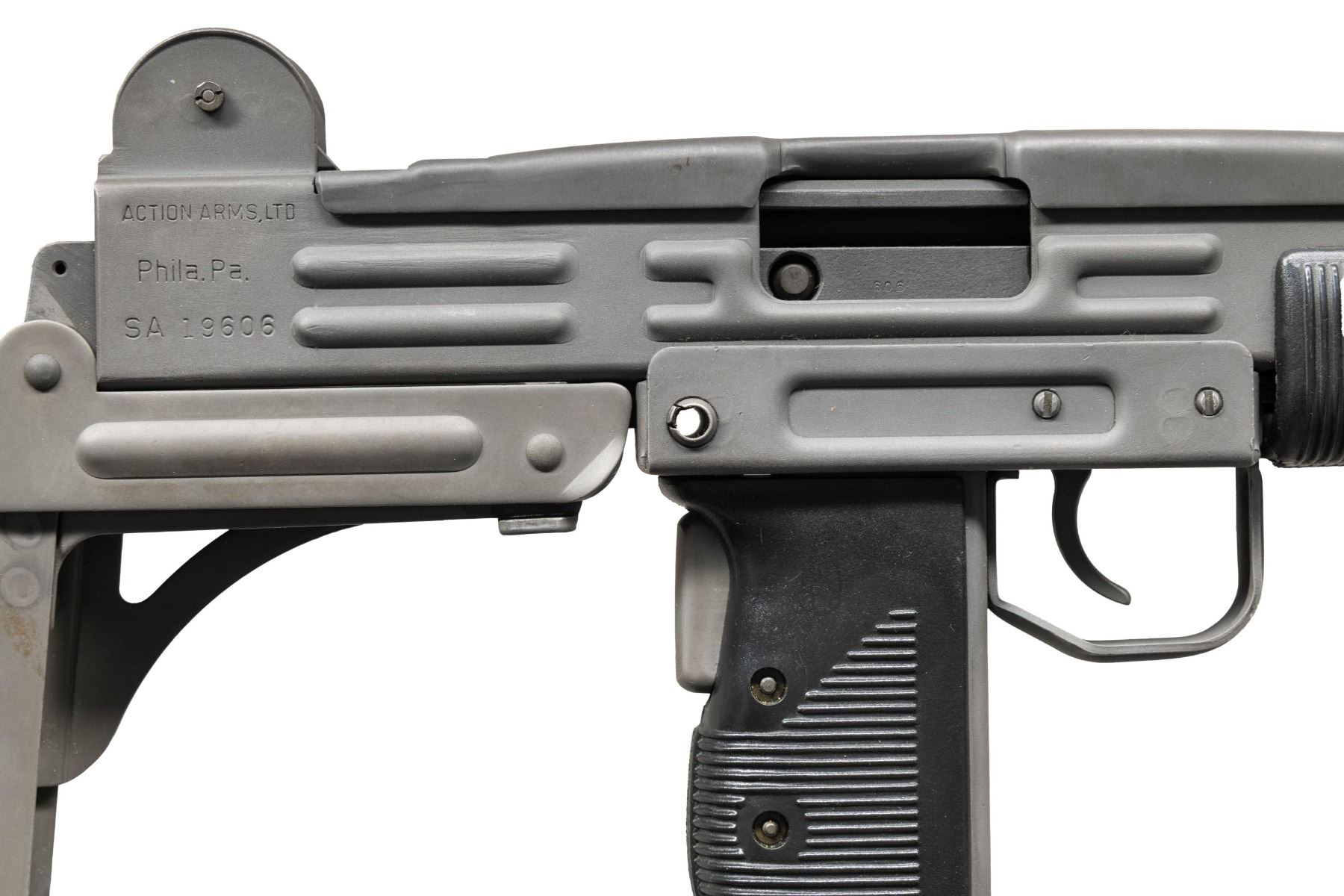 Cal. 9mm Para. S# SA19606) Bbl. 8.5". An Action Arms Ltd. Model A Uzi, converted to select fire by New Frontier Armament, Inc of Jacksonville, FL. Registry indicates "Form 2 Registration" in Manufacturers column. Conversion style left the blocking bar intact, necessitating modified SMG bolts for use. The original platform was available in several calibers, but the vast majority were offered in 9mm Parabellum. Open bolt, select fire mechanism that is light years ahead of its technology when it comes to use. The Uzi bbl only appears to be a couple inches in length which greatly minimizes its signature for use in tight quarters, but because of the ingenious design it actually extends back inside of the bolt giving the operator over 10 inches of rifled bbl. to increase hit probability immensely. Those that are familiar w/ the 1911 family of firearms will appreciate the grip safety integrated into the mechanism. This particular example has black plastic furniture. Bottom front mounted bayonet lug. Sling swivels on left side of receiver & wooden stock, currently sporting faded green canvas sling with Israeli markings. Elevation adj. protected post front sight. Dual aperture rear sight. Left side markings "A-F-S" above safety/selector. Left rear receiver markings "UZI semi-auto / MODEL A / 9mm PARA / IMI_ISRAEL". Right side receiver markings include "ACTION ARMS, LTD. / Phila. PA" w/ serial number. MAGS: 4 steel 25 rd. CONDITION: matte grey finish on all exposed metal surfaces. Traditional, collapsible shoulder stock. Standard, non-ratcheting top-cover. Fire control mechanism appears to function correctly when cycled by hand. Bright bore w/ strong rifling. NATIONAL FIREARMS ACT MG REQUIRING BATF TRANSFER BEFORE TAKING POSSESSION. FULLY TRANSFERABLE. (03-1932/JZ). MODERN CLASS III. $8,000-12,000.