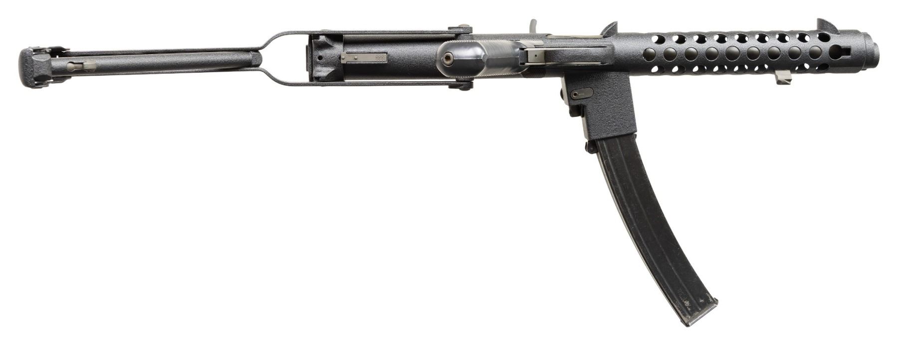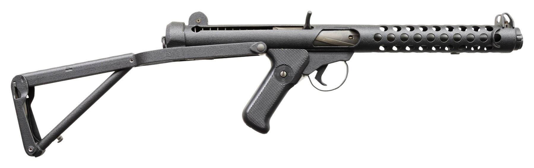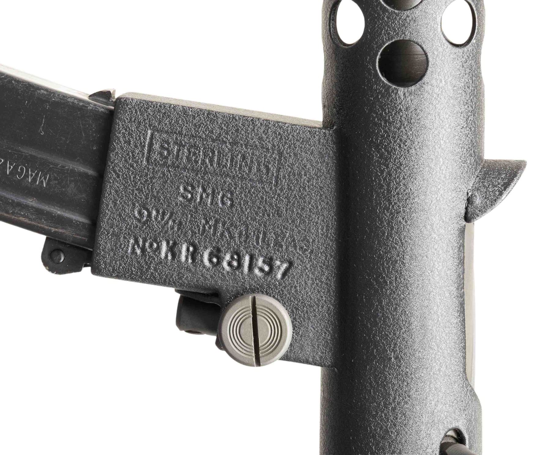 Cal 9mm Para. S#BT160. Bbl 8.5" with fixed post front sight with protected ears. Dual Aperture flip peep rear sight with protected ears. The Sterling SMG was originally developed by G.W. Patchett in the 1940s and originally named simply "The Patchett". Several variations were tested & offered, including semiautomatic-only carbines, & numerous versions of the SMGs that were eventually adopted by New Zealand, Canada, India & the United Kingdom. This example was built by John Andrewski on a Taylor Tube with Sterling small part components. Top of Mag well is marked "Sterling/SMG/9mm/MK(L2A3) / No.XR68157". Tube marked next to rear sight ear " Taylor MFG- Decatur GA". Three position right handed selector. MAGS: 1. CONDITION: Overall very fine. Textured black hard coat finish. Appears unfired after remanufactured. Good bore with sharp rifling. PROVENANCE: Military Museum Collection of Shooters Outpost, Hooksett NH. NATIONAL FIREARMS ACT MG REQUIRING BATF TRANSFER BEFORE TAKING POSSESSION. FULLY TRANSFERABLE (03-1992/ZAL). MODERN CLASS III. $18,000-24,000.