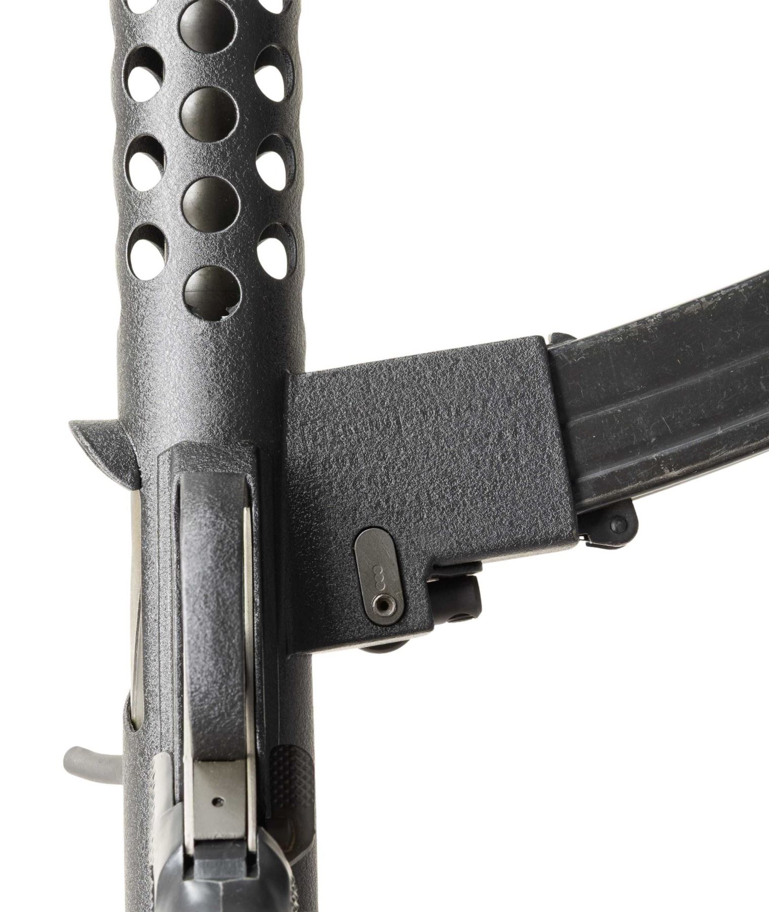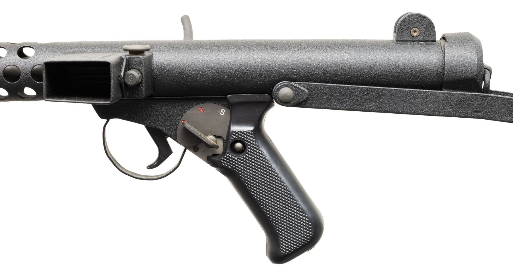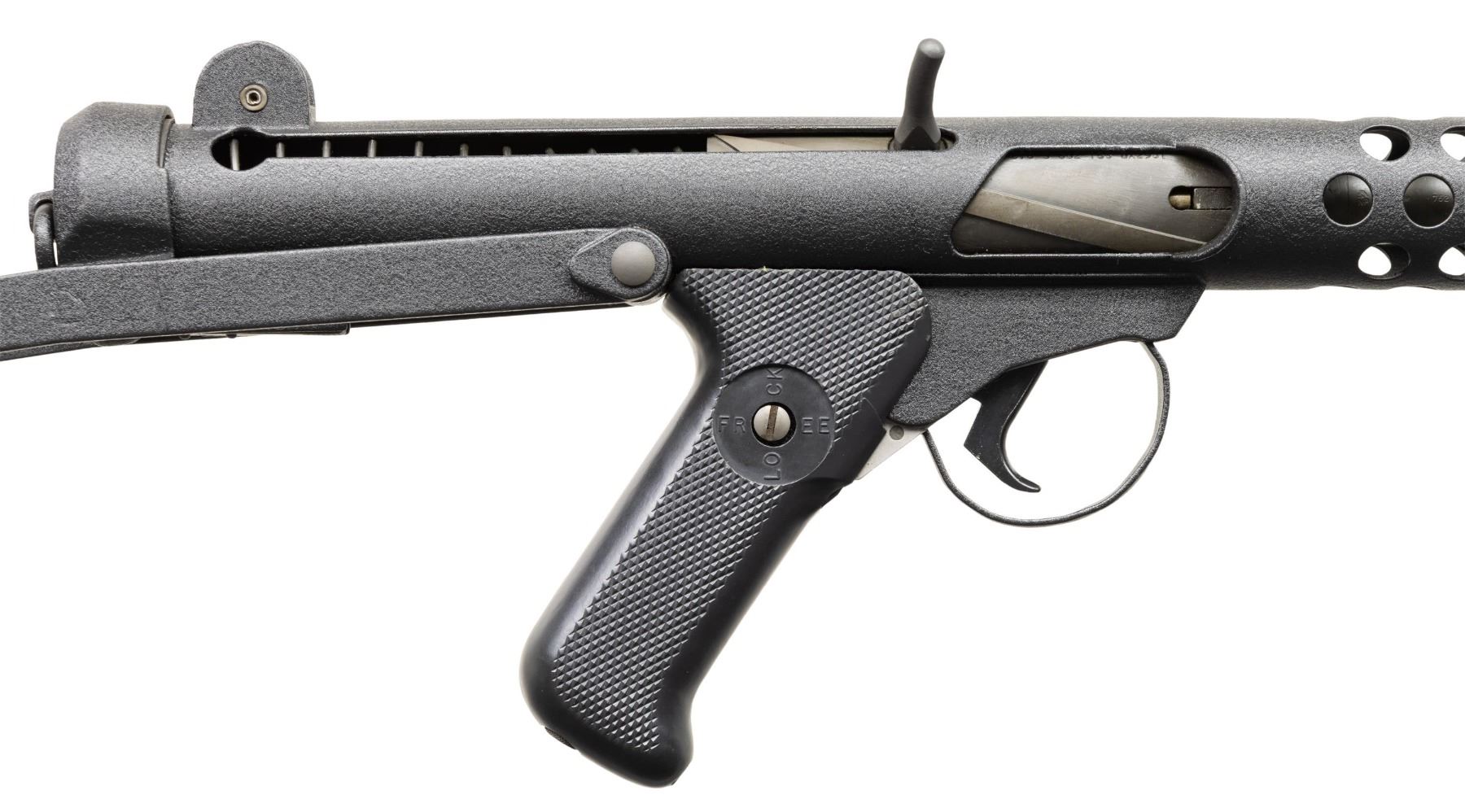 Cal 9mm Para. S#BT160. Bbl 8.5" with fixed post front sight with protected ears. Dual Aperture flip peep rear sight with protected ears. The Sterling SMG was originally developed by G.W. Patchett in the 1940s and originally named simply "The Patchett". Several variations were tested & offered, including semiautomatic-only carbines, & numerous versions of the SMGs that were eventually adopted by New Zealand, Canada, India & the United Kingdom. This example was built by John Andrewski on a Taylor Tube with Sterling small part components. Top of Mag well is marked "Sterling/SMG/9mm/MK(L2A3) / No.XR68157". Tube marked next to rear sight ear " Taylor MFG- Decatur GA". Three position right handed selector. MAGS: 1. CONDITION: Overall very fine. Textured black hard coat finish. Appears unfired after remanufactured. Good bore with sharp rifling. PROVENANCE: Military Museum Collection of Shooters Outpost, Hooksett NH. NATIONAL FIREARMS ACT MG REQUIRING BATF TRANSFER BEFORE TAKING POSSESSION. FULLY TRANSFERABLE (03-1992/ZAL). MODERN CLASS III. $18,000-24,000.