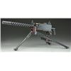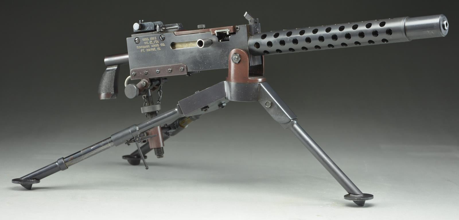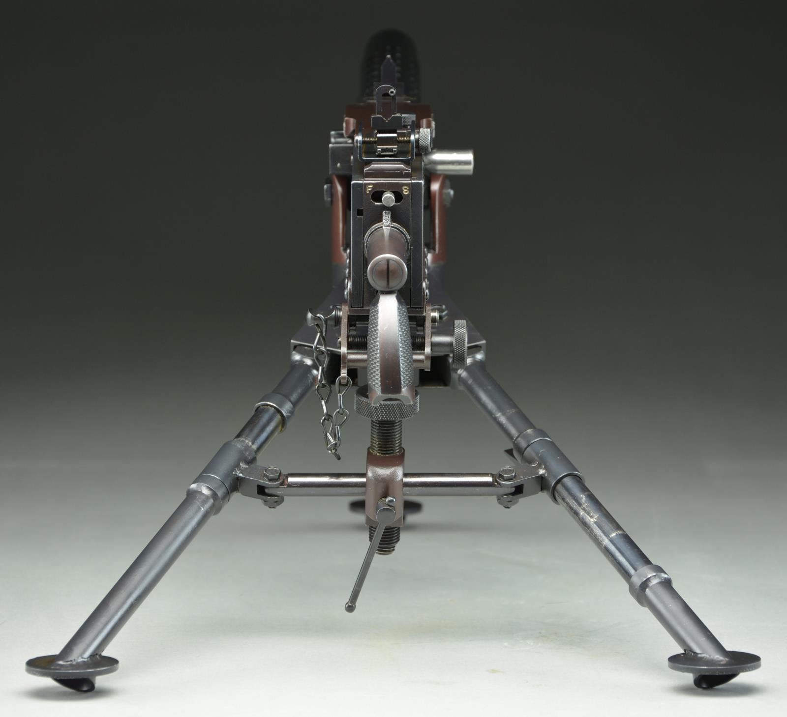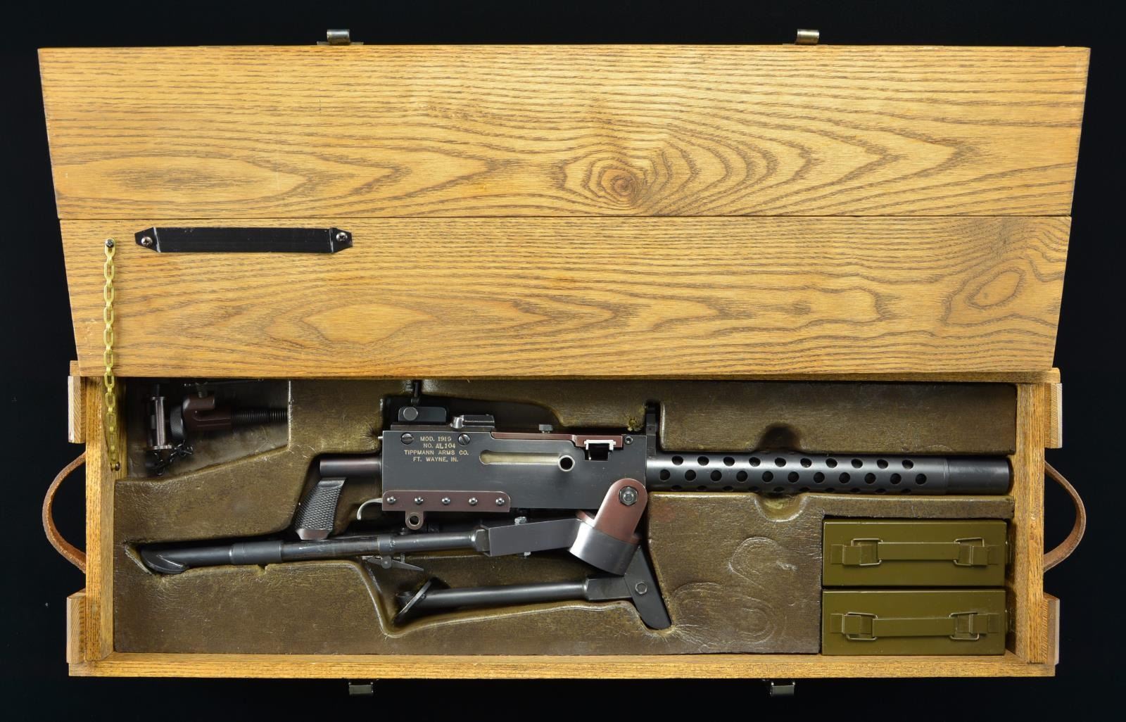 AIR-COOLED BELT-FED IN WOODEN CRATE. Cal. 22 LR. S# AL104. Bbl. 12". A fully functional half scale version of the US military Model 1919 Machine gun. Chambered in 22 LR. Feeds from cloth belt and plastic disintegrating links. Functioning almost identical to the full size counter part, the miniature feed mechanism is entirely fitted by hand after being machined to exacting tolerances. Dark blued finish including tripod and T&E mechanism. Ventilated barrel jacket and booster, just like the original. Front sight is a folding blade and rear sight is a graduated ladder, windage adjustable similar to the full size mechanism, with notch when folded for close engagements. It is as interesting a display piece as it is fascinating to shoot. Right sideplate markings include; " MOD. 1919 / NO. AL104 / TIPPMANN ARMS CO. / FT. WAYNE, IN". Steel single style pistol grip. MAGS: 2 new cloth belts. UNATTACHED ACCESSORIES: custom fit oak chest holds not only the gun but the included 2 miniature ammo cans. Fully functional T&E mechanism. CONDITION: finish is complete and consistent with full coverage. Tripod finish is equally full with some thinning and exclusion in areas of mechanical intervention. Bore is shiny with light rifling. Very smooth trigger. Fire control mechanism appears to function correctly when cycled by hand. NATIONAL FIREARMS ACT MG REQUIRING BATF TRANSFER BEFORE TAKING POSSESSION. FULLY TRANSFERABLE. (03-1618/JZ). CURIO. $28,000-38,000.