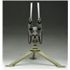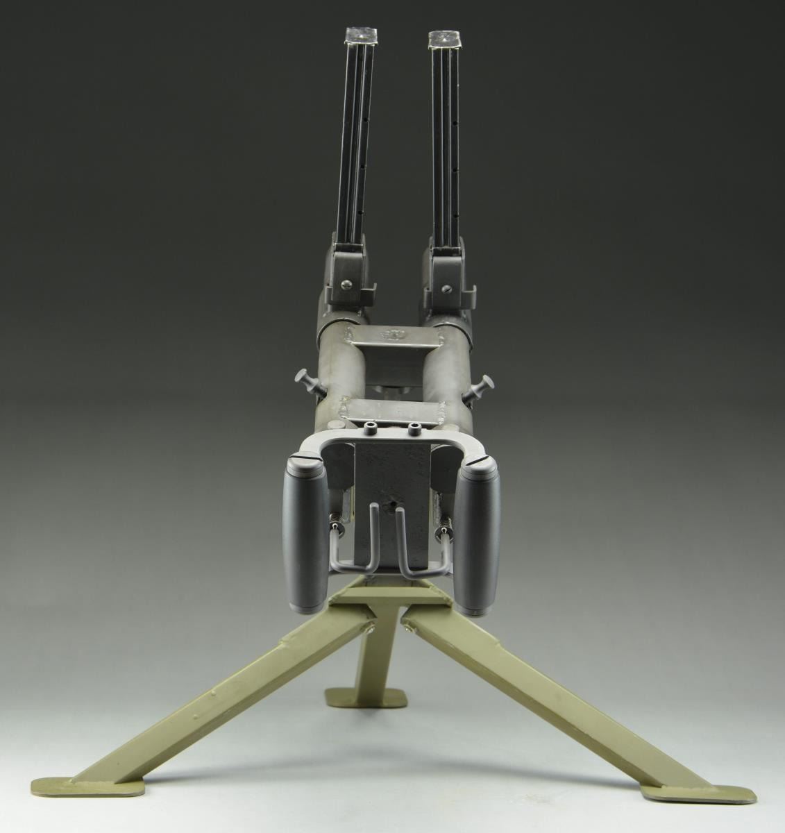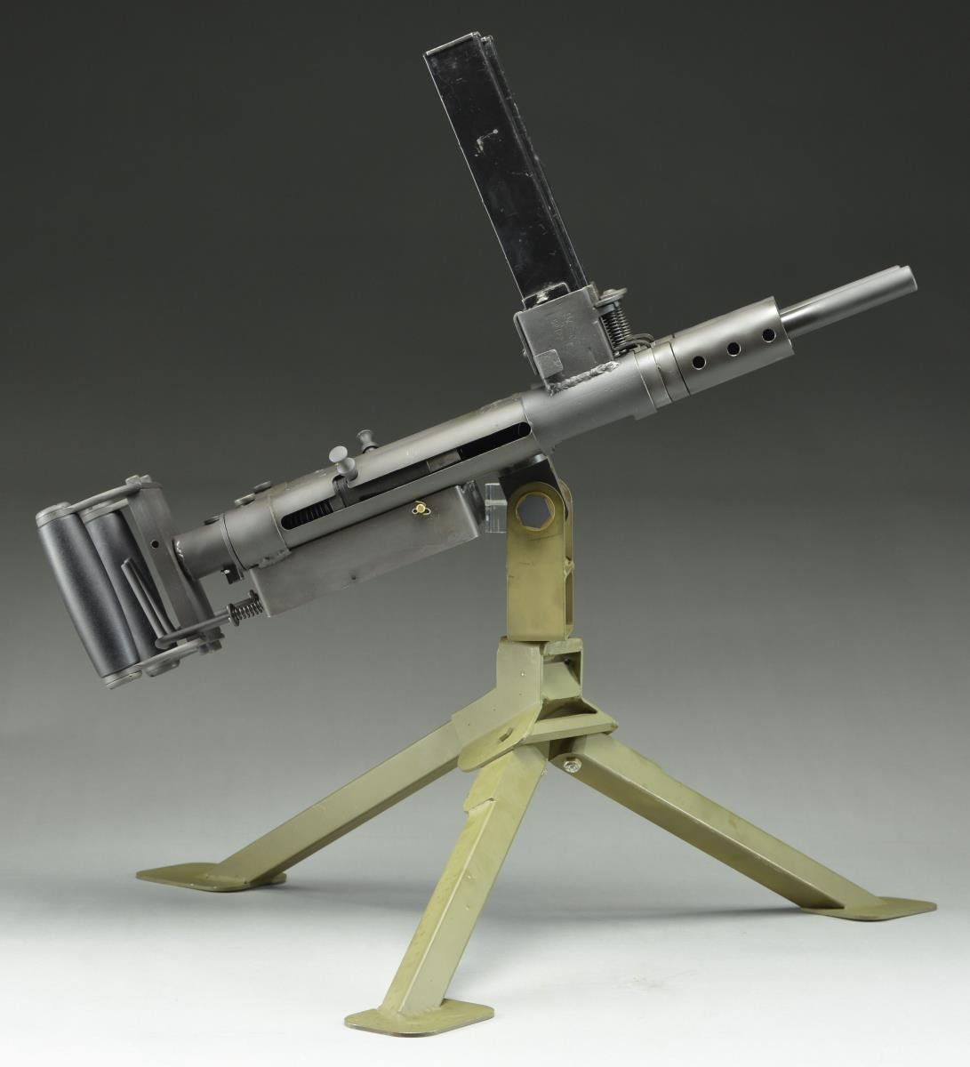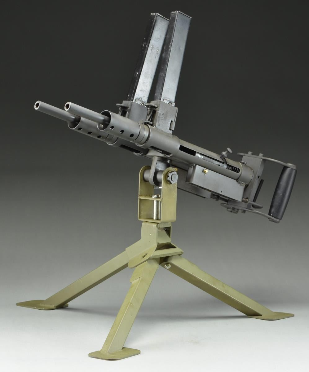 9MM SMG. Cal. 9mm. S# S077. Bbls. 7.8". A rarely seen American manufactured tribute to the World War 1, twin barreled M1915 Italian Villar Perosa SMG. Referred to as the STEM MK II, it is a simple blowback operated, open bolt operating system. This brainchild of John Stemple combines 2 modified Sten tubes to a new common receiver w/ 2 separate magazine wells & a set of spade grips w/ 2 independent triggers. The center receiver portion incorporates a solid mount to work in conjunction w/ a custom tripod. Just like the Italian original, it feeds from dual, top mounted magazines & ejects out the bottom. Black painted finish. No sights. Browning Model 1919 style spade grips w/ black plastic handles. Each barrel has its own individual bolt & charging handle. Each barrel can be fired independently, or fired together. MAGS: 2 Steel 30 rd. UNATTACHED ACCESSORIES: custom tripod. CONDITION: excellent condition. All aspects indicate very little use. Finish coverage is complete & consistent w/ only very light handling marks. Triggers operate smoothly, Bores are bright w/ strong rifling. Fire control mechanism appears to function correctly when cycled by hand. NATIONAL FIREARMS ACT MG REQUIRING BATF TRANSFER BEFORE TAKING POSSESSION. FULLY TRANSFERABLE. (03-1616/JZ). MODERN CLASS III. $7,000-10,000.