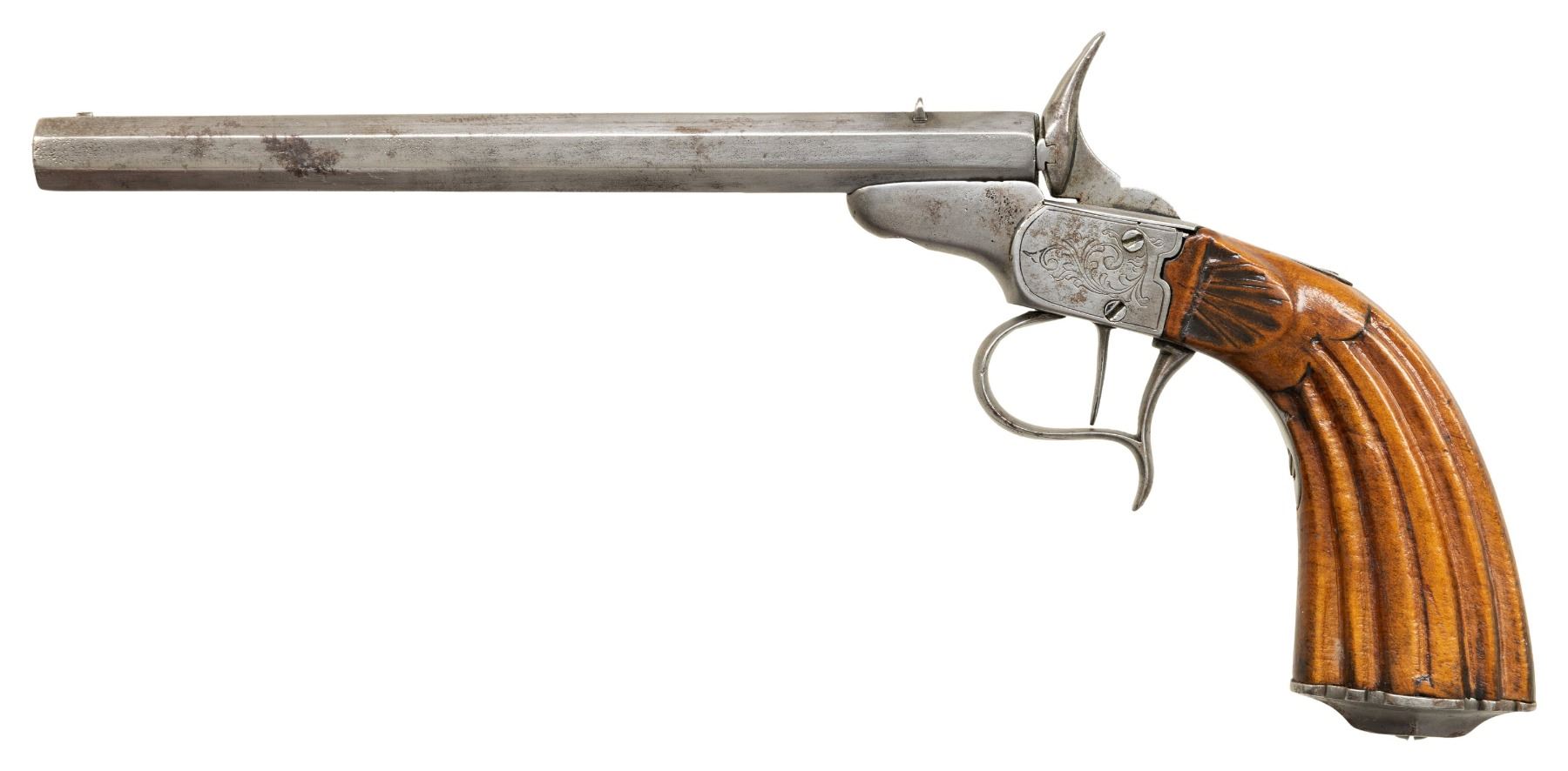 BREECHLOADING PARLOR PISTOL, BY COURARD. Cal. 22. NSN. Bbl. 7 15/16". Single shot breechloading parlor pistol mfg. in Belgium by Courard and retailed by G. Laute of Berlin. Top flat of the bbl. is engraved "G/ LAUTE IN BERLIN.", with "COURARD" marked on the bottom flat. Sides of the frame feature light bordered foliate scroll engraving, with scrollwork extending to the trigger guard bow and upper frame tang. Metal components have been cleaned in-the-white. 1-piece grooved wood grip, featuring a lightly engraved pommel cap. Fixed blade front sight with dovetailed V-notch rear sight. Bbl. screw is a brass replacement. CONDITION: metal components are good, as cleaned in-the white, exhibiting scattered patches and areas of mild pitting, a few patches of dark mild surface oxidation, as well as some scattered dings and marks overall. Dark non-rifled bore, exhibiting scattered patches and areas of moderate pitting. Proper manual mechanics. Stock shows scattered marks and impressions from handling and storage, as well as a few small chips, but otherwise remains sound. (01-28578/MLW). ANTIQUE. $100-200.