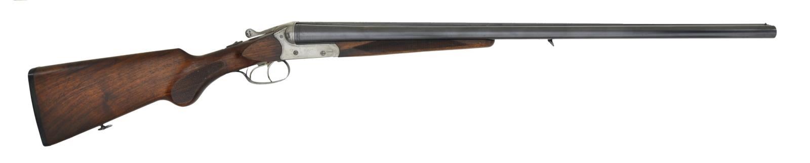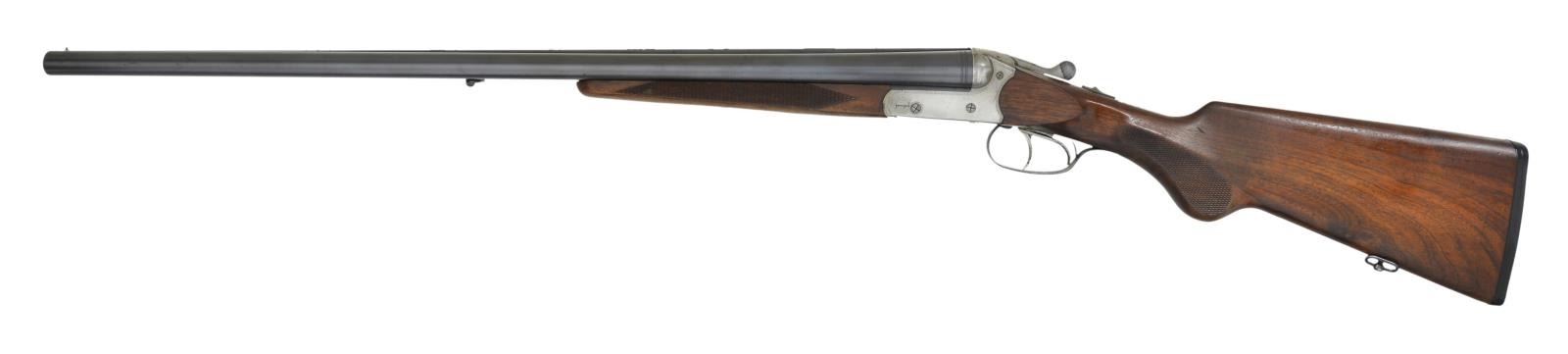 Cal. 12 Ga., 2 3/4". S# 874364 (786 = July 1986). The import marked 28" bbls. have sling swivel & shaven remnants of front bead. Bbls. numbered "7454". Full & IM chokes. Lightly case colored receiver has stamped geometric border engraving w/ blued triggerguard. Action features dbl. triggers, extractors & automatic safety. Splinter forearm & rnd. knob pistol grip stock w/ panels of checkering on sides of wrist & forearm along w/ sling swivel. LOP: 13 5/8" to Simson buttplate. UNATTACHED ACCESSORIES: black plastic case. CONDITION: very good blue w/ the occasional light mark & pinprick oxidation. Receiver has gray appearance w/ patina throughout. Good wood finish has worn varnish on buttstock along w/ numerous impressions & large scratches. Very good bores. PROVENANCE: "Save the Fine Guns". T&G German Gun Imports, bringing fine German guns to a more appreciative market. (22-6410/MD). MODERN. $400-700.