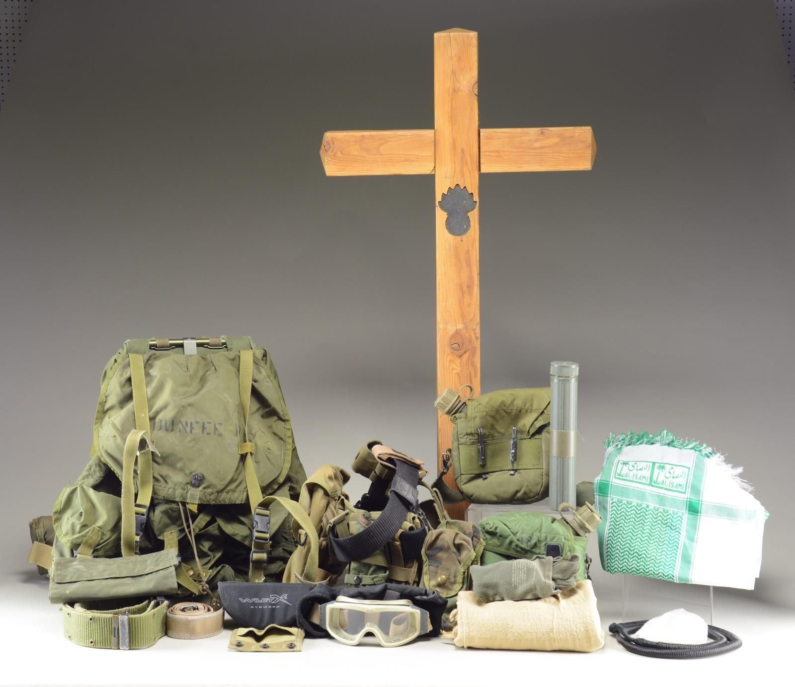 . This lot consists of items worn by USMC CWO David Dunfee during his time in the Middle East. The items are as follows: 1. Gear Tree. Gear tree in the shape of a Christian cross w/ Marine Gunner emblem. Gear tree measures 44 1/4" from top to bottom & 21" across. 2. Wiley X sunglasses w/ black pouch & spare lenses. 3. Headdress marked "Al-SAMI" w/ Islamic letters. 4. Two USGI collapsible canteens w/ pouches. 5. OD Green Alice pack w/ frame. Pack marked "DUNFEE" & has Gunner emblem pin. 6. Belt w/ six M16/M4 mag pouches, large tan Blackhawk pouch, a dual pistol mag pouch, a small Blackhawk pouch w/ Garmin Venture etrex GPS & right handed tan holster. 7. A pair of green gloves. 8. Two BDU M16/M4 mag pouches. 9. OD Green GI style belt. 10. A set of tan ESS goggles w/ pouch. Items are housed in a black plastic tub. 11. BDU woodland camo helmet cover marked "DUNFEE". CONDITION: items vary from good to very good overall w/ some items exhibiting the expected wear & tear from field use. (02-22666/MJC). $400-600.