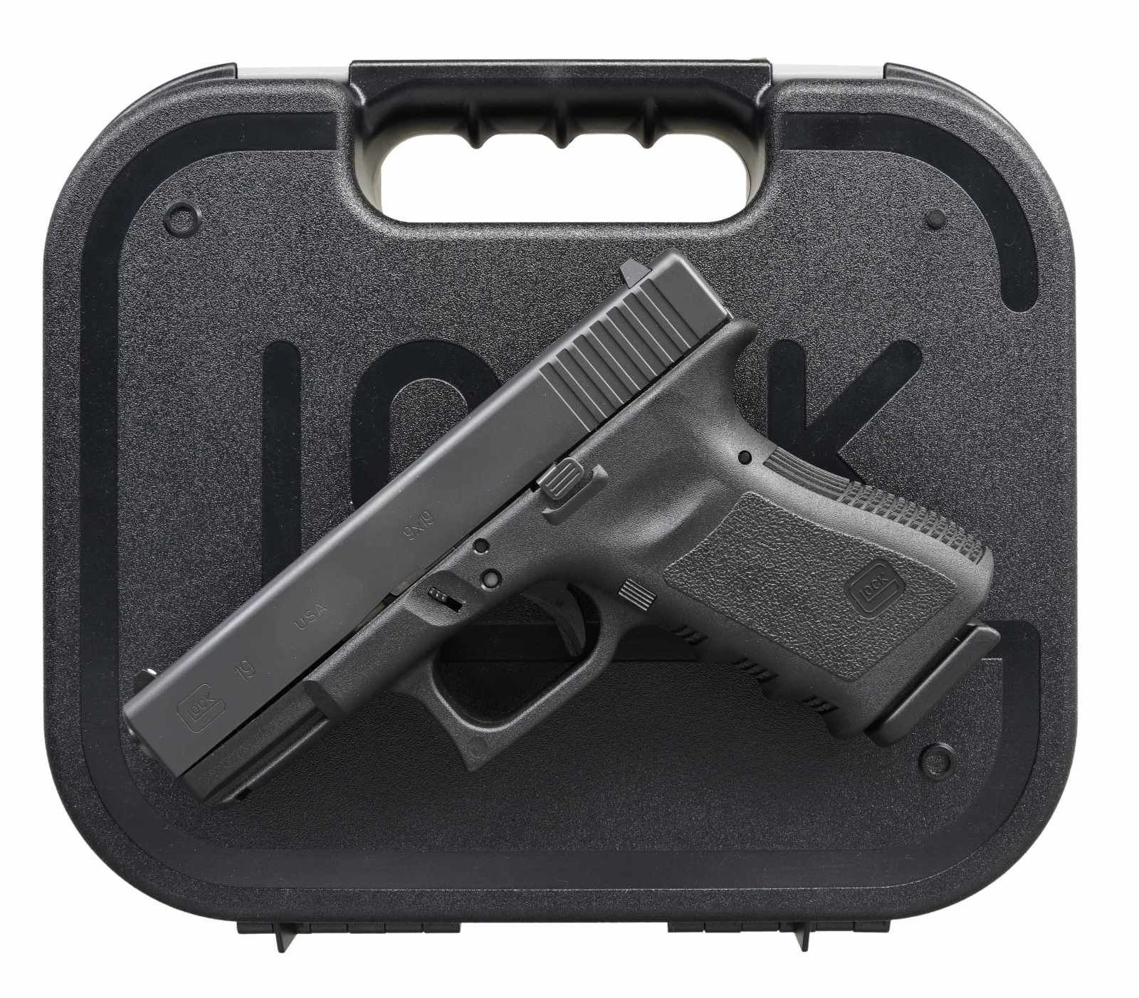 Cal. 9x19. S# AFYA395. Bbl. 4". USA made 3rd Gen Glock 19. Standard white outline Glock sights. Matte black finish slide w/ rear serrations. Polymer frame w/ accessory rail & finger grooves. MAGS: 2-15 rd. factory. UNATTACHED ACCESSORIES: matching numbered factory hardcase w/ foam inserts, mag loader, paperwork & cable lock. CONDITION: all aspects near excellent. PROVENANCE: The Collection of Gun Sport Ltd owned by Jon R. Thomas. (23-3322/MJC). MODERN. $300-500.
