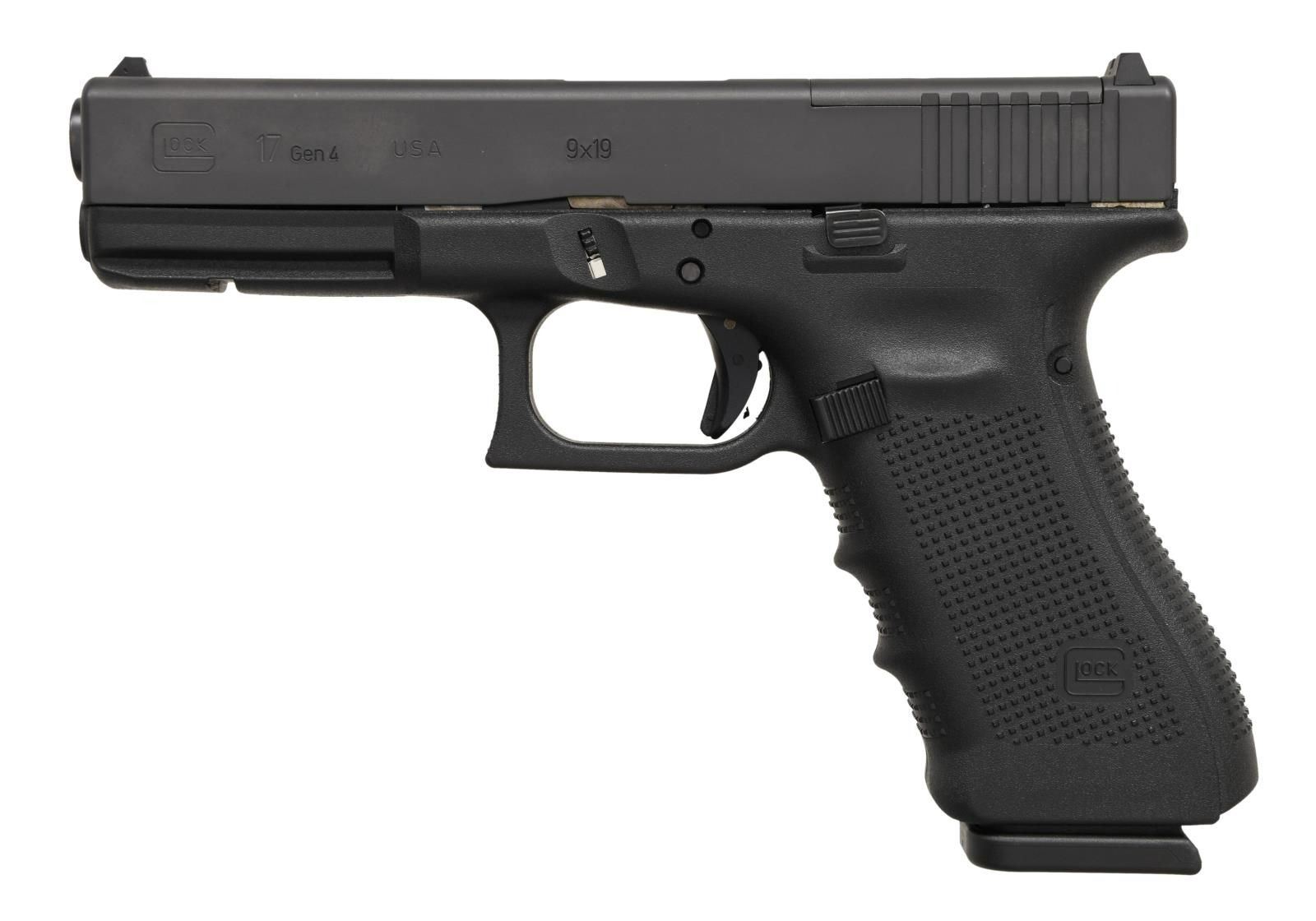 Cal. 9mm. S# ACST393. Bbl. 4 3/4". Standard white outline Glock sights. MOS model w/ factory slide cut for RMR plate. Gen4 USA made Glock 17. Matte black finish slide w/ rear serrations. Black polymer frame w/ finger grooves & accessory rail. MAGS: 1-17 rd. factory. UNATTACHED ACCESSORIES: w/box. CONDITION: all aspects near excellent. PROVENANCE: The Collection of Gun Sport Ltd owned by Jon R. Thomas. (23-4153/MJC). MODERN. $500-750.
