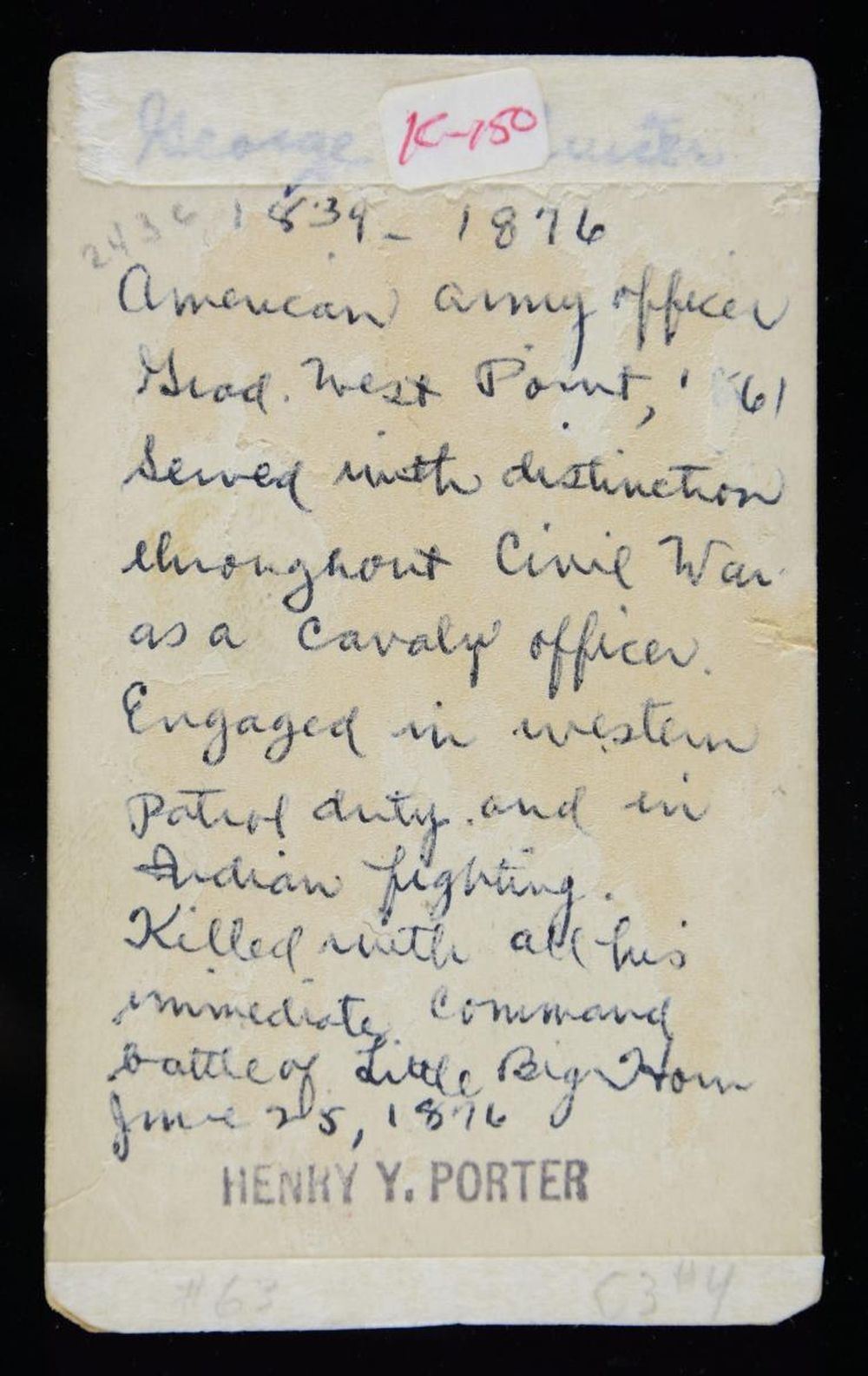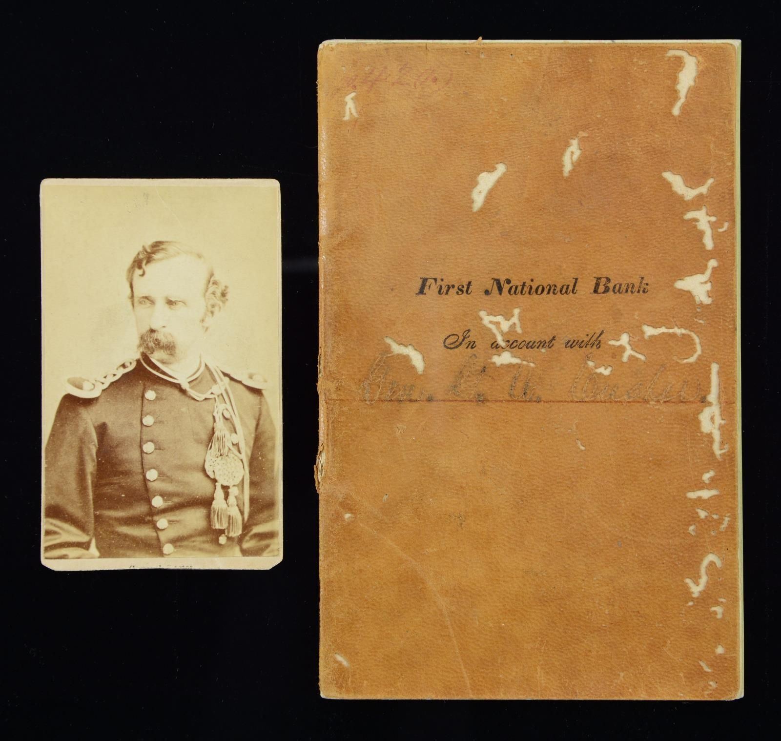 ACCOUNT BOOK. CDV is contemporary copy of K-150 for Custer in Photographs, March 1876 Mora, NYC. Account book is 6.5" x 4" leather bound with name on cover & bank. 4 pages show activity from January to December of 1870, last page shows several expenses around St. Louis. CONDITION: CDV is good, trimmed, inked bio on verso. Bank book good, insect damage to leather veneer on cover. PROVENANCE: General George A. and Elizabeth Custer; Margaret Flood (Libbie Custer's personal assistant); Spink Smythe; Martin Lane Historic & Western Americana Lifetime Collection. (02-21992/JS). $600-800.