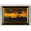AFTERGLOW". Oil on canvas depicting an evening landscape with a tranquil marsh by an inlet; a group of trees silhouetted to the viewer's right. Signed and dated lower right "Geo. McConnell 1910" and Portland Society of Art label on the verso for Spring Exhibition, 1911 with information in the artist's hand. Housed in a gold and brown gilt wood frame. SIZE: overall 17 1/2" x 25 1/2", sight 13" x 21 1/2". CONDITION: very good. PROVENANCE: from a Farmington Falls, Maine Estate. (05-1126/TG). $400-800.