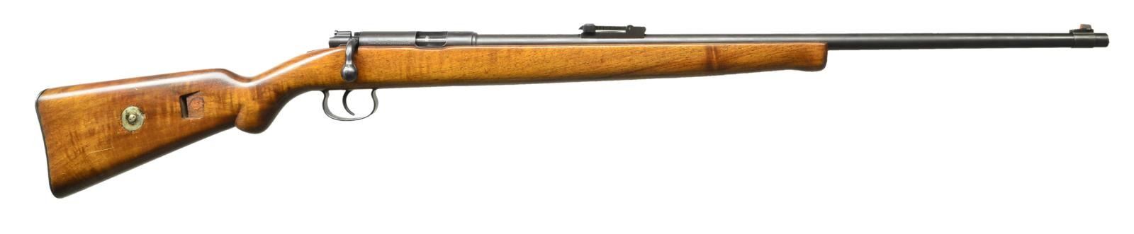 Cal. 22 LR. S# 132552. Bbl. 26" with dovetailed inverted V military style front sight and corresponding tangent rear; also drilled and tapped (with plug screws) for target blocks. Single shot designed as trainer with appearance of scaled down Model 98 Mauser. Smooth pistol gripped European walnut stock with metal buttplate plus discs on each side of butt along with sling slot; slight schnable forend. Barrel and bolt handle have crown U proofs. Over chamber marked "BSW" and "Suhl." CONDITION: very good overall as refinished. Light handling marks throughout stock set. Missing Mauser style bolt shroud safety. Near excellent bore. (22-5966/NW). CURIO. $250-400.