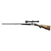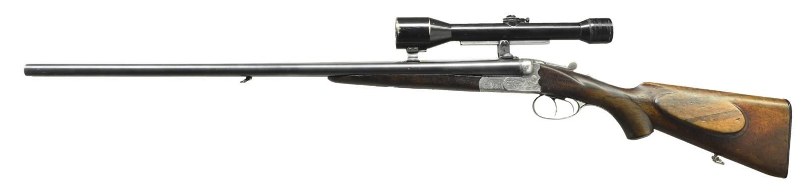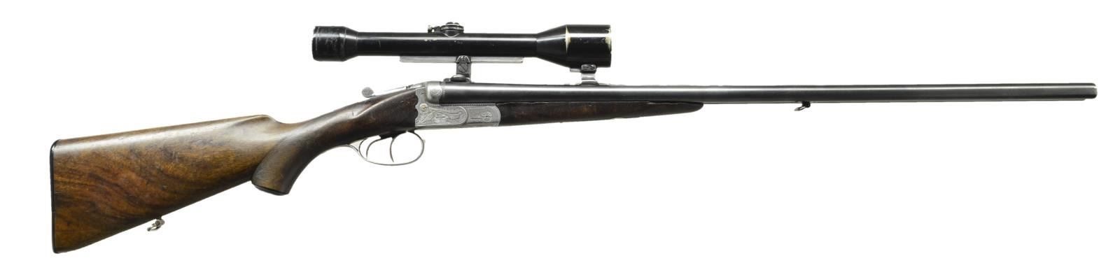 Cal. 16 Ga., 2 3/4". S# 3447 ("457" = April 1957). The 28.5" import marked bbls. have sling swivel & flattened brass stud. Full chokes. Matted rib has claw mounts holding Carl Zeiss Zielsechs 40mm scope w/ German post reticle. Water tables have 1957 German Nitro proofs. Receiver has woodland scene engraving featuring rabbit & patridge on left side & 2 pheasants on right side along w/ wedges of acanthus scroll engraving on floorplate. Engraving is highlighted by geometric pattern motifs & vine type scroll. Action features cocking indicators, dbl. triggers, ejectors & automatic safety. Splinter forearm & pistol grip walnut stock w/ left side cheekpiece, grip cap, checkering & sling swivel. LOP: 13.4" to hard rubber buttplate. UNATTACHED ACCESSORIES: With Black Plastic Case. CONDITION: good reblued metal finish over prior pitting showing residue where brass bead was installed & pinprick oxidation. Receiver shows light coating of patina. Sanded & refinished wood show smooth checkering, wood break repair at toe, numerous handling marks & large crack at forearm. Buttplate has repaired break. Good shiny bores. Scope has serviceable optics w/ good finish showing finish loss & residue from previous scope cap. PROVENANCE: "Save the Fine Guns". T&G German Gun Imports, bringing fine German guns to a more appreciative market. (22-5053/MD). CURIO. $300-500.