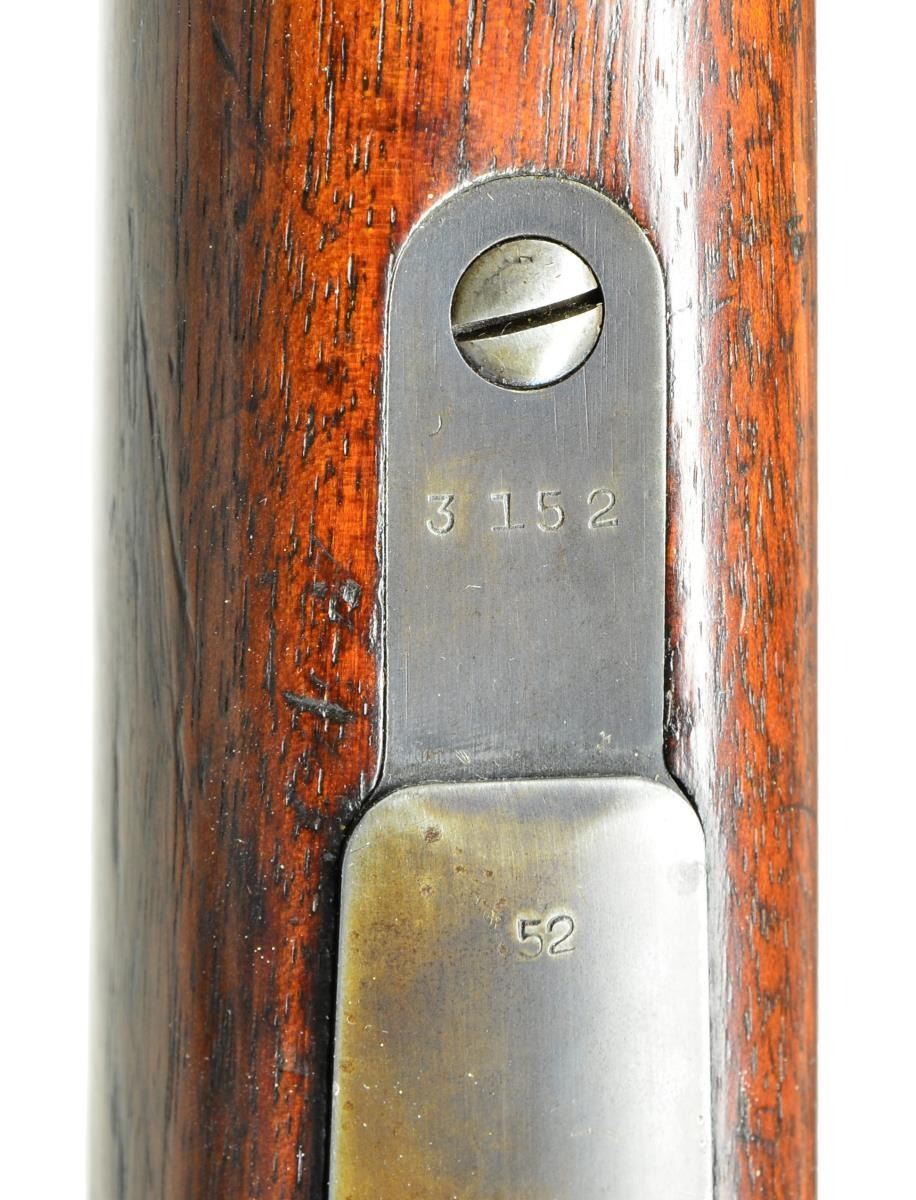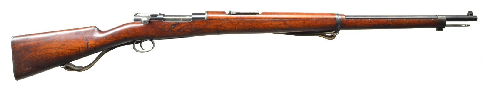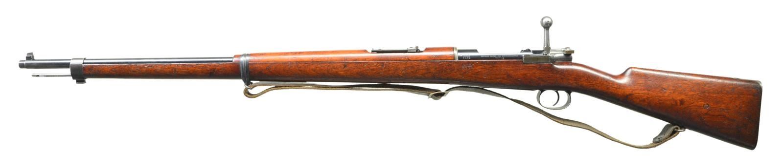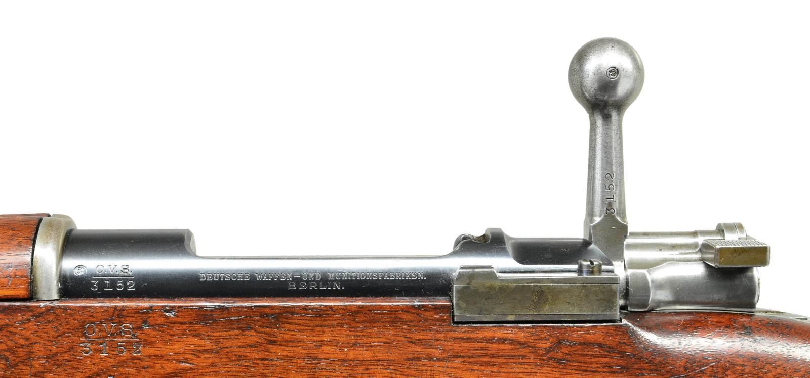 CONTRACT BOLT ACTION MILITARY RIFLE. Cal. 7x57 Mauser. S# 3152. Bbl. 29 1/4". All visible numbers match. These rifles were made for the Boer Republic OVS (Orange Free State) by DWM in Germany. Some of these rifles were undeliverable & were later sold to Chile. This example marked on left side of receiver "DEUTSCHE WAFFEN-UND MUNITIONS FABRIKEN, BERLIN". Receiver ring marked only on left side w/ "O.V.S." over S#. Stock is similarly marked just below. Receiver, bolt knob & left side of buttstock have circular acceptance mark w/ unknown letters similar to gothic. Straight bolt handle. Rifle made w/out Model 1895 type safety notch. Bolt does not have third lug. Ladder rear sight graduated to 2,000m. Inverted V front sight. Cleaning rod is present. Original leather sling. Walnut stock set marked as described above. CONDITION: stock set has nice appearance w/ crisp markings but has light wear & scattered handling marks throughout. Notable scratches on right side of butt & right side over mag. area. Metal retains 75% original thinning blue finish w/ light wear & scattered handling marks. Fire blue is visible on buttstock & follower. Good shiny bore w/ lightly worn lands. (22-556/RW). CURIO. $500-700.