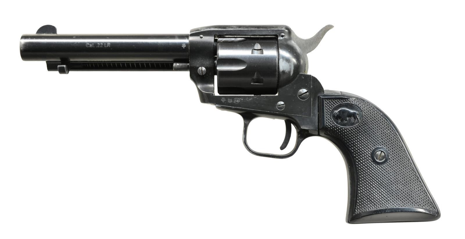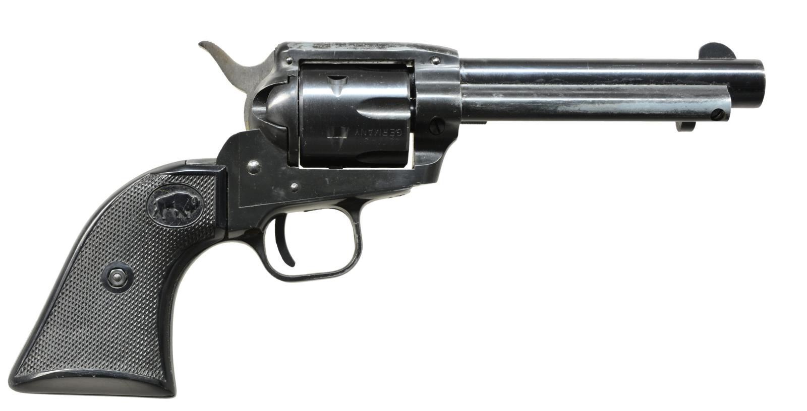 Cal. 22 Mag. S# 385765. Bbl. 4 3/4" w/ blade front sight & frame notched rear. Mfg. 1968 in Germany of alloy & steel construction w/ eagle N proofs plus matching number on bbl. along w/ "GERMANY". Mfg. markings on butt having checkered black plastic grips w/ buffalo logo. CONDITION: good plus overall w/ light high point wear; near excellent bore & grips. (21-2850/NW). CURIO. $75-150.