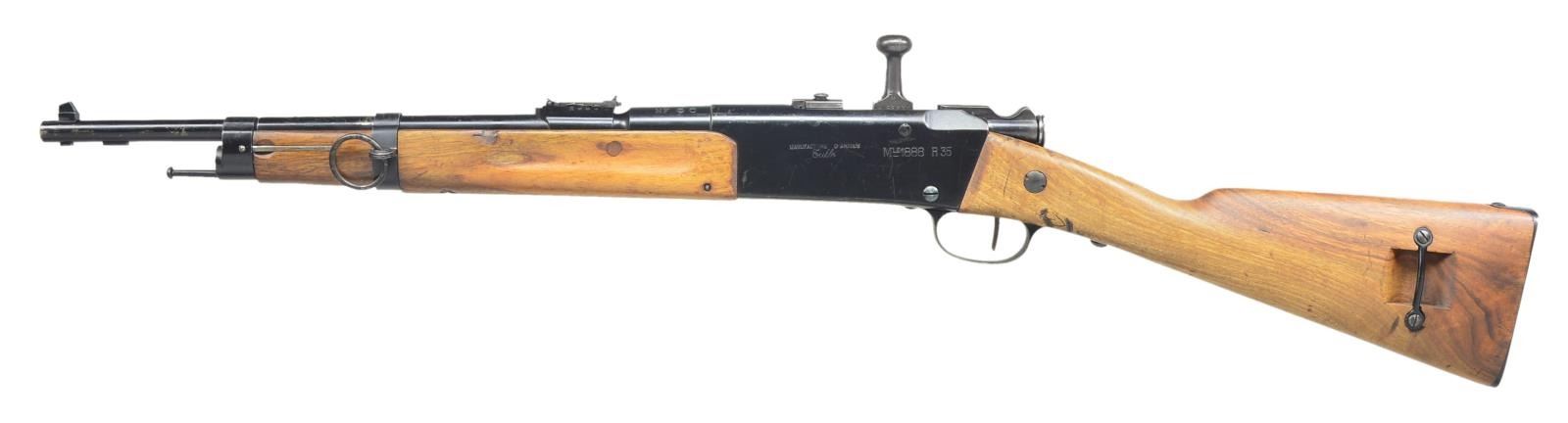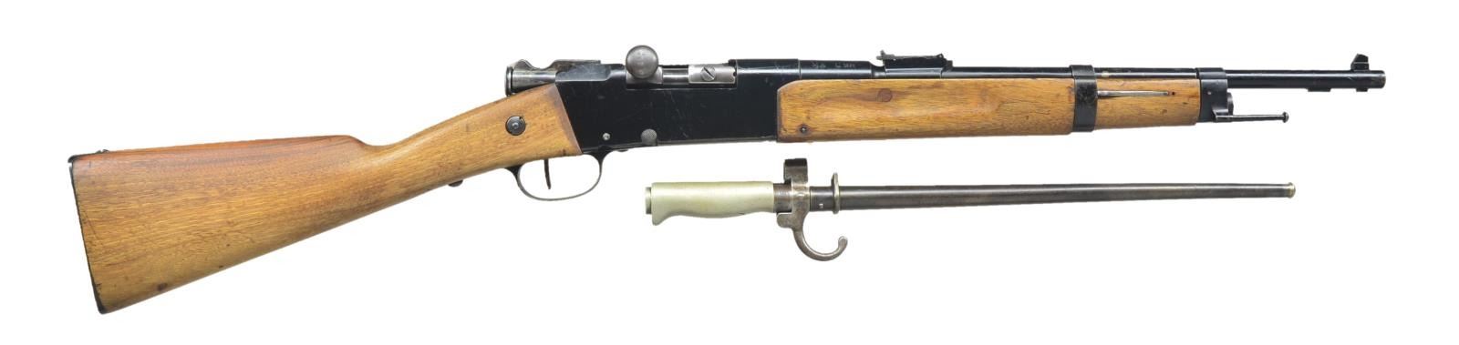 Cal. 8mm Lebel. S #98631. Bbl.17 1/2". Receiver is marked on left side w/ standard Tulle arsenal markings. Right side of bbl. marked "MA C 1938". Top of Bbl. marked w/ Balle "N" marking. Left side of Bbl. is marked w/ French ordnance inspection proofs. This R35 Lebel carbine appears to be one of the Nazi assembled examples. The bolt is serialized & there appears to be a faint two digit number on the left side of the butt. No other visible parts are numbered as is similar w/ Nazi assembled examples. The bottom of the wrist has a faint WW2 German stamping which is likely from the Krakau depot but the letters are indiscernible. Ladder rear sight graduated to 2000 meters. Notch front sight. Stacking bar present. Left side sling provisions. Hardwood stock set. UNATTACHED ACCESSORIES: M1886/R35 Lebel bayonet w/ mismatched scabbard. Metal parts of bayonet & scabbard are primarily a dull gray w/ scattered oxidation staining & some light pitting CONDITION: sanded stock shows a couple gouges, scattered dings & handling marks. Metal retains 90% arsenal black enamel finish w/ some scratches & flaking. Near excellent bright bore. (22-2485/MJC). CURIO. $300-500.