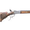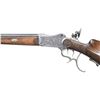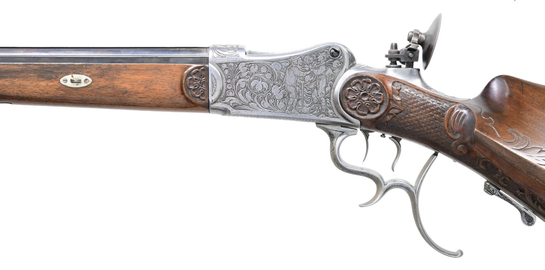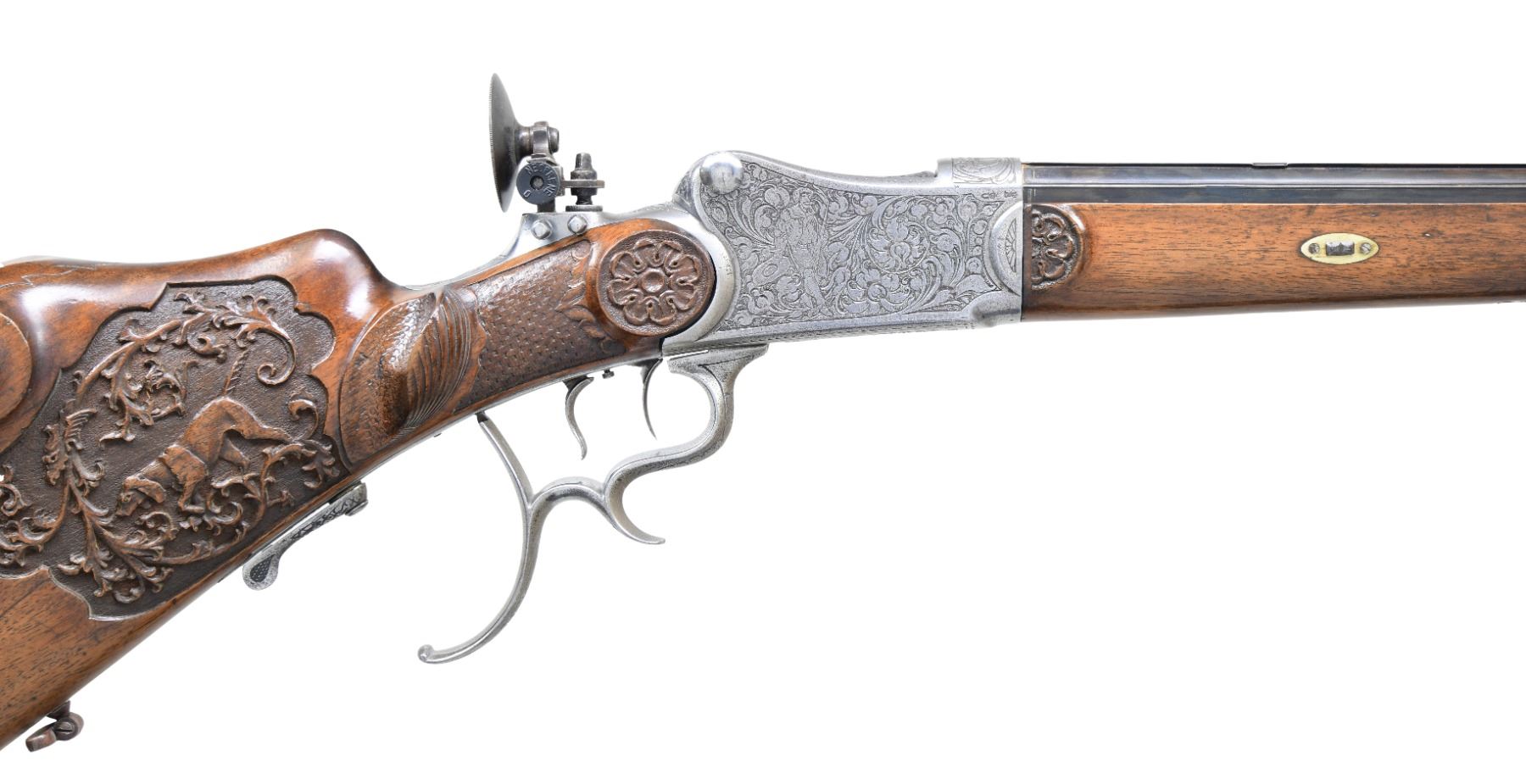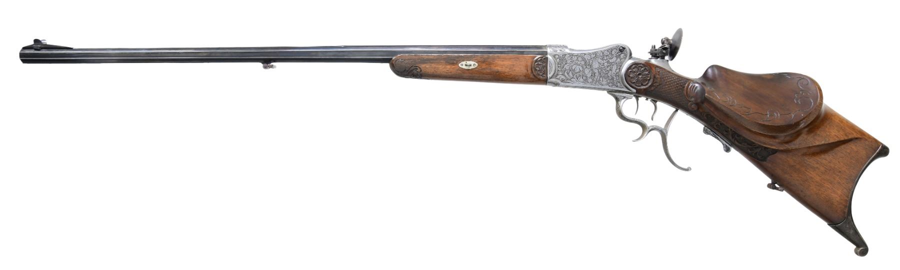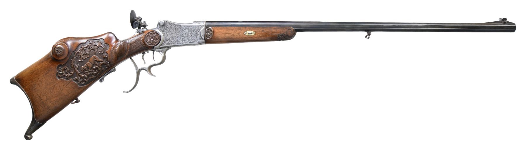 Cal. 8.15x46R. S# NSN. The 29-1/2" barrel is nicely filed in flutes. Top flat has remnants of maker's name. Coin finished martini type Schuetzen action has removable breech block and trigger group. Top tang is fitted with large peep sight adjusted for windage and elevation. Action is engraved with large acanthus scroll surrounding jaeger and peasant scenes. Triggers are double set. Plain European walnut Schuetzen stock with large saddle type cheekpiece has steel helm type buttplate. Right side of stock is relief carved with acanthus scroll and hunting dog. Checkering is of basket weave type and rosettes are at front part of stock. Matching forend has sidebolt attachment. CONDITION: fair to good. Barrel re-blued. Action heavily cleaned. Engraving detail compromised. Stocks have old oil refinish with some marks. Bore is fair to good, dark with rifling evident. Set triggers work but action will not fire. Rear sight disk broken out of base. (25-750/MGM). CURIO. $2,000-3,000.