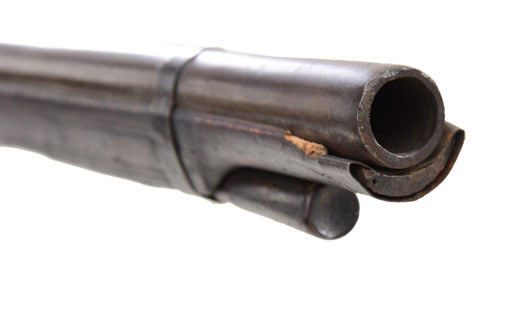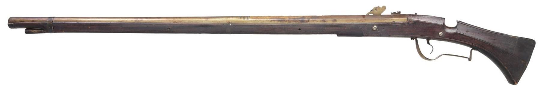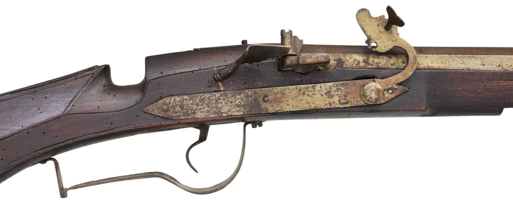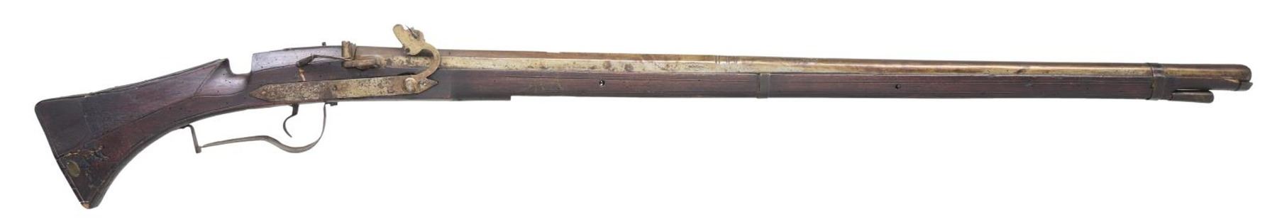 Cal. .75. NSN. 56" overall, 40" octagonal to round barrel, 8.25 pounds. Pictured and described on pages 8 and 9 "The Fur Trade", author Milton Von Damm: "The light matchlock musket was a hybrid between the 14 pound, .75 caliber military musket and the 6 to 8 pound .62 to .68 caliber caliver militia long arm. The French, Dutch, Swedish and English traded a few matchlock guns to Indians in exchange for furs prior to the introduction of the early forms of the superior flintlock technology that began to become available in the 1630's. It is assumed that the Indians would have preferred the light caliver because it was lighter to carry and more economical in the use of limited powder and lead shot. The caliver has been characterized as the forerunner of the Indian Trade fusil or Northwest gun but it was probably not the only type of matchlock involved in the fur trade. The light musket like this example could be fired without a rest and its large .75 military caliber would have given traders, settlers and Indians an edge in firepower during conflicts in forests and other close quarters". UNATTACHED ACCESSORIES: Copy of "The Fur Trade, A History of Arms and Trade Goods" by Milton von Damm. CONDITION: good to very good. PROVENANCE: Lifelong Collection of author Milton Von Damm. (01-24789/JS). ANTIQUE: $4,000-6,000.