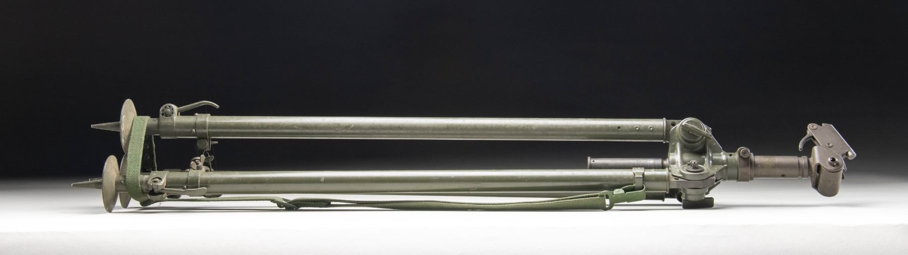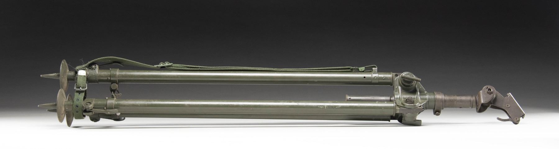 Anti-aircraft tripod for the MG34, MG42, and MG3 GPMGs (General Purpose Machine Guns) utilized by German during and after World War II. This example is unmarked, featuring a steel construction with a green pained finish. Complete with green canvas shoulder strap and leg band. CONDITION: very good, with some scattered handling marks and small scattered spots of flaking to the paint overall. (02-25486/MLW). NON-GUN. $400-600.