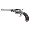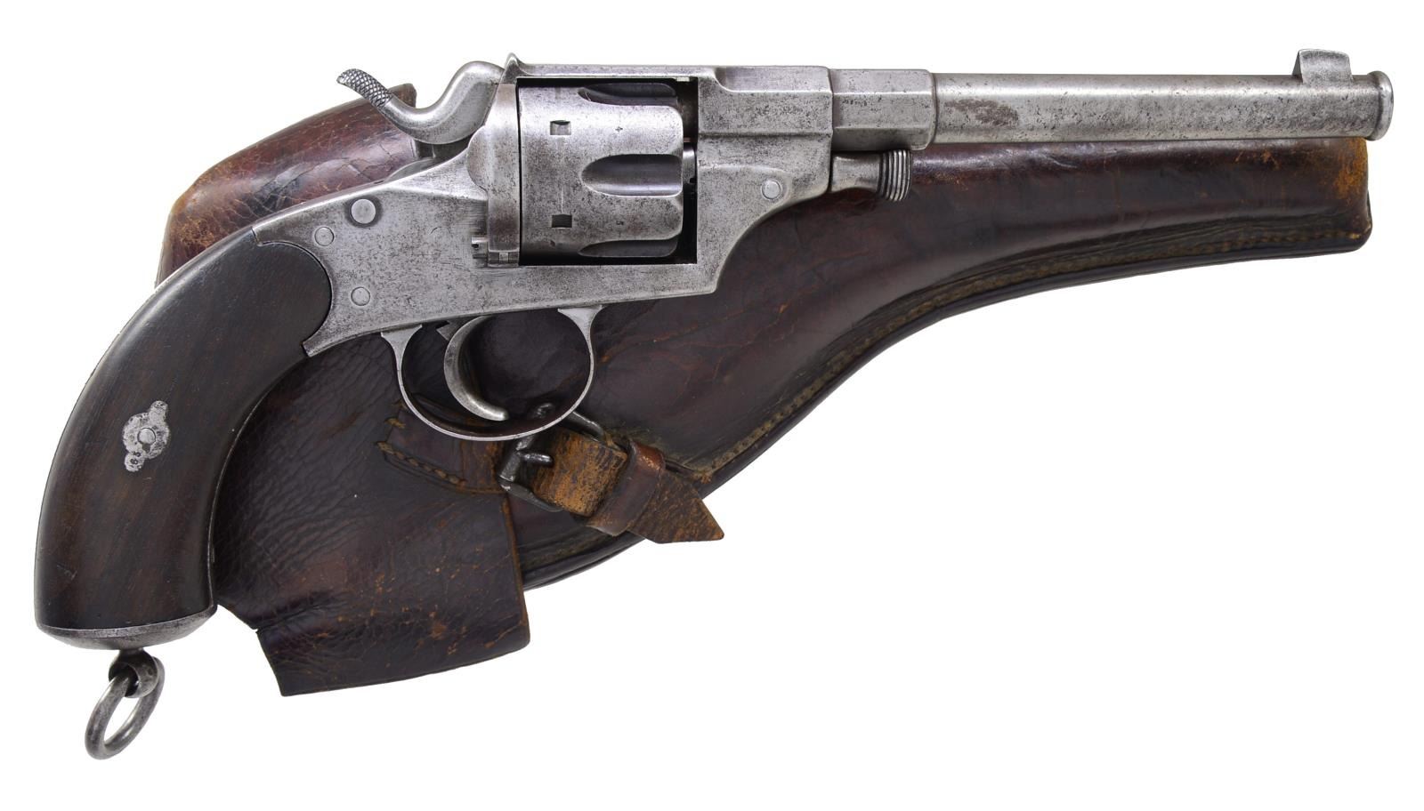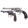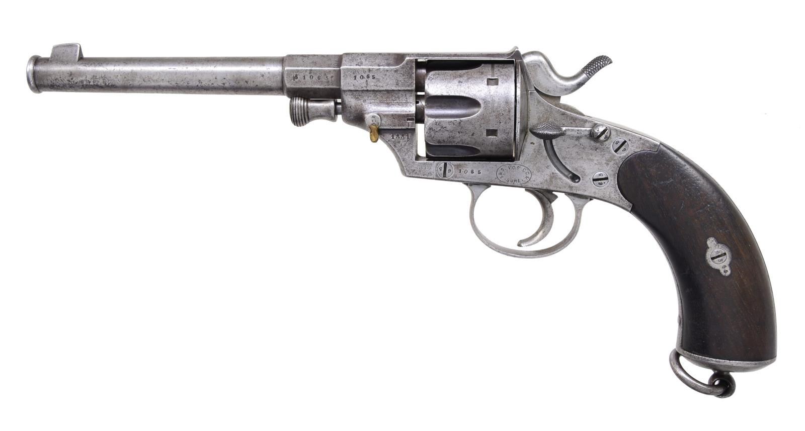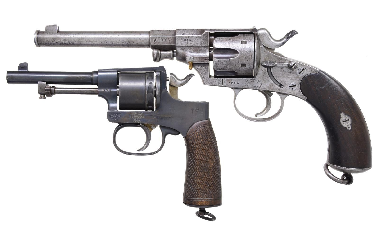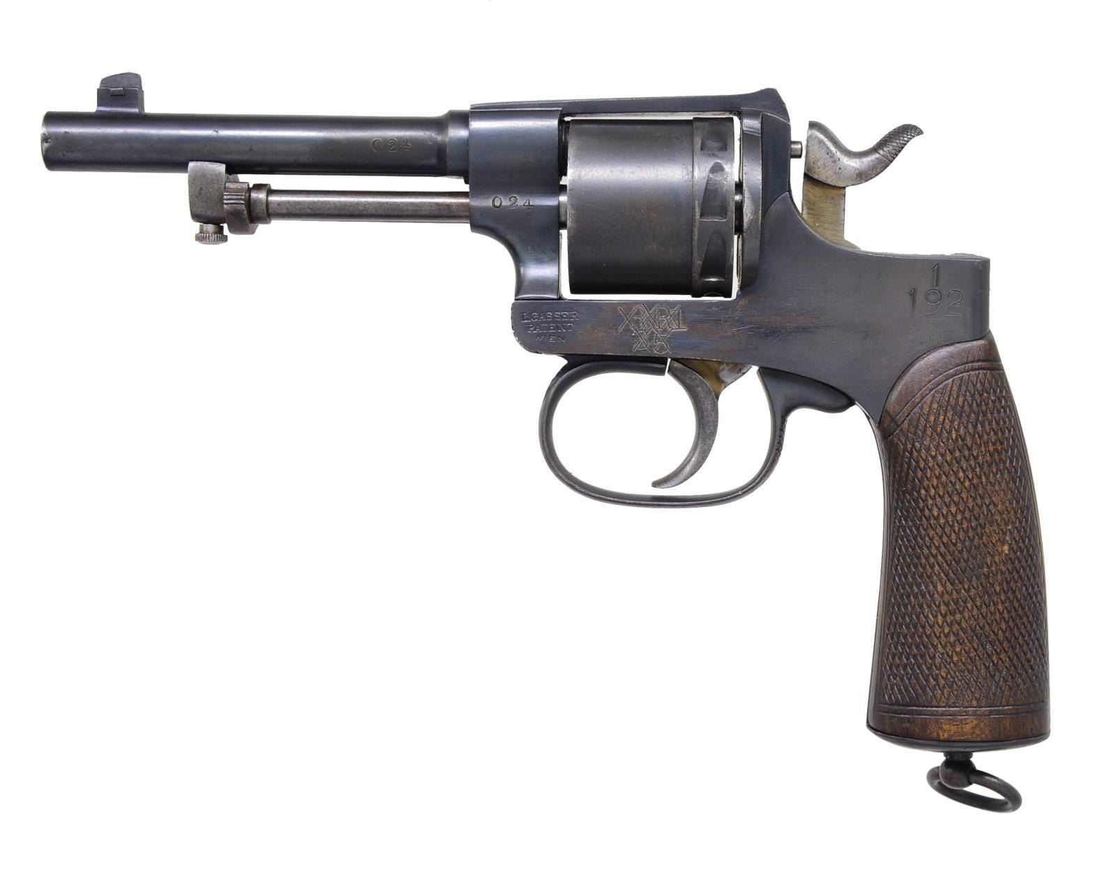 REVOLVERS. 1) SAUER & SOHN MODEL 1879. Cal. 10.55mm. S# 1065. Bbl. 7 1/8" stepped w/ cannon flared muzzle. Mfg. 1881 w/ all parts matching numbered including screws & escutcheons. Butt has regimental marking of "30.A.1." at rear & "11." at front; various German proofs. Smooth walnut grips w/ matching numbered backs. Mfg. w/ browned finish. SA functioning plus safety lever on left side of frame. Lg. robust lanyard loop at butt. UNATTACHED ACCESSORIES: military style black holster w/ buckle & strap retention; underside of formed flap marked in a box "2BFARN30" over "1900 1912" over unreadable box info. Double narrow belt loops on back w/ top of front missing stitching. Separating stitching on corner of flap. Top middle of back marked "BITTGEN" over "KARLSRUHE". Good shape & typical leather cracking throughout. CONDITION: good general appearance w/ cleaned gray patina appearance having evidence of light prior pitting. Browning remaining in cyl. flutes. Good plus grips w/ hand wear & light marks. Cyl. pin latch has brazed tip & improperly indexes to allow free removal of pin rather than securing it. Fair to good bore w/ scattered cleaned pitting throughout having distinct rifling. (01-18043/NW). ANTIQUE. 2) RAST & GASSER MODEL 1898. Cal. 8mm. S# 024. Bbl. 4 5/8". Used by Austrian military from 1898-1938. Blued w/ strawed trigger & hammer. Matching numbered bbl., cyl. pivot head, cyl. & pivoting sideplate. Checkered walnut grip. Top rear of sideplate stamped "1" over "192". Above front of trigger, sideplate has 5 X's covering prior "RR1" over "35". 8 Rd. unfluted cyl. & frame mounted firing pin. CONDITION: very good general appearance w/ scattered peppery oxidation. Hand worn grips. Good bore w/ distinct rifling & scattered light pitting. (20-2153/NW). CURIO. $800-1,100.