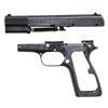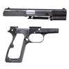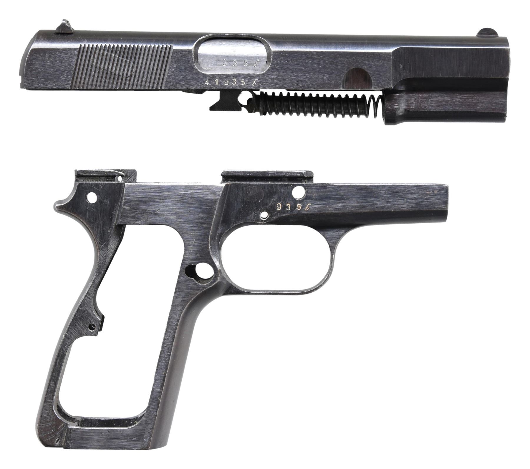 FRAME, SLIDE, & BARREL. Cal. 9mm Luger. S# 935b. Bbl. 4 5/8". High Power semi-automatic pistol frame, slide, and bbl. mfg. by Fabrique Nationale while under German occupation. The left side of the slide is marked "FABRIQUE NATIONALE D'ARMES DE GUERRE/ HERSTAL - BELGIQUE/ BROWNING'S PATENT DEPOSE", followed by a spurious Eagle/N commercial proof, followed by an eagle firing proof and Eagle/WaA140 proof. Left side of the frame exhibits a spurious Eagle/N commercial proof, followed by an Eagle/WaA140 proof and eagle firing proof, with a spurious Eagle/C police proof marked on the forward trigger guard web. Left side of the bbl. exhibits 2 Eagle/WaA140 proofs. Metal components exhibit a blued finish overall, save for on the bbl., which is polished in-the-white. Frame is stripped. Bbl. retains its recoil spring and guide. Matching numbers are present on the frame and bbl. Slide is mismatched (S# 41935b). CONDITION: metal components retain the majority of their original arsenal blue finish, exhibiting some light to mild wear (primarily on edges), scattered superficial handling marks, and scattered spots of light surface oxidation overall. Bore is bright, exhibiting consistent light to mild pitting, while retaining well defined rifling throughout. (25-467/MLW). MODERN. $300-500.