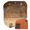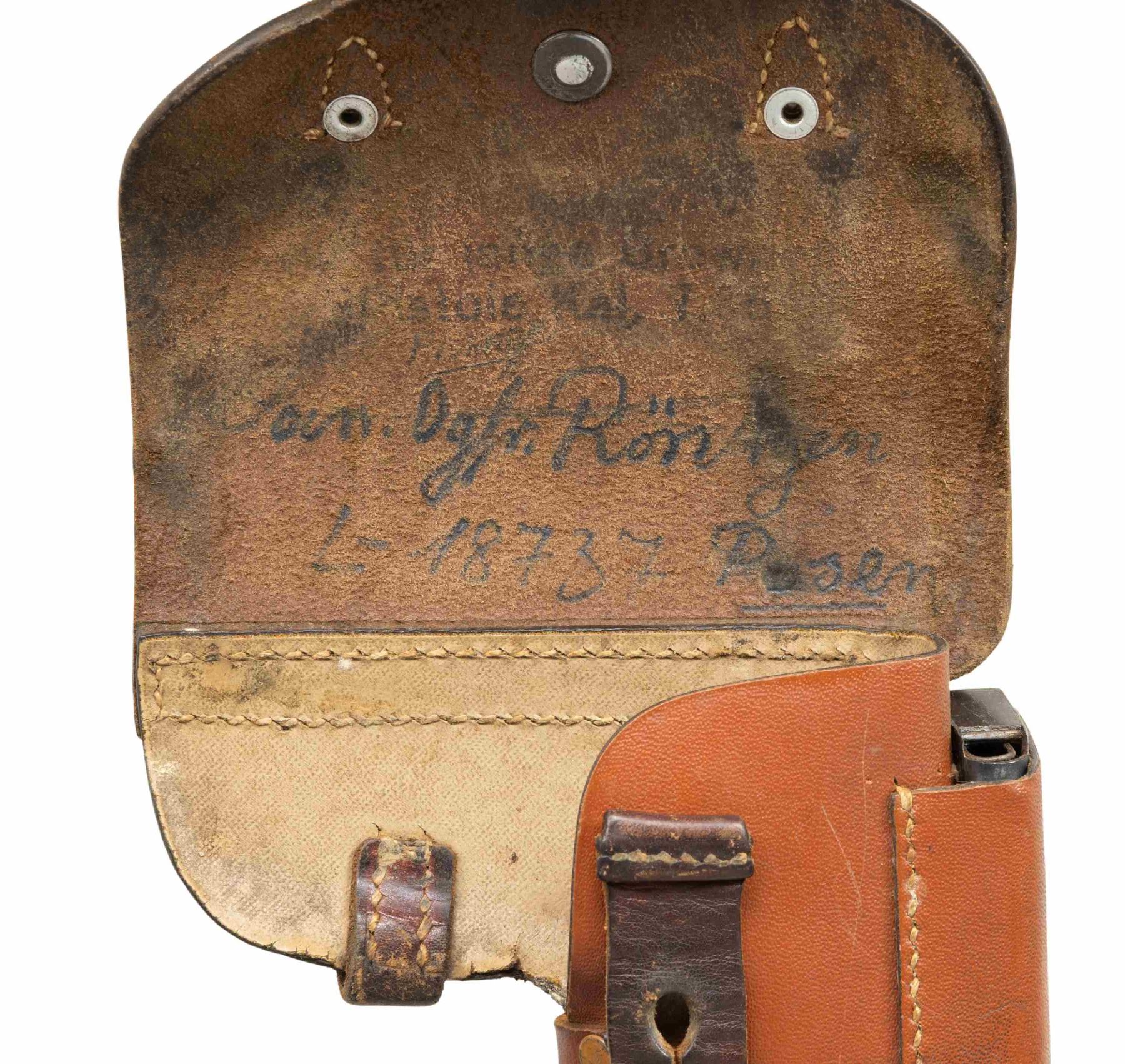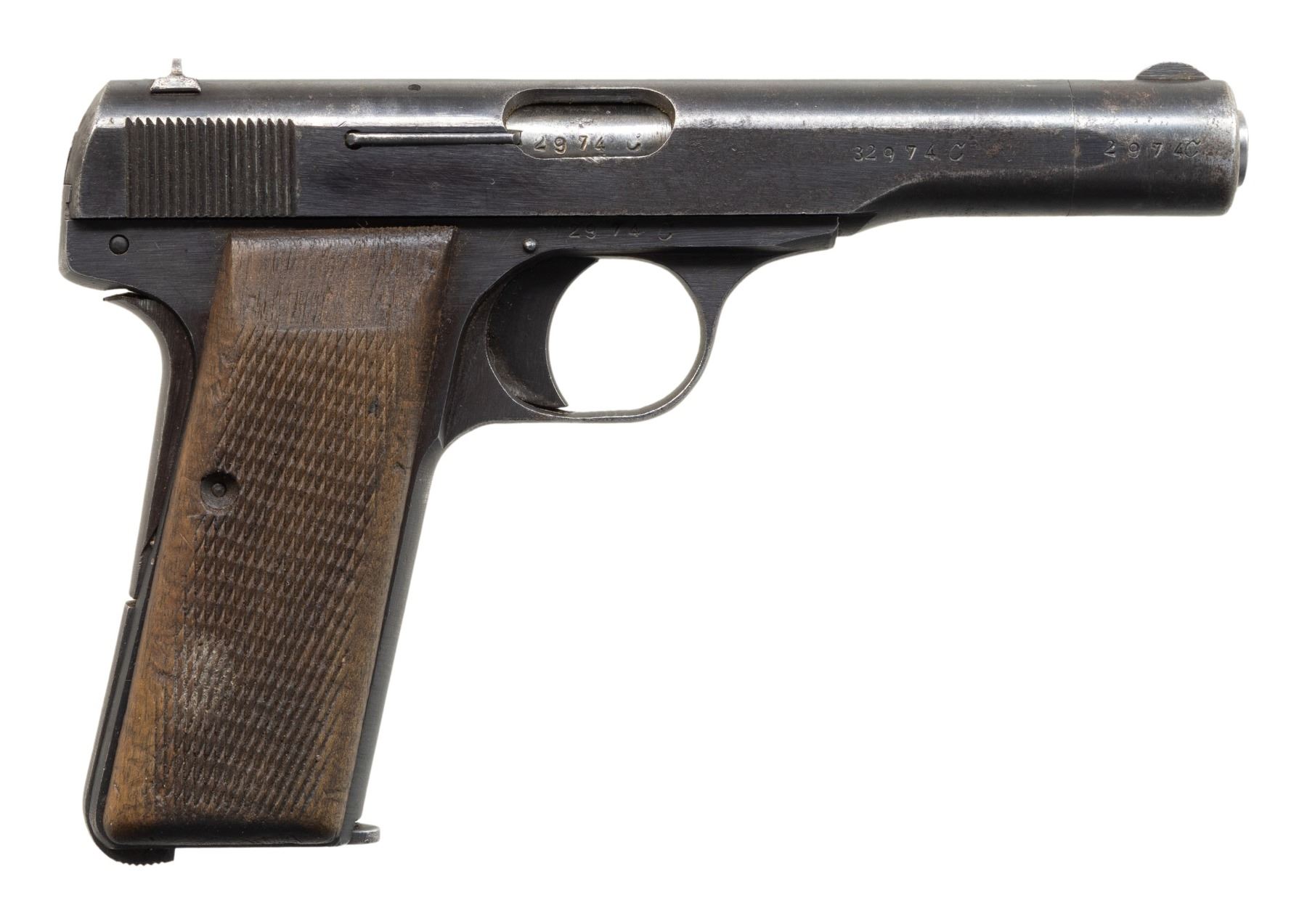 SEMI-AUTOMATIC PISTOL WITH HOLSTER. Cal. 7.65mm. S# 32974C. Bbl. 4 7/16". Model 1922 semi-automatic pistol mfg. by Fabrique Nationale while under German occupation between January to August of 1944. Left side of the slide is marked "FABRIQUE NATIONALE D'ARMES DE GUERRE HERSTAL BELGIQUE/ BROWNING'S PATENT DEPOSE", along with an "(H)" (Heer), eagle firing proof, and 2 Eagle/WaA140 proofs. Metal components exhibit a blue finish overall, save for on the bbl., which is polished in-the-white. Frame is mounted with 2-piece checkered wood grips. Standard fixed half-moon blade front sight on slide extension and dovetailed V-notch rear sight. Slide exhibits the full S# "32974C", with the slide extension, bbl., and frame matching via "2974C". MAGS: x2 blued steel 9-rd. mags. Spare mags. floorplate has been clipped at the toe. UNATTACHED ACCESSORIES: late war German holster comprised of Prestoff with a brown leather closure flap and strap. Interior of closure flap exhibits illegible factory markings above a handwritten name and # in black ink. Rear of closure flap is stamped with the AKAH logo along the left side. CONDITION: metal components retain good amounts of their original arsenal blue finish, exhibiting areas of wear and thinning fading to gray patina, with scattered spots and patches of dark surface oxidation present overall. Mirror bore, retaining well defined rifling throughout. Grips show some smoothing and some superficial handling marks, but otherwise remain sound. Holster shows general overall wear, with the leather remaining malleable and exhibiting some small spots of crazing. (25-6159/MLW). CURIO. $500-800.