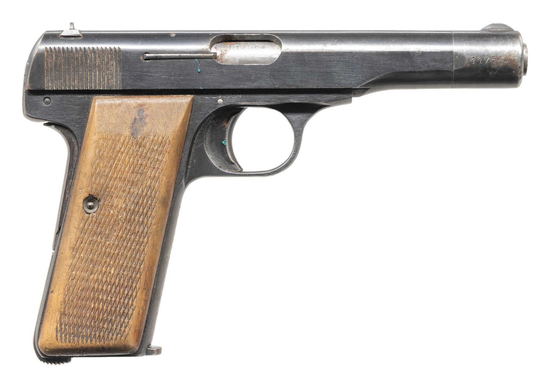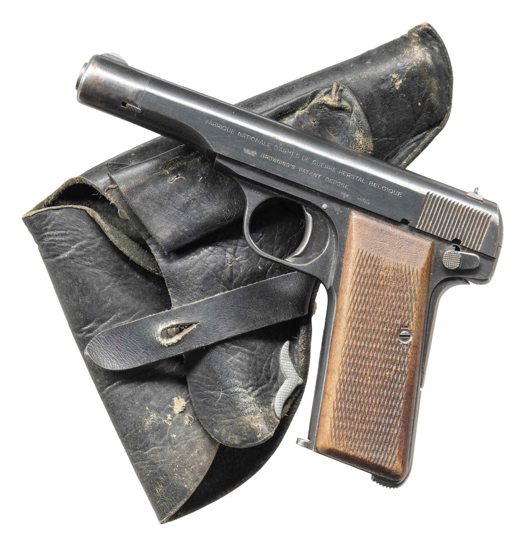 SEMI-AUTOMATIC PISTOL WITH HOSLTER. Cal. 7.65mm. S# 117564. Bbl. 4 7/16". Model 1922 semi-automatic pistol mfg. by Fabrique Nationale while under German occupation during WWII. Left side of the slide is marked "FABRIQUE NATIONALE D'ARMES DE GUERRE HERSTAL BELGIQUE/ BROWNING'S PATENT DEPOSE" above 2 Eagle/WaA140 proofs and an eagle firing proof. Left side of frame is marked with an Eagle/WaA140 proof and eagle firing proof, with 2 Eagle/WaA140 proofs marked on the bbl. Front grip strap is electro-penciled "150228207 Conn.". Metal components exhibit a blue finish overall, save for on the bbl., which is polished in-the-white. Frame is mounted with 2-piece checkered wood grips. Fixed half-moon blade front sight mounted on slide extension, with dovetailed V-notch rear sight on slide. All serialized parts are matching and include the frame, slide (interior), slide extension, as well as the bbl. MAGS: 1 9-rd. stamped with an Eagle/WaA140 proof on the spine. UNATTACHED ACCESSORIES: unmarked black leather holster with period German military pin. CONDITION: metal components retain large amounts to the majority of their original arsenal blue finish, exhibiting some areas of wear fading to gray patina (most notably on slide extension), mild edge wear, as well as scattered spots of light surface oxidation overall. Near mirror bore, exhibiting a couple of spots of light pitting, while retaining well defined rifling throughout. Proper manual mechanics. Grips show some marks and minor impressions from handling and storage, but otherwise remain sturdy and serviceable. Holster remains malleable, exhibiting general overall wear, with scattered spots of age related crazing. (25-5628/MLW). CURIO. $500-700.
