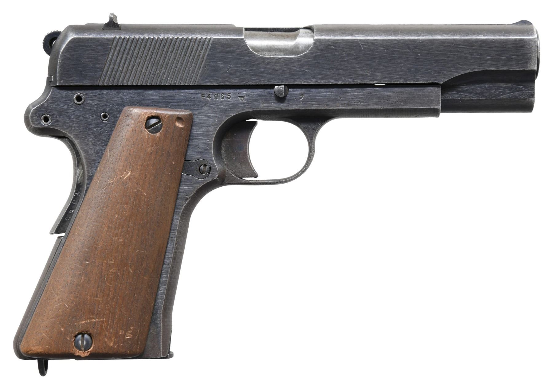 PISTOL. Cal. 9mm Luger. S# F4065. Bbl. 4 5/8". Vis.35 semi-automatic pistol mfg. by Radom while under German occupation during World War II. The left side of the slide is marked with a Radom Eagle/77 proof, followed by "F.B.RADOM VIS Mod.35.Pat.Nr.15567", an eagle firing proof, as well as a Steyr Eagle/623 proof (indicating final assembly at Steyr). Left and right side of frame exhibit a Radom Eagle/77 proof, with the left side of the bbl. lug exhibiting an Eagle/623 proof. Metal components exhibit a blue finish overall, save for on the bbl., which is polished in-the-white. Frame is mounted with 2-piece smooth wood grips. Slide features a matte rib, with a fixed blade front sight and dovetailed V-notch rear sight. All serialized parts are matching and include the frame, grip safety, slide (interior), and bbl. MAGS: 1 blued 8-rd. mag., marked with a Steyr Warsaw plant Eagle/189 proof on the floorplate. CONDITION: metal components retain the majority of their original arsenal blue finish, exhibiting some light to mild wear and thinning (primarily on edges), scattered superficial handling marks, as well as spots/areas of light to mild surface oxidation overall. Mirror bore, exhibiting some spots of light pitting, while retaining well defined rifling throughout. Grips show scattered superficial handling marks and a few impressions from handling and storage, but otherwise remain sturdy and serviceable. PROVENANCE: The Estate Collection of Charles Wagner. (25-460/MLW). CURIO. $1,000-2,000.