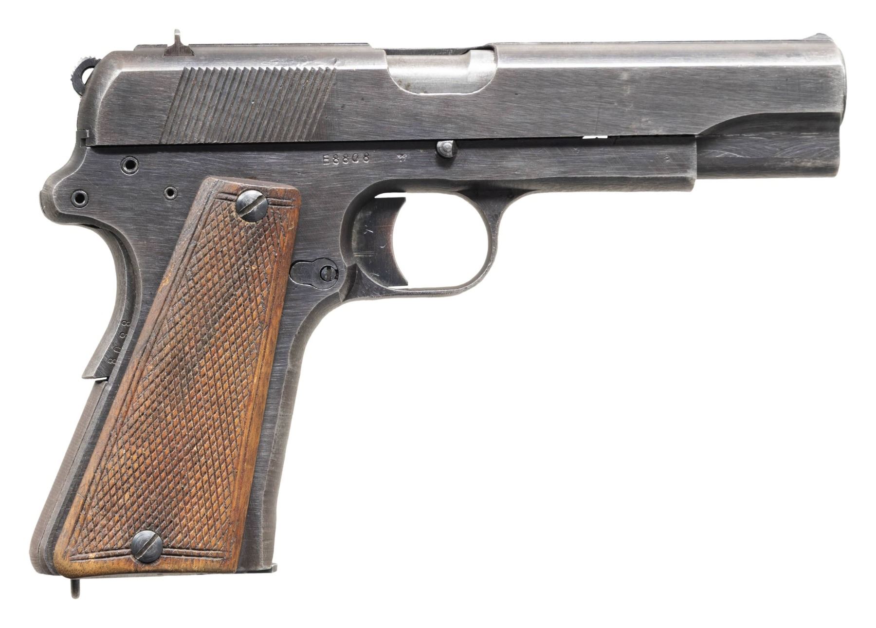 PISTOL. Cal. 9mm Luger. S# E8808. Bbl. 4 9/16". Vis.35 (German designation: "P.35(p)") semi-automatic pistol mfg. in Poland at the Radom arsenal and assembled at Steyr while under German occupation during WWII. The left side of the slide is marked "F.B.RADOM VIS Mod.35.Pat.Nr.15567", followed by an eagle firing proof, above a Radom Eagle/77 (repeated on both sides of frame) and a Steyr Eagle/WaA623 proof (repeated on left side of bbl. lug). Metal components exhibit a blue finish overall, save for on the bbl. which is polished in-the-white. Frame is mounted with 2-piece checkered wood Ersatz grips (similar example shown on page 31 of "VIS Radom" by William J. York). Slide features a knurled matte rib, integral blade front sight, dovetailed V-notch rear sight, and decocking lever. All serialized parts are matching and include the frame, grip safety (right), slide (interior), as well as the bbl. MAGS: 1 blued steel 8-rd. mag. marked with an Eagle/189 on the floorplate. CONDITION: metal components retain large amounts to the majority of their original arsenal blue finish, exhibiting some areas of wear and thinning fading to gray patina (primarily on edges), some superficial handling marks, as well as some small scattered spots of light surface oxidation. Left side of slide exhibits some splotchy spots / small patches of finish loss. Grips straps exhibit wear and thinning fading to gray patina. Bore is relatively bright, exhibiting consistent light to mild pitting, while retaining well defined rifling throughout. Proper manual mechanics to include the decocking lever. Grips are good, with the left panel exhibiting mild to moderate wear as well as a chip at the bottom of the panel at the screw slot. (25-6559/MLW). CURIO. $1,200-1,800.