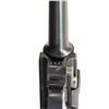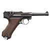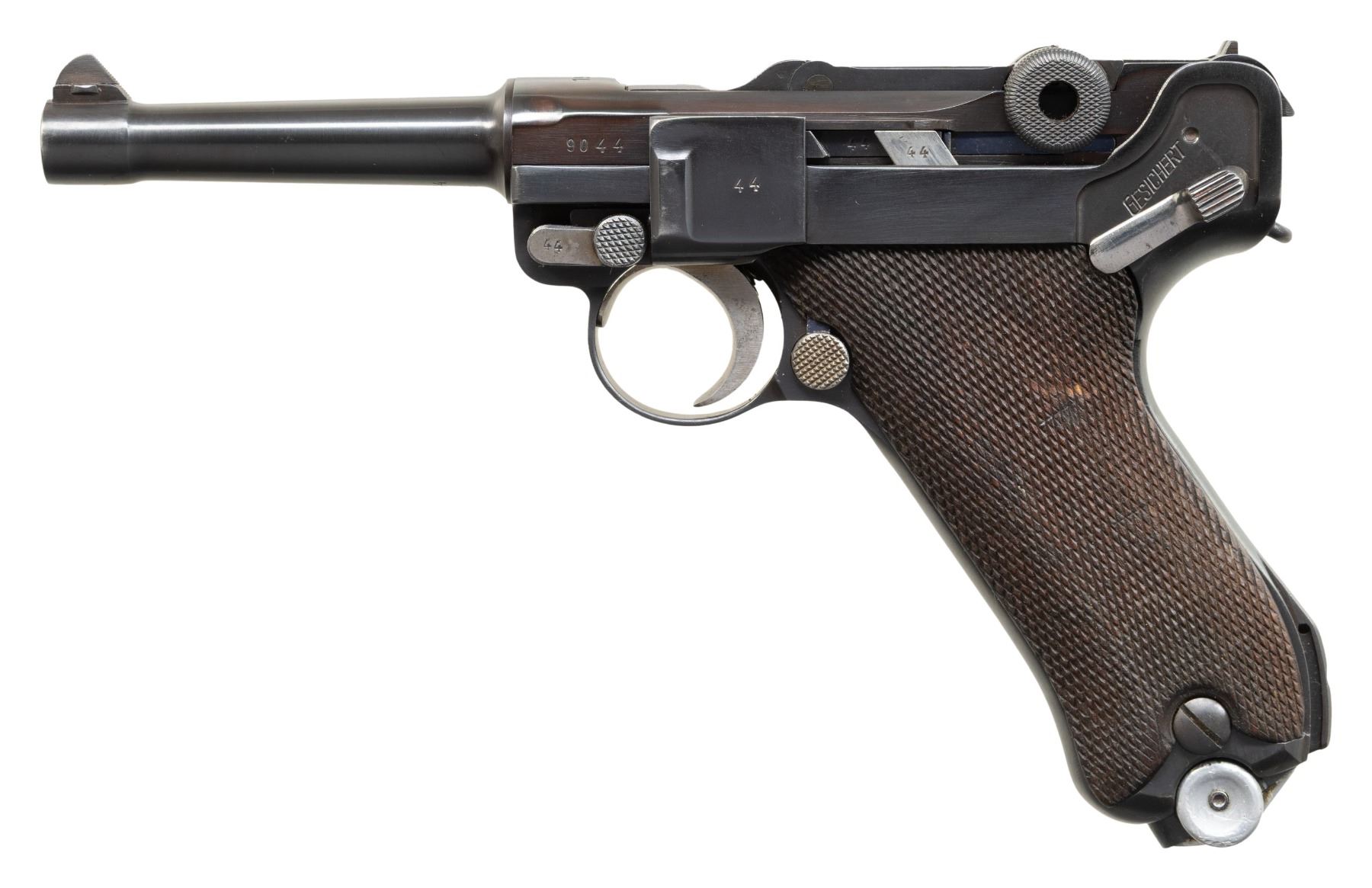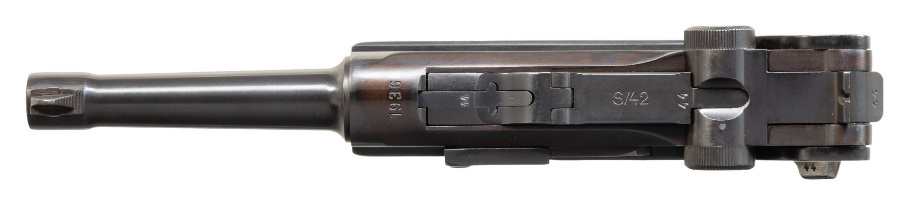 LUGER SEMI-AUTOMATIC PISTOL. Cal. 9mm Luger. S# 9044o. Bbl. 4". P.08 Luger semi-automatic pistol mfg. by Mauser in 1936. The bbl. extension is marked with the 4-digit year of mfg. "1936" over the chamber, with Mauser Eagle/63 proofs and a droop eagle firing proof marked on the right. Toggle is marked with Mauser's "S/42" mfg. code. Metal components exhibit a nicely reapplied blue finish overall, with some small parts being strawed. Frame is mounted with 2-piece checkered wood grips. Standard dovetailed blade front sight and fixed V-notch rear sight. Nearly all serialized parts are matching and include the frame, takedown lever, sideplate, trigger, safety lever & bar, hold-open latch, bbl., bbl. extension, trigger bar, breechblock, extractor, firing pin, as well as the toggles. Rear toggle pin is mismatched via "60" (or "09"). Grips are unnumbered and unproofed. MAGS: 1 blued steel "fxo" marked mag., with unmarked (scrubbed) aluminum plug. CONDITION: metal components retain the vast majority of their reapplied blue finish, exhibiting a few spots of light edge wear fading to gray patina, some scattered superficial handling marks, as well as some spots of light pitting beneath the finish. Strawed parts have been cleaned, retaining traces of their finish and showing some light pitting overall. Bore exhibits consistent light pitting, while retaining good, albeit worn rifling throughout. Proper manual mechanics. Grips show mild smoothing, as well as scattered nicks and small impressions from handling and storage, but otherwise remain sound. PROVENANCE: Estate Collection of John "Jack" Dhooghe. (25-5516/MLW). CURIO. $800-1,200.