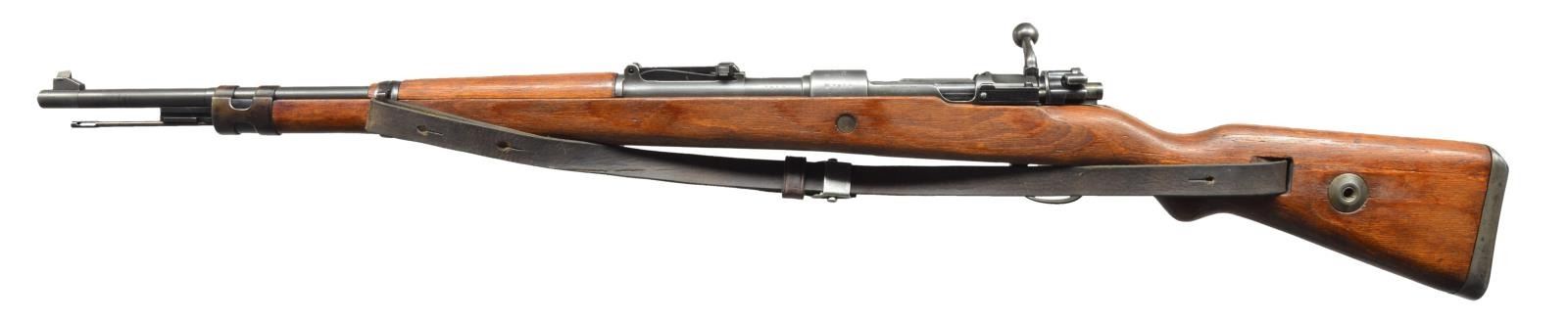 RIFLE TO 98 K CONFIGURATION. Cal. 8mm Mauser. S# 3918. Bbl. 23 9/16". Numbers match on receiver & bbl. Scarce conversion of "SIMPSON CO & SUHL" 1925 dated rifle to K98 configuration. Rifle given later type laminated wood stock w/ cup type buttplate & steel takedown hole. Balance of furniture is milled. Front sight has been sleeved onto muzzle. Bbl. has several shallow grooves between upper band & front sight. Receiver rail marked on left side "GEW 98". Receiver ring marked on left side w/ "X" & marked on top "SIMPSON & CO" "SUHL" "1925". Marked on right side w/ 3 Wiemar "droop winged" eagles. One is "6" & 2 are "14". Replacement bolt w/ turned down handle has all matching numbers. Follower allows bolt to close on empty mag. Tangent rear sight graduated to 2000m. Inverted "V" front sight. Original leather sling. CONDITION: duffle cut stock set has replaced wood between upper & lower bands. Stock set has been lightly cleaned obscuring markings, leaving stock w/ very nice appearance w/ light wear & handling marks. Stock has 2 1/2" fine crack behind receiver tang & tiny gouge on left side of grip. Metal has been cleaned w/ lightly enhanced finish. Receiver shows scattered very fine pitting. Metal has thinning blue w/ light wear & handling marks. Fair bore w/ lightly worn lands turning dark in the grooves. (21-1005/RW). CURIO. $700-900.