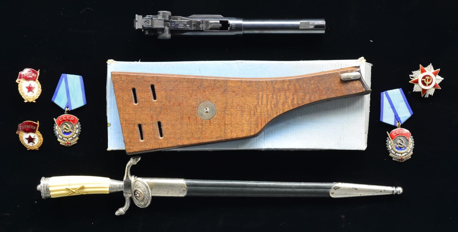 This widely varied lot includes a 1913 dated Erfurt receiver w/ 5” bbl., cal. 9mm Luger. / A reproduction Navy Luger shoulder stock in box. / A WWII German shooting association dagger marked, “ORIGINAL (squirrel) EICKHORN SOLINGEN”. / A Walther marked PPK grip. / 2 Numbered Russian enameled Order of the Red Banner of Labor medals. / 1 Numbered Russian screw back enameled Order of the Patriotic War medal. / 2 Russian Red Army Guards screw back badges. CONDITION: receiver & bbl. are very good. Luger stock shows only storage wear. Dagger has a drying crack in the handle. 1 Medal has very minor enamel damage. (02-13540-4/BF). $600-900.