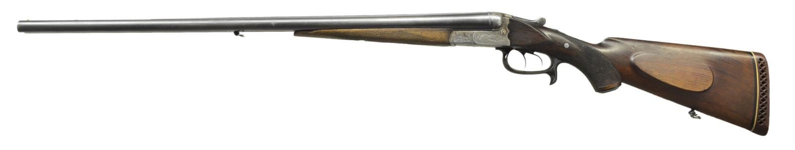 Cal. 16 Ga., 2 3/4". S# 198444 (1958). Bbls. 27.5" have brass bead, raised rib and sling swivel. Full and Mod chokes. The water tables have August 1958 German Nitro proofs along with refurbish stamp on lug dated May 1969. Case colored receiver decorated with vine type scroll along with decorative borders and geometric patterns. Action features double triggers, cross bolt safety, cocking indicators, ejectors, and non automatic safety. Horn finger curled trigger guard. Checkered splinter forearm and pistol grip walnut stock sling swivel and grip cap. LOP: 13.75" to Pachmayr White line pad. UNATTACHED ACCESSORIES: with black plastic case. CONDITION: good refurbished blue finish showing fading with age, scratches, and pinprick oxidation throughout. Action shows visible case colors in protected areas, balance gray silver w/ patina. Sanded and refinished wood has smooth checkering and impressions throughout. Forearm has worn finish with chip on right side tip. Stock has professionally done screw reinforce repair at wrist. Good shiny bores with fouling. PROVENANCE: "Save the Fine Guns". T&G German Gun Imports, bringing fine German guns to a more appreciative market. (22-5146/MD). CURIO. $300-$500.