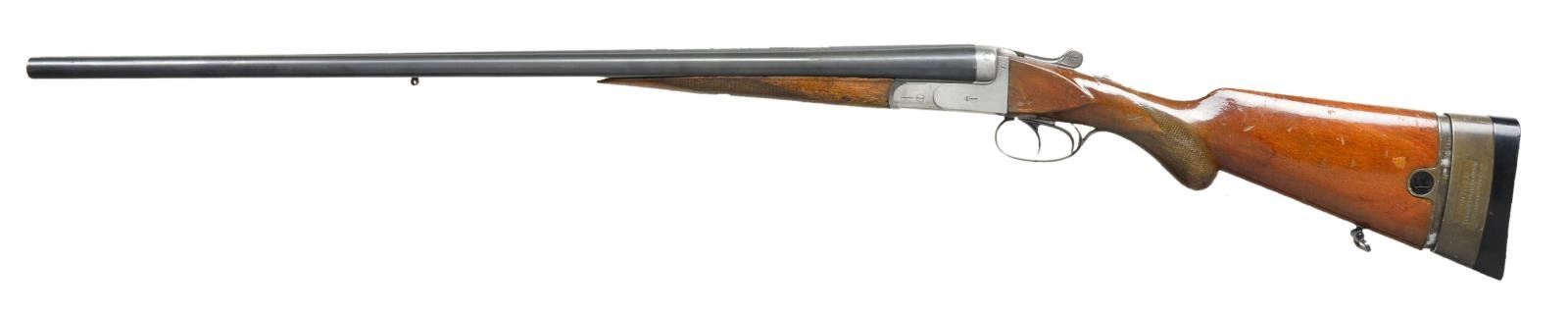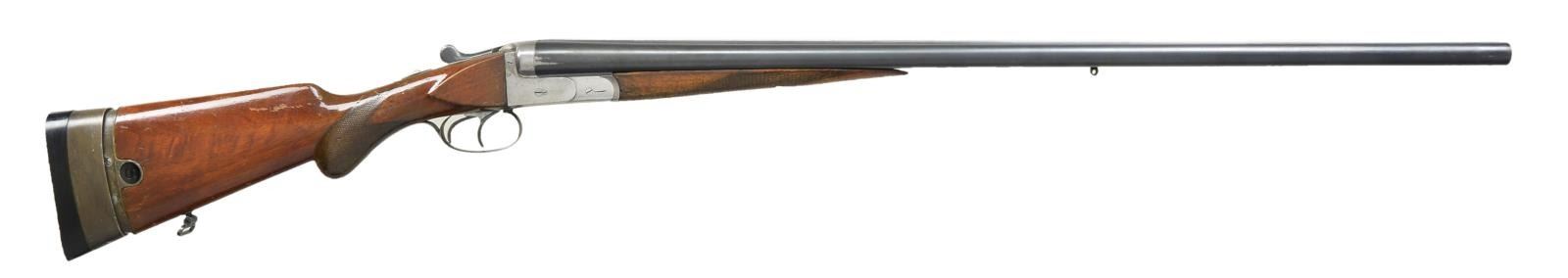 Cal. 16 Ga. S# 5276. Bbls. 29 3/4" matted solid rib w/ front bead. Chambers 2 9/16" & choked “FULL” & “IC”. Matching S#s, Dbl. triggers & extractors. Frame has been aggressively cleaned w/ no visible markings. Bottom of bbls. “RW” marked; possible WINKLER mfg. Checkered splinter forend & round knob pistol grip buttstock w/ sling swivel & stud on bbls. LOP: to ENGELS recoil plate is 13 1/4" & 14 1/4". Importer marked. CONDITION: bbls. retain about 90% of a reblued finish w/ pinprick pitting & fine rust spots. Frame cleaned & polished to bare metal w/pitting & numerous scratches. Stock set sanded & heavy added coat of finish now chipping. Bores are bright & polished w/ fine scattered pits & light dents. PROVENANCE: "Save the Fine Guns". T&G German Gun Imports, bringing fine German guns to a more appreciative market. (22-5016/CW). CURIO. $300-500.