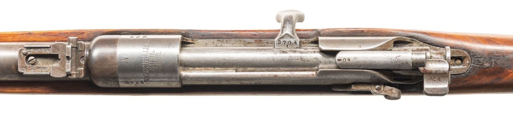 Cal. 8x57. S# 8704f. Bbl. 18". Replacement brass bead front sight with ground ears. Ladder rear sight graduated to 1200m. Bolt head is unnumbered & action screws are later replacements but all other visible numbers are matching to receiver. Receiver ring has "VC SCHILLING" & "S" markings with 1892 date. Nosecap has Bavarian Chevauleger "B.2.Ch.25" unit marking. Receiver, bolt & buttplate are all "In-the-white". Balance of other parts are blued. Walnut stock set with left side sling provisions. CONDITION: sanded stock has added finish with recoil lug & buttplate being proud of wood, small hole on left of butt behind sling cut, a flexing 3" crack on left front of forend, a couple repaired cracks, a 4" chip on right front of forend, scattered staining, dings & handling marks. Metal has an overall cleaned appearance with edge wear, traces of bluing, oxidation, areas turning gray, handling marks & some dings. Action functions properly when hand cycled. Bore has some frosting but strong rifling. (01-26324/MJC). ANTIQUE. $300-500.