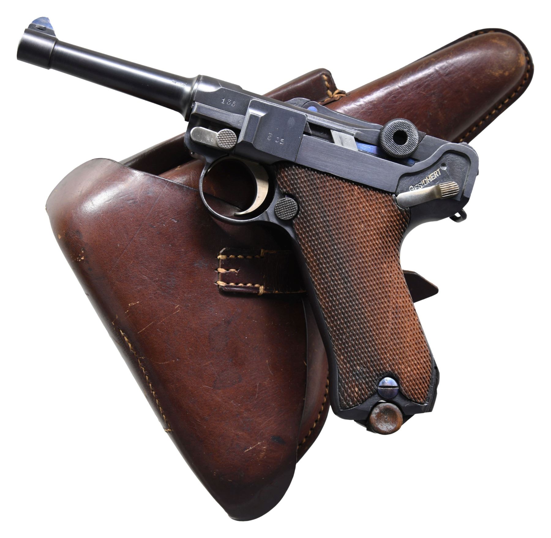 SEMI-AUTOMATIC PISTOL WITH HOLSTER. Cal. 7.65x21mm Parabellum. S# 135o. Bbl. 4". P.08 Luger semi-automatic pistol mfg. by Erfurt in 1918 for the Imperial German military. The bbl. extension is marked "1918" over the chamber, with Erfurt arsenal proofs marked on the right. Frame and various other small parts and components exhibit Erfurt arsenal proofs. Underside of the bbl. is marked with the S# (minus the suffix) above a diminutive "7.65". Metal components exhibit an extremely a professionally reapplied blue finish. Strawed parts including the takedown lever, trigger, mag. release button, safety lever, and ejector exhibit a reheated finish. Grip screws and blade front sight exhibit a reapplied nitre blue finish. Frame is mounted with 2-piece aftermarket checkered wood grips. All serialized parts are matching, and appear to have been renumbered at one time. MAGS: 1 non-matching wood bottom 8-rd. UNATTACHED ACCESSORIES: brown leather holster. Interior of closure flap exhibits an illegible boxed ink stamp, with a handwritten "S." in black ink on the rear between the belt loops. CONDITION: excellent, as professionally restored, with metal components retaining bountiful amounts of their reapplied finishes overall, exhibiting some spots of light edge wear, as well as some areas of very light pitting beneath the finish. Brilliant mirror bore, retaining well defined rifling throughout. Grips are very good, showing some light smoothing, as well as some scattered nicks and marks to the diamonds. Wood bottom on mag. is broken, with all pieces remaining present. Holster remains malleable, exhibiting some wear, some scattered handling marks, as well as a few areas of light age related cracking and crazing. A very attractive, professionally restored Erfurt P.08. (24-6894/MLW). CURIO. $1,000-1,500.