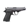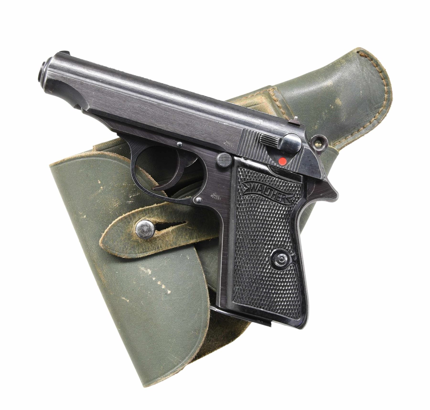 MODEL PP SEMI-AUTOMATIC PISTOL WITH HOLSTER. Cal. 7.65mm. S# 272522P. Bbl. 3 7/8". Model PP semi-automatic pistol mfg. by Walther circa. 1942. Left side of the slide is marked with the Walther banner logo, followed by markings stipulating Walther's mfg. information, as well as the model and cal. designations. Left side of slide and frame both exhibit an Eagle/WaA359 proof. Right side of slide, chamber, and bbl. (at muzzle) exhibit a horizontal German Eagle/N commercial nitro proof. Metal components exhibit a blue finish overall. Frame is mounted with 2-piece Walther banner checkered black plastic grips. Standard blade front sight, with U-notch rear sight. Matching S#s are present on the frame and slide. MAGS: 1 8-rd. UNATTACHED ACCESSORIES: green leather Beretta Model 1935 holster. CONDITION: metal components retain the majority of their original arsenal blue finish, exhibiting some light to mild wear, some scattered superficial handling marks, as well as some scattered spots of light surface oxidation/pitting overall. Grip straps exhibit thinning that shows through to gray patina, with scattered spots of light surface level oxidation and pitting. Very bright bore, exhibiting scattered spots of mild pitting, while retaining well defined rifling throughout. Grips show some scattered superficial marks from handling and storage, but otherwise remain sturdy and serviceable. Holster remains malleable, exhibiting some mild wear and crazing. (24-5590/MLW). CURIO. $800-1,400.