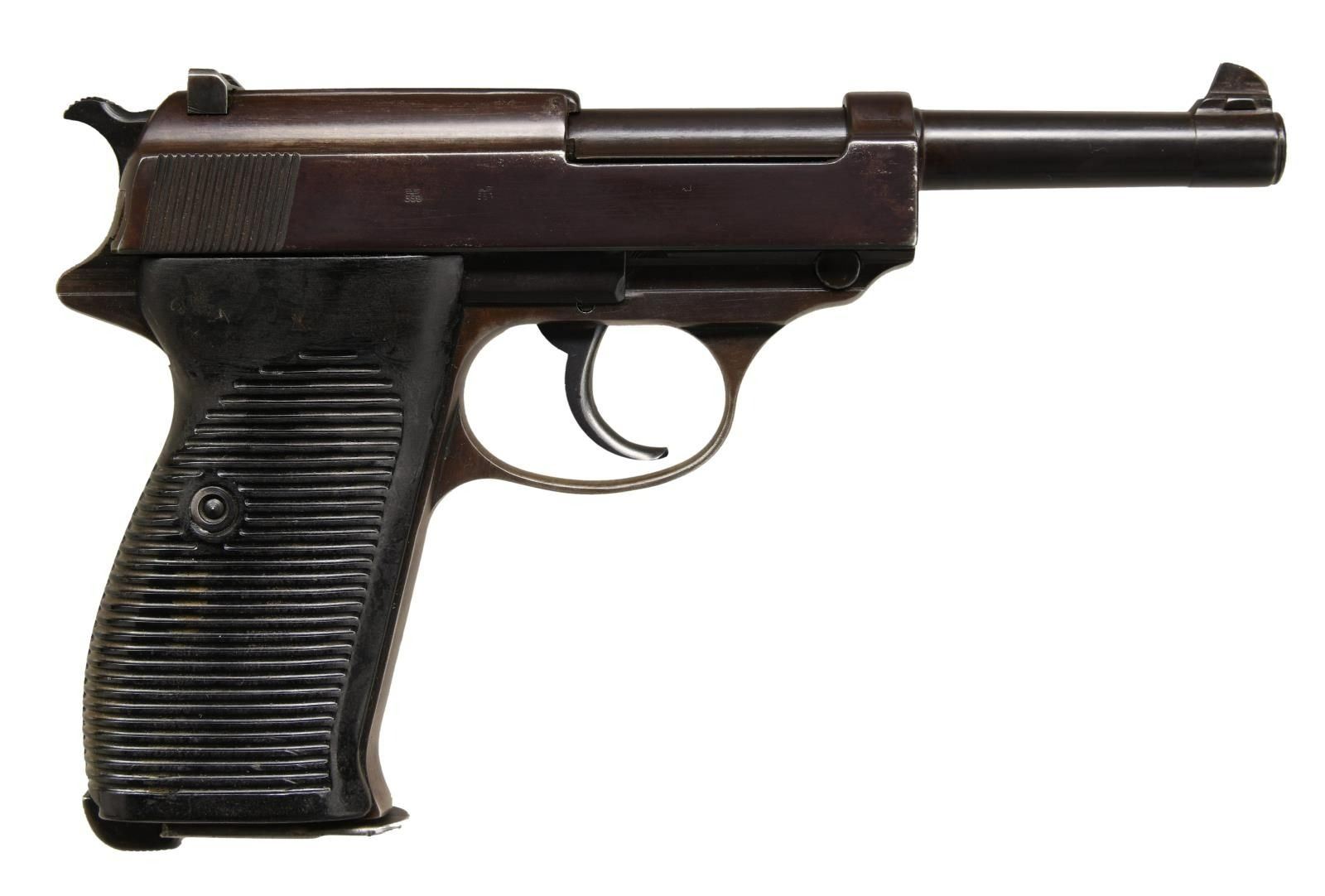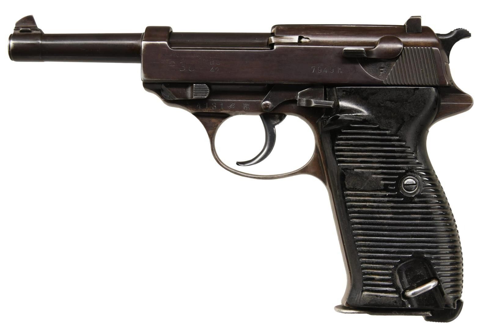 PISTOL. Cal. 9x19mm Parabellum. S# 4131e. Bbl. 4 7/8". P.38 semi-automatic pistol mfg. by Mauser during World War II. The replacement slide is marked "P.38" followed by Walther's mfg. code and (slide) year of mfg. "ac/ 42", and the S#, with Walther Eagle/359 acceptance proofs marked on the right. Frame, bbl., locking block, and mag. exhibit Mauser Eagle/135 acceptance proofs. Slide and bbl. exhibit a reapplied blue finish. Frame is mounted with 2-piece black pressed resin grips. Matching numbers are present on the frame, bbl., and locking block. MAGS: 1 8-rd. CONDITION: frame retains fair amounts of its original arsenal blue finish, exhibiting wear and thinning that shows through to brown and gray patina. Slide and bbl. retain large amounts of their reapplied blue finish, exhibiting some areas of wear and thinning that show through to patina. Bore is bright, as refinished, exhibiting moderate pitting and strong rifling throughout. Grips exhibit scattered marks from handling and storage, but otherwise remain sturdy and serviceable. (23-6234/MLW). CURIO. $300-400.