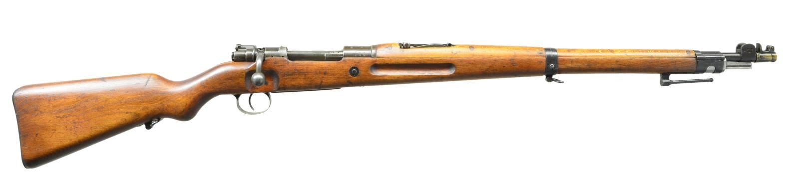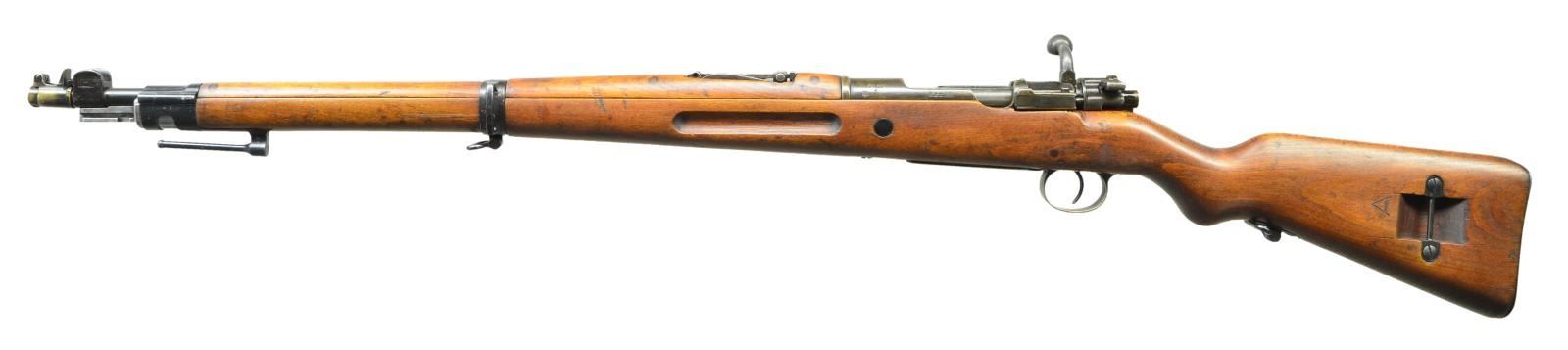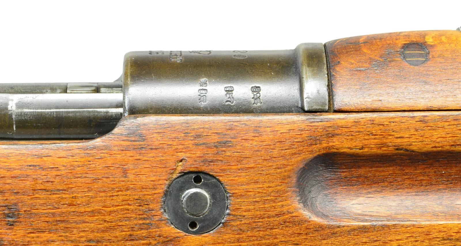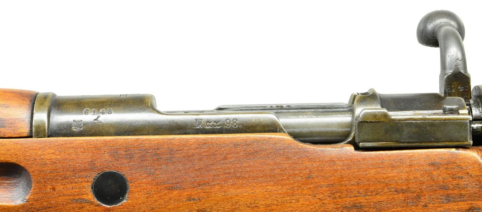 USED IN POLAND. Cal. 8mm Mauser. S# 6148i. Bbl. 23 5/8". All visible numbers match except rear sight spring & bbl. bands. Receiver ring marked on top w/ imperial crown, "ERFURT" & "1925" w/ added "1920" date. Marked on right side w/ imperial proofs & left side w/ Prussian eagle proof. Left receiver rail marked in Gothic "KAR 98". Turn down bolt handle w/ flattened checkered knob. Stock has clearance cut. Receiver bridge has been drilled & tapped w/ 2 holes on the right side for unknown sight. Tangent rear sight graduated to 2,000m. Inverted V front sight w/ protective ears & tab for sight protector. Bayonet bar is present. Rifle was restocked in Poland & has Polish 2 piece stacking rod. Buttstock has grasping grooves. Buttstock marked on left side w/ lg. "A" by sling bar recess. Lower band has loop for side sling & bottom swivel. Buttstock made w/ bottom swivel & swivel bar on left side. Flat type buttplate. No disassembly disk. Handguard & stock have Polish style doweled reinforcement. UNATTACHED ACCESSORIES: brass muzzle protector w/ hinged cap. Marked on forward end "KRANC & EMPICKI". CONDITION: stock set has light wear, staining & moderate handling marks throughout. Has notable sm. shallow cracks in area of sling bar recess & around edge of buttplate notable on the left side. Sm. crack behind receiver tang. Handguard has sm. crack at forward edge of rear sight. Metal has traces of blue turning gray & patina w/ light wear & scattered handling marks. Bbl. bands have notably more blue finish. Good shiny bore w/ lightly worn lands. (22-521/RW). CURIO. $600-900.