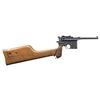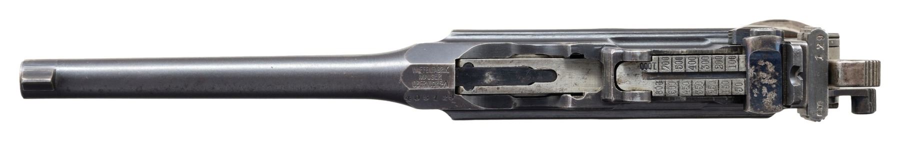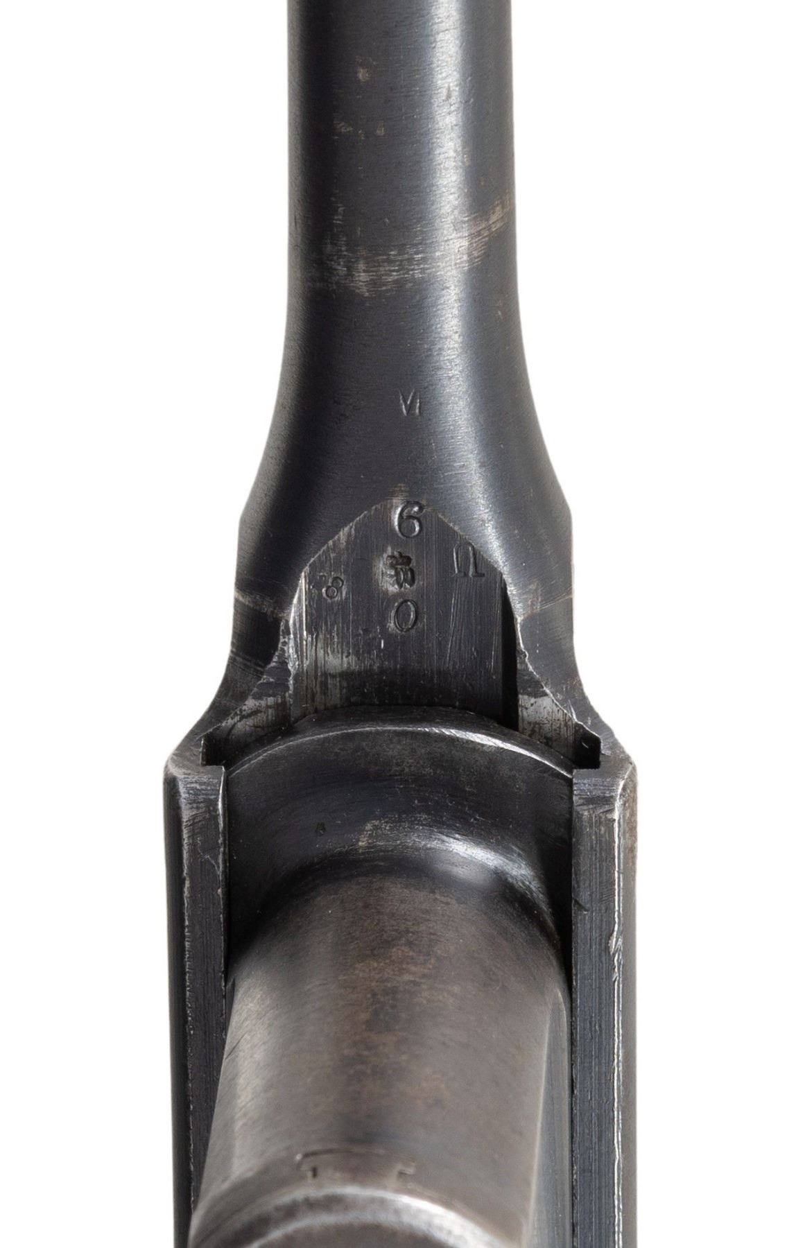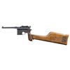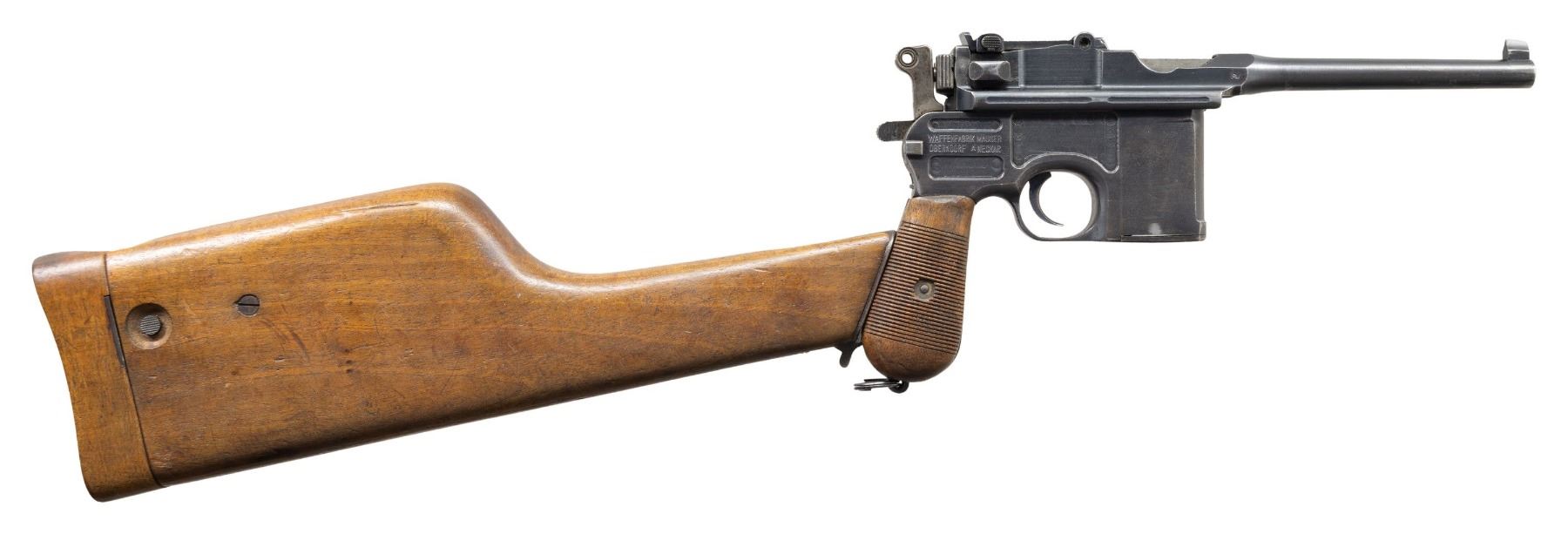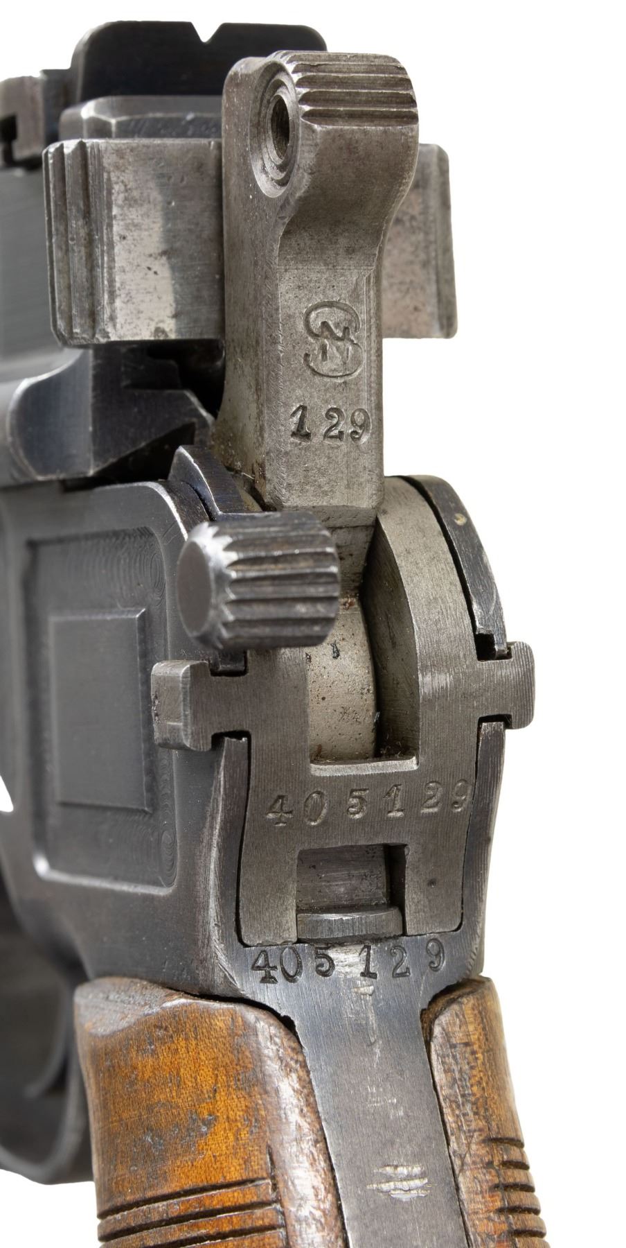 PISTOL. Cal. 7.63mm. S# 405129. Bbl. 5 1/2". C96 semi-automatic pistol mfg. by Mauser during WWI under contract for the Imperial German military. Top flat of the faceted breech is marked with Mauser's 3-line address, with the S# marked on the left quarter flat, a double crowned "U" commercial proof on the left flat, and an Imperial German military acceptance proof marked on the right flat. Right side of the frame is marked with Mauser's 2-line address. Frame, floorplate, and bbl./bbl. extension exhibit a rust blue finish, with the trigger, safety lever, rear sight slide, and bolt stop exhibiting a nitre blue finish. Bolt and locking block are polished in-the-white. Frame is mounted with 2-piece grooved wood grips and features a lanyard ring on the butt. Fixed blade front sight with tangent V-notch rear sight graduated 50-1000. All serialized parts are matching and include the frame, floorplate, sub-frame, hammer, sear, locking block, bbl./bbl. extension, bolt, and bolt stop. Grips are unnumbered. UNATTACHED ACCESSORIES: Imperially proofed non-matching (S# "719") wood stock/holster. CONDITION: metal components retain the majority of their original blue finish, exhibiting some areas of wear and thinning that are fading to gray patina, some superficial handling marks and scratches, as well as light surface oxidation overall. Nitre blue parts show wear and thinning to gray patina in contract areas, with the rear sight slide exhibiting some light pitting and finish loss. Bore is bright, exhibiting light pitting and some scattered spots of mild pitting, while retaining strong rifling throughout. Proper manual mechanics. Grips show some scattered marks and impressions, but otherwise remain sound. Stock/holster shows numerous scattered marks and impressions from handling and storage, but otherwise remains sturdy and serviceable. Metal fittings show varying degrees of surface oxidation. (25-5268/MLW). CURIO. $1,750-2,500.