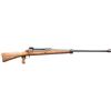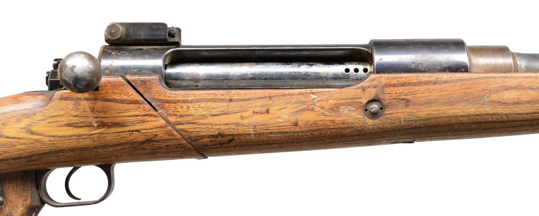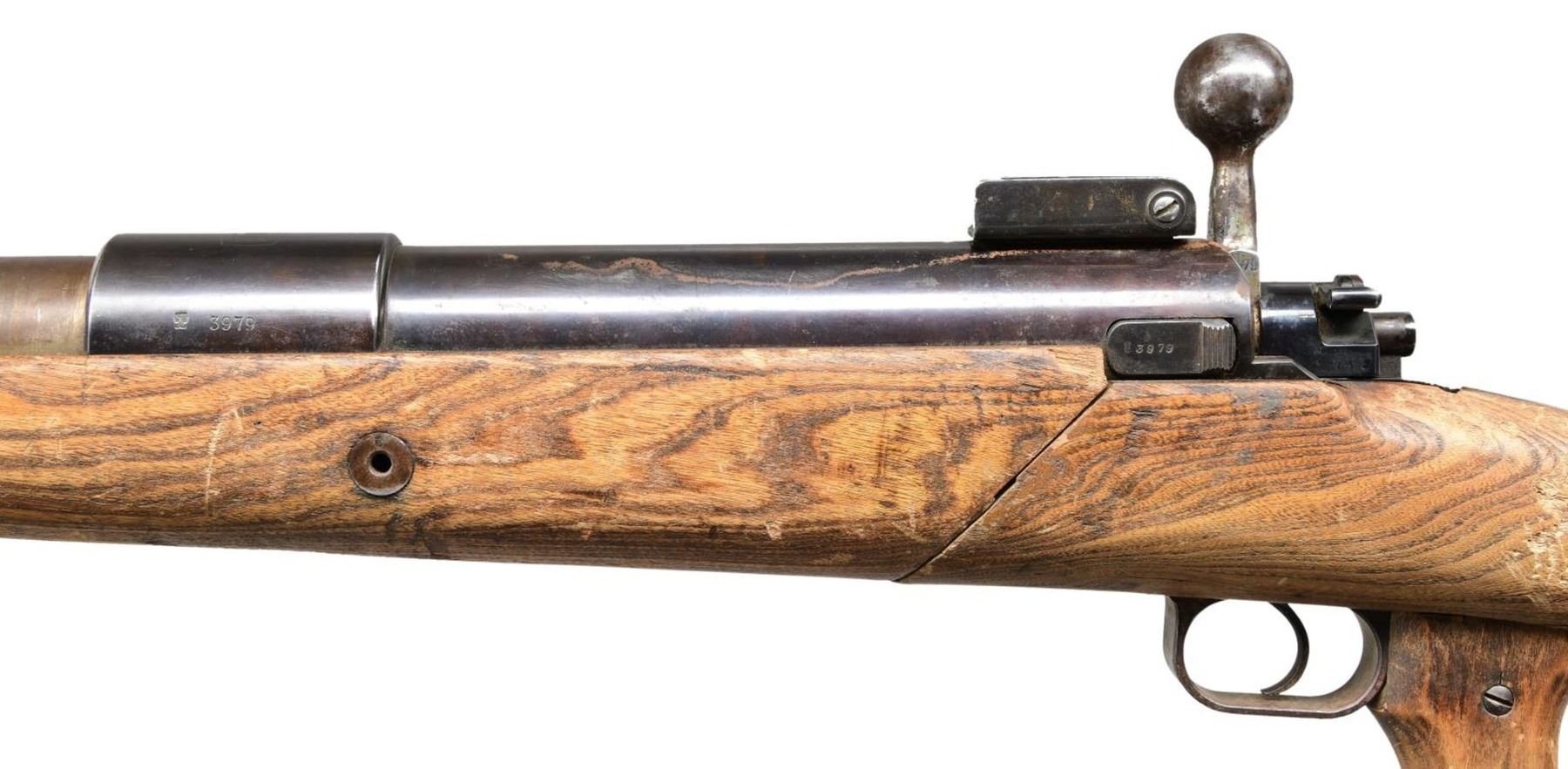 SHOT BOLT ACTION ANTI-TANK RIFLE CONVERTED TO 50 BMG. Cal. 50 BMG. S# 3979. Numbers match on receiver, bolt assembly, trigger guard, trigger, & bolt stop. Bbl. 36 1/4". Ladder aperture rear sight graduated to 1500 yards. Post front sight. The receiver ring is marked on top w/ the Mauser banner & "1918" plus is marked on both sides w/ imperial proofs. This interesting lg. bore rifle was custom made using a Mauser Model 1918 Tank Gewehr which was chambered originally in 13x92SR. The Tank Gewehr developed for the German army late in WWI was reasonably successful in penetrating the armor of the early allied tanks. The 13mm cartridge is a scarce collectible in its own right and has lead to some of these rifles being to converted to the U.S. 50 cal. machine gun cartridge which is much more readily available. The original 13mm bbl. has been replaced by a bbl. converted from a U.S. 50 cal. machine gun bbl. This bbl. retains its original number D7162012 which may be the drawing number & also has a sm. U.S. flaming bomb ordnance acceptance mark. The bbl. is numbered L2J729 as well. The installation was accomplished by using a bushing to increase the diameter of the machine gun bbl. to fit the threads in the Mauser receiver. The bushing protrudes approx. 1 3/4" forward of the receiver ring. The bolt face and extractor appear to be unmodified and the 50 BMG cartridge does not extract properly. The firing mechanism appears to function correctly. The firing pin appears unmodified. The stock has an unusual duffle cut extending upward and rearward diagonally from the front guard screw separating the stock into 2 halves. There has been an attempt to repair the joint but it is separated. The buttstock has the usual 2 piece dovetailed construction common to these rifles. The original stock markings at the belly are illegible. The bbl. band has been arc welded at the rear but the bbl. shows no evidence of welding in the bbl. band area. The bbl. band retaining pin is not present. CONDITION: the stock is well worn w/ staining, gouges & handling marks. There are numerous missing chips around the forend tip & the forward receiver ring screw. The grip has notable gouges on the top & left side. The joint in buttstock has an open appearance and the butt area which was made w/out a buttplate has considerable checking. Approx. 1 1/2" crack behind receiver tang & two 1 1/2" cracks behind the trigger guard. The forend has a lg. crack extending rearward approx. 7" at the bottom. There are 2 carved notches at the bottom of the forend behind the bbl. band. The pistol grip has two approx. 3" cracks at the sides and notable checking at the top w/ wear & staining. The receiver & trigger guard have been blued & have thinning, wear & areas of light oxidation. The bolt has been polished but is returning to a gray appearance. The bbl. retains 50% of its original parkerized finish w/ thinning & wear. The front sight base & ramp have a flaking black finish. The screw extending through the bottom of the stock into the receiver ring interferes with the bolt when fully seated. The trigger guard is equipped w/ 3 screws. The rear most screw extends only into the wood but is not present. Bore has degree of shine w/ strong lands & appearance of frosting in grooves. (24-776/RW). MODERN. $3,500-5,500.