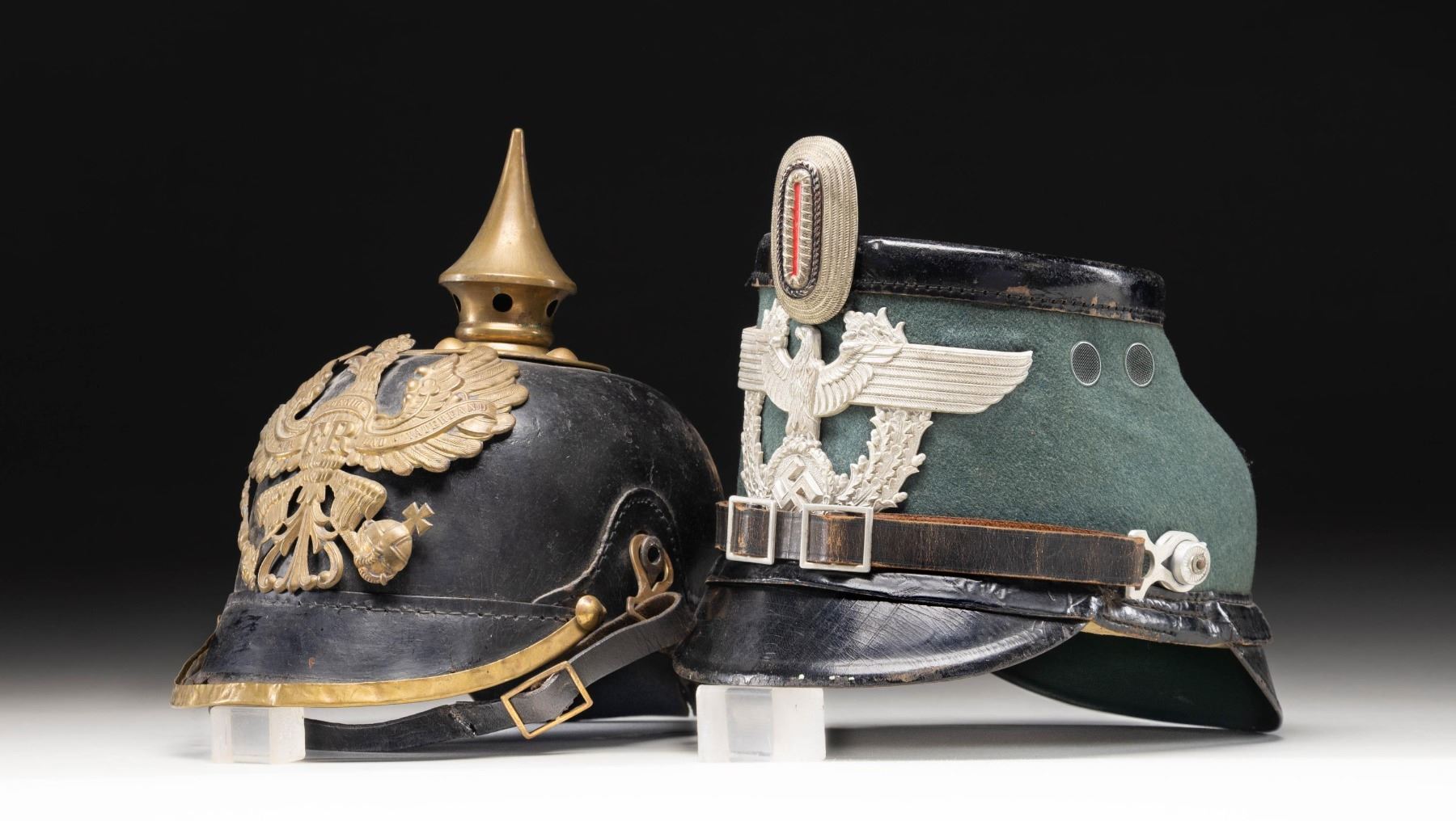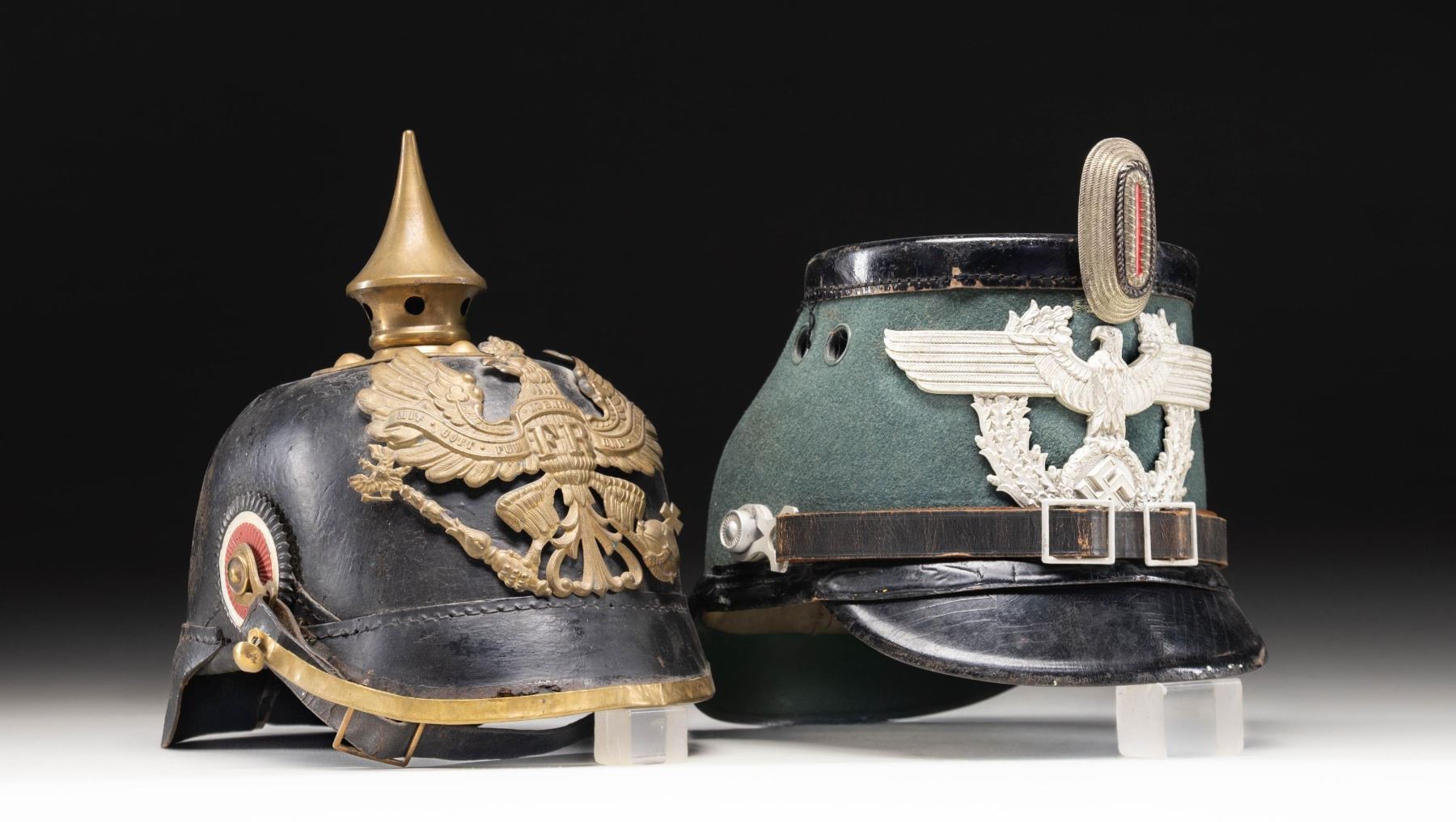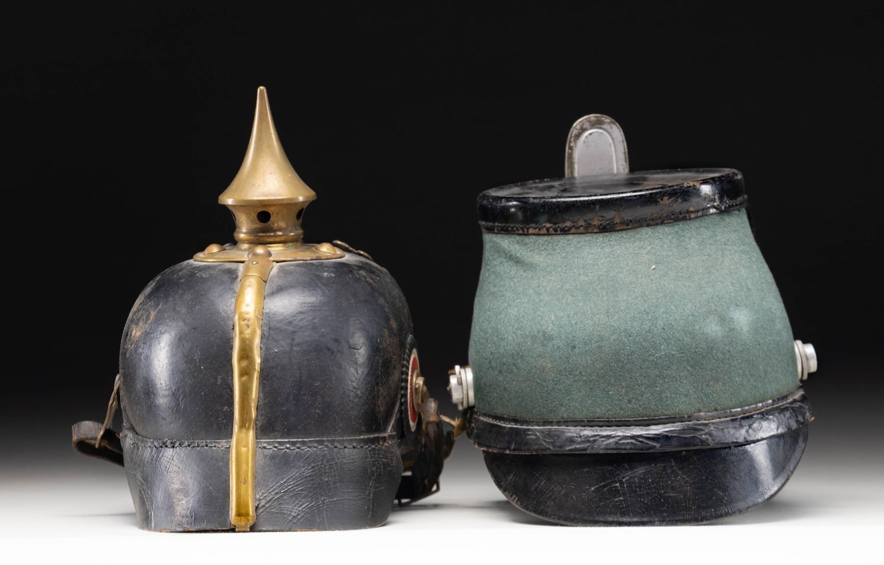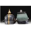 GERMAN WWI SPIKE HELMET & WWII POLICE SHAKO.