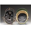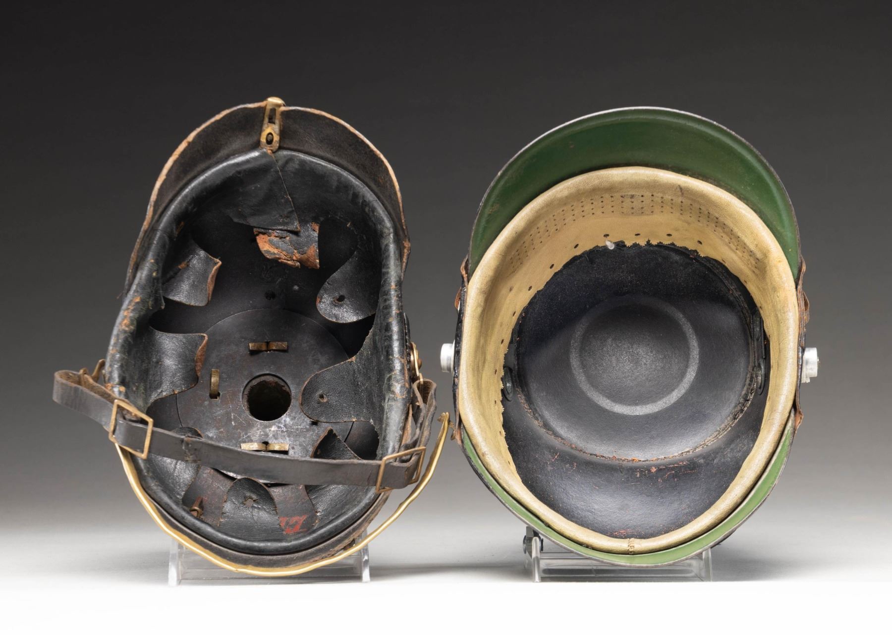 1) WWI German Prussian Infantry brass trimmed spike helmet. The spike, base, front plate, side post, visor trim, spine, and chin strap ends are all brass. There is a national cockade on the right and the left cockade and side post are missing. CONDITION: helmet is relatively solid with no extra holes. The brass has a rich patina and is undamaged. The visor trim is loose and the liner is a bit worn. 2) A good WWII German green felt covered black leather trimmed Police shakp. The front has a large aluminum Police eagle and the side posts are also aluminum. Complete chinstrap and elongated cockade at the top front. Tan leather sweatband. CONDITION: shako has a good look with light wear. The vent screens on the right side are missing. Interior foam under the sweatband is deteriorated. (02-25447/BF). NON-GUN. $600-900.