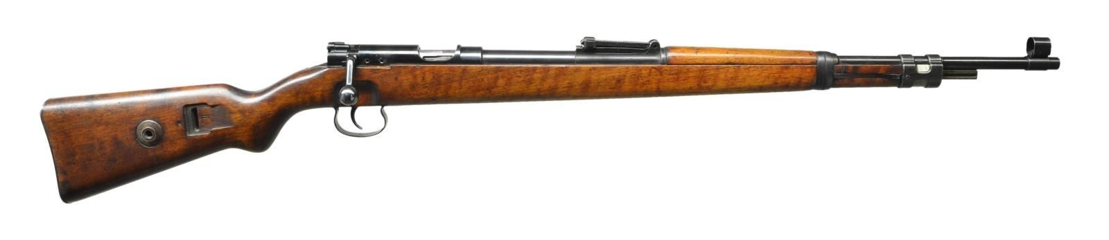 SINGLE SHOT TRAINING RIFLE. Cal. 22 LR. S# 4934. S# match on bbl. & bolt. Bbl. 25 7/8". Tangent rear sight graduated to 200 meters. Inverted V front sight w/ protective hood. Target aperture added to front sight. Bayonet bar is present. Receiver ring is marked on top w/ lg. Mauser banner. Receiver bridge is marked on top w/ "KK-WEHRSPORTGEWEHR". "MAUSER-WERKE A-G OBERNDORF a-N". Bbl. is marked on left side in chamber area "KAL. 22 LANG FUR BUCHSEN". "D.F.". Receiver & bbl. have "eagle N" proofs. Turned down bolt handle. Bolt has early style extractor. Drilled & tapped on the right side for a receiver sight. All milled furniture. Cleaning rod hole has been filled w/ epoxy. Walnut stock set. Stock is marked on right side of butt in sling slot w/ "N". Equipped for side sling. Steel takedown hole. Flat type buttplate. CONDITION: stock set has light wear staining & handling marks from careful use but retains an attractive appearance. Right side of stock has shallow inletting for receiver sight. Metal retains 75% original finish w/ light wear & scattered handling marks. Very good shiny bore. (23-38/RW). CURIO. $800-1,100