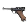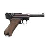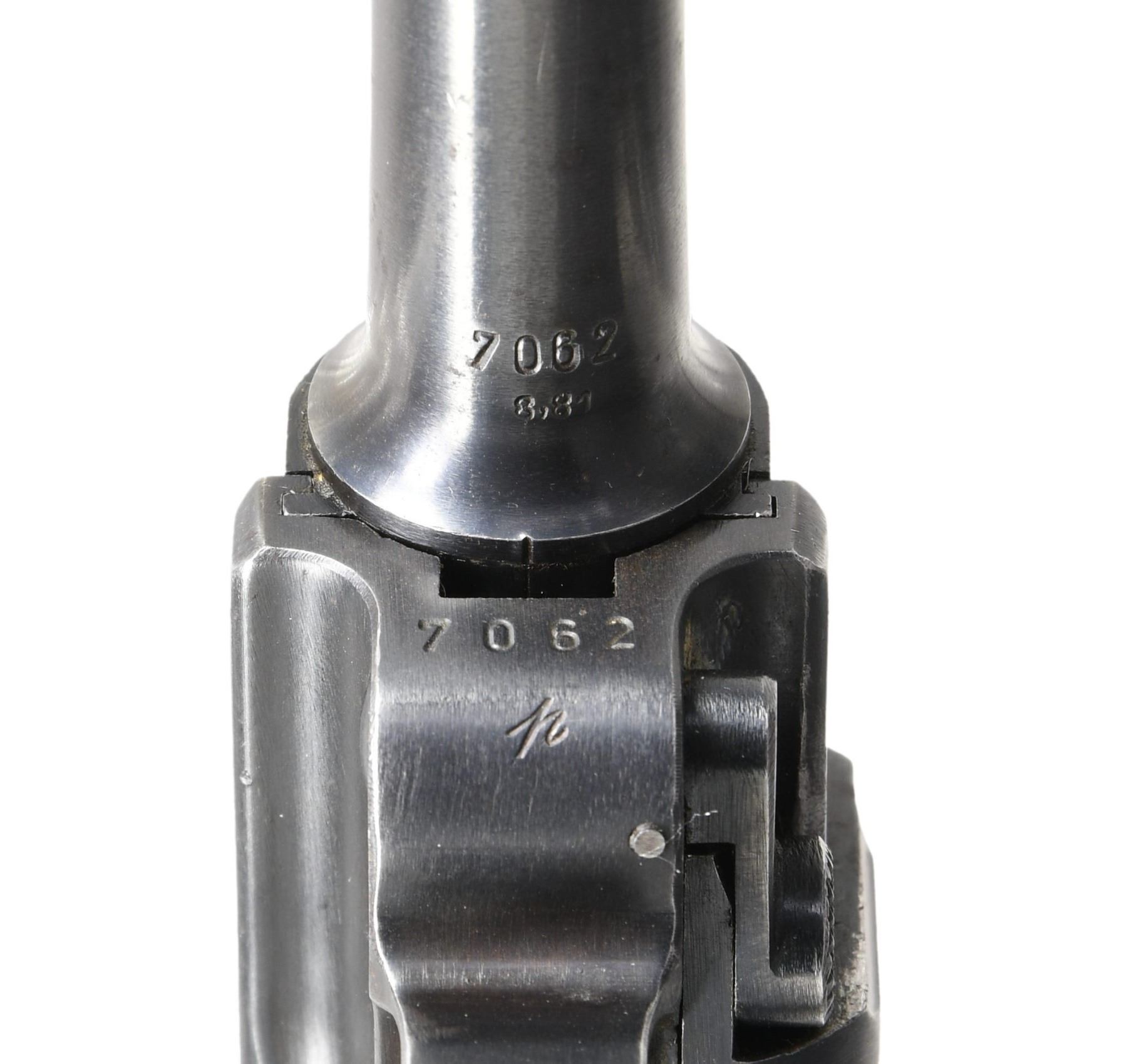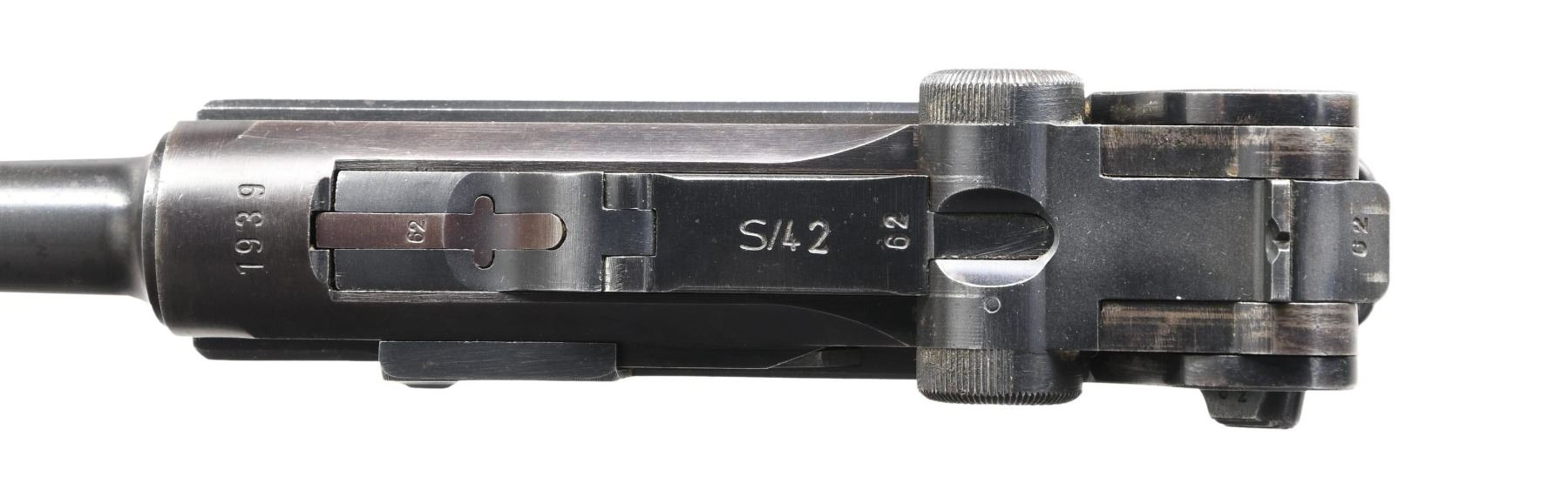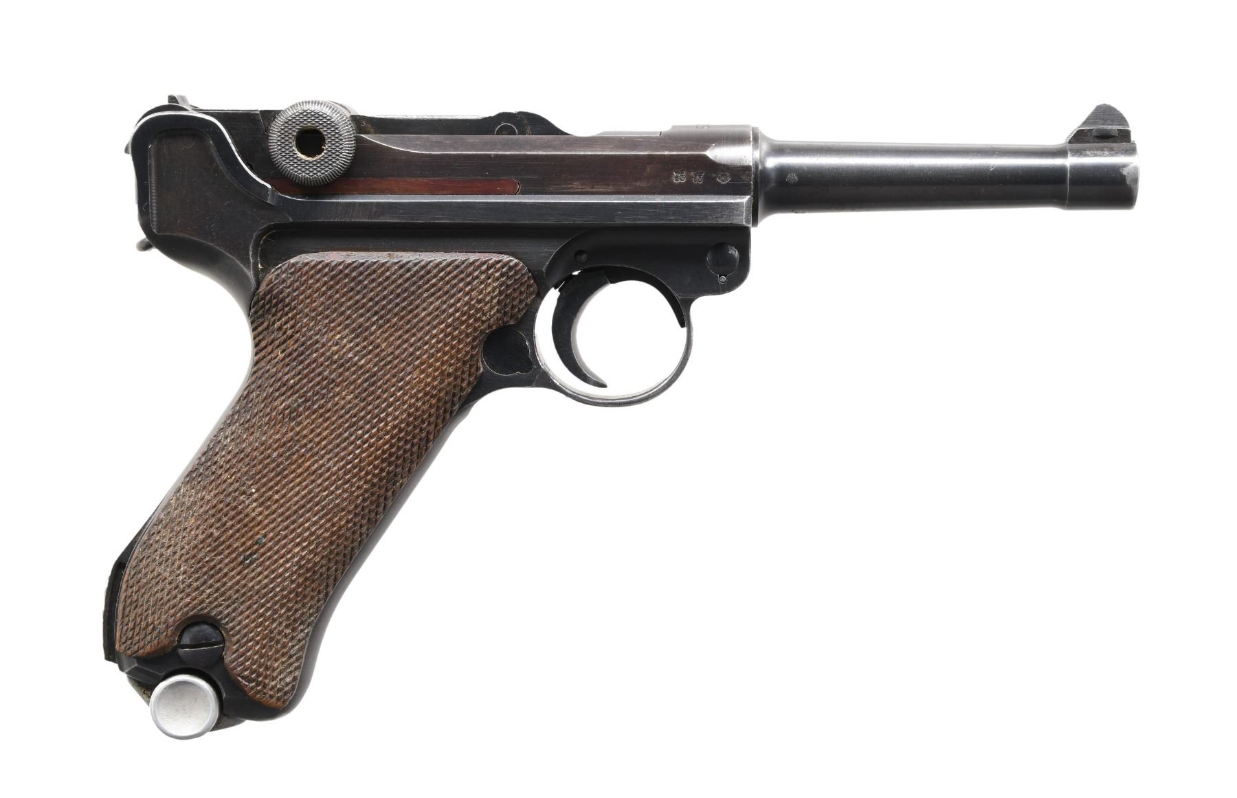 LUGER SEMI-AUTOMATIC PISTOL. Cal. 9mm Para. S# 7062p. Bbl. 4". P.08 Luger semi-automatic pistol, mfg. by Mauser for the German military in 1939. The bbl. extension is marked "1939" over the chamber, with Mauser Eagle/63 acceptance proofs marked on the right. Toggle is marked with Mauser's clandestine "S/42" code. Metal components exhibit a salt blue finish overall. Frame is mounted with 2-piece checkered wood grips. Standard blade front sight, with V-notch rear sight. Nearly all serialized parts are matching and include the frame, takedown lever, sideplate, trigger, safety lever & bar, hold-open latch, bbl., bbl. extension, trigger bar, breechblock, extractor, firing pin, toggles, as well as the rear toggle pin. Grips are unnumbered, and the aluminum bottom mag. is mismatched. MAGS: 1 8-rd. CONDITION: metal components retain the majority of their original arsenal salt blue finish, exhibiting some light wear, thinning, and surface oxidation overall. Bbl. exhibits areas of mild to moderate wear and thinning that through to gray patina (primarily on the muzzle). Very bright bore, exhibiting scattered areas of light to mild surface pitting while retaining well-defined rifling throughout. Grips show mild smoothing and a few scattered nicks to the diamonds, but otherwise remain sturdy and serviceable. (24-4106/MLW). CURIO. $1,200-2,000.