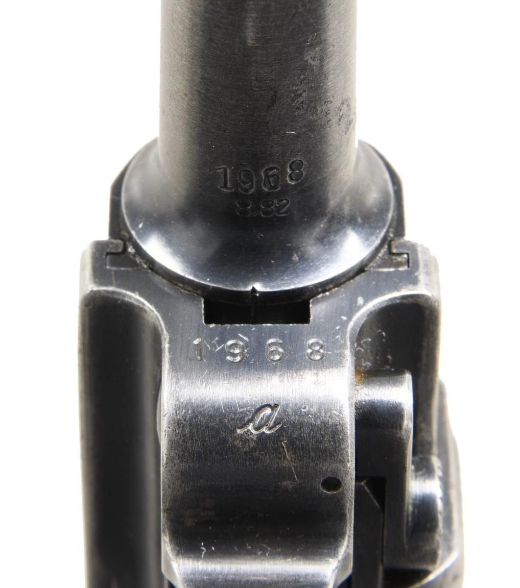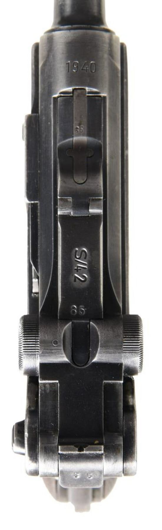 LUGER SEMI-AUTOMATIC PISTOL. Cal. 9mmL. S# 1968a. Bbl 4". Standard configuration P.08 Luger manufactured by Mauser during World War II. The top of the receiver is stamped "1940", with Mauser arsenal proofs stamped on the right. Toggle bears Mauser's "S/42" manufacturer code. Metal components are blued, with the frame being mounted with 2 piece checkered wood grips. Interior of right grip panel is hand carved "104L 223X592". Matching numbers are present on the frame, takedown lever, sideplate, trigger, safety bar & lever, receiver, trigger bar, and barrel. Toggle assembly does not match, but matches itself. Grips are unserialized. MAGS: 1 8 rnd. CONDITION: metal components retain fair amounts of their original arsenal blue finish, exhibiting wear and thinning overall that shows through to a pleasant gray patina, with some scattered spots of mild pitting and light surface oxidation. Bore is bright, exhibiting consistent mild pitting and strong rifling throughout. Grips show smoothing and scattered marks from handling and storage, but otherwise remain sturdy and serviceable. (23-2623/MLW). CURIO. $700-1,000.
