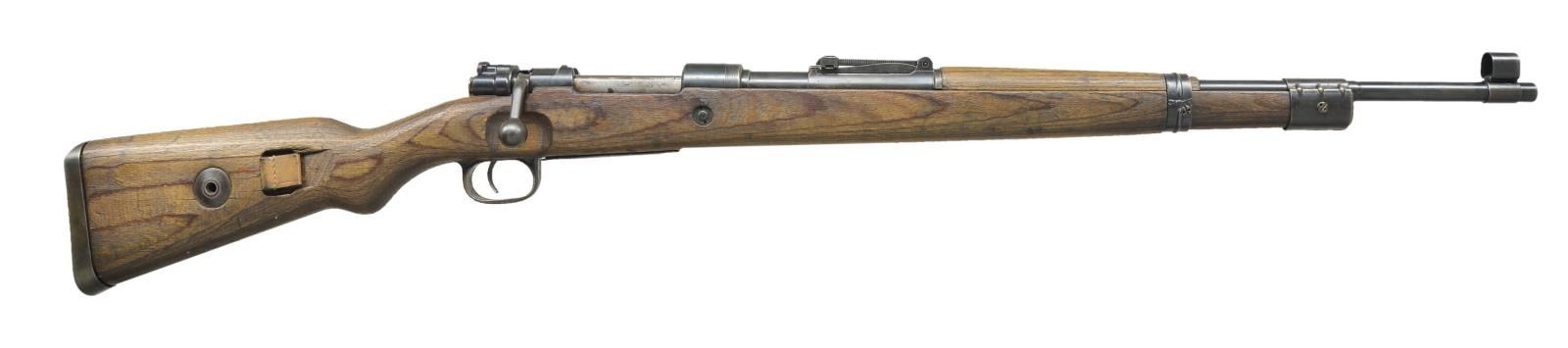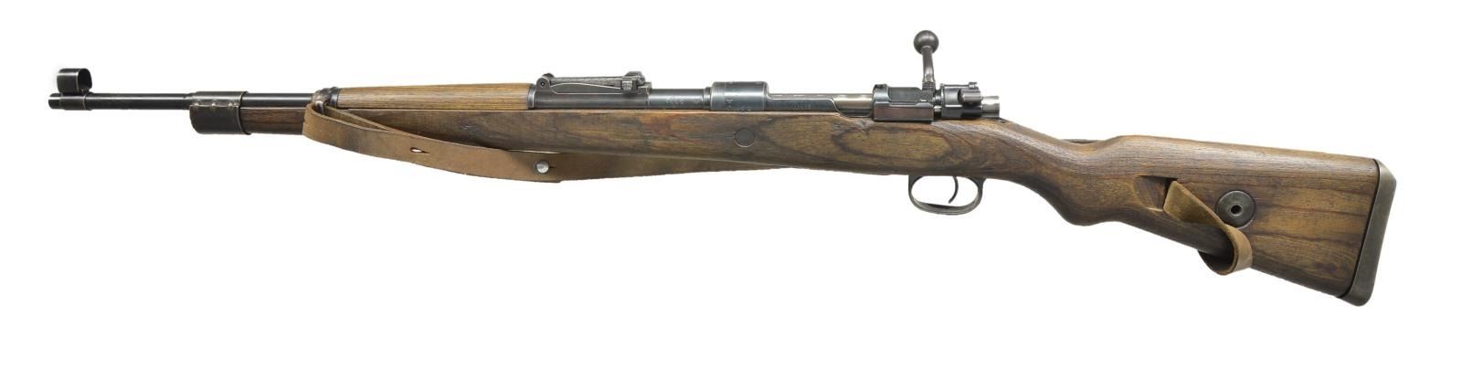 KRIEGSMODELL BOLT ACTION MILITARY RIFLE. Cal. 8mm Mauser. S# 7895z. Bbl. 23 5/8". Receiver ring is marked on top w/ "dot" & eagle acceptance mark. Marked on right side w/ eagle "63". Marked on left side of receiver & bbl. German eagle proof. Left receiver rail marked "Mod. 98". Tangent rear sight graduated to 2,000 meters. Inverted V front sight w/ protective hood. Rifle made w/out cleaning rod or bayonet bar. Stamped bands retain by screws. Stamped floorplate & trigger guard. Trigger guard has eagle "214". Floorplate is marked "byf" & eagle "135". Laminated stock & handguard. Stock has notably coarse late wartime finish w/ machine marks. Eagle acceptance mark on right side of butt very indistinct. Cup type buttplate. Steel disassembly disk. Late type brown leather sling w/ folded, stitched retainer. CONDITION: stock set has moderate wear, staining, scratches & handling marks throughout. Has 3" crack behind receiver tang & also repaired chip. Handguard has notably smoother appearance w/ crack extending under band at forward end. Metal has 50% blue turning gray w/ thinning & wear. Fair bore w/ worn lands & frosted appearance in grooves. PROVENANCE: from the estate collections of Charles P. Obremski. (22-1387/RW). CURIO. $400-600.