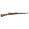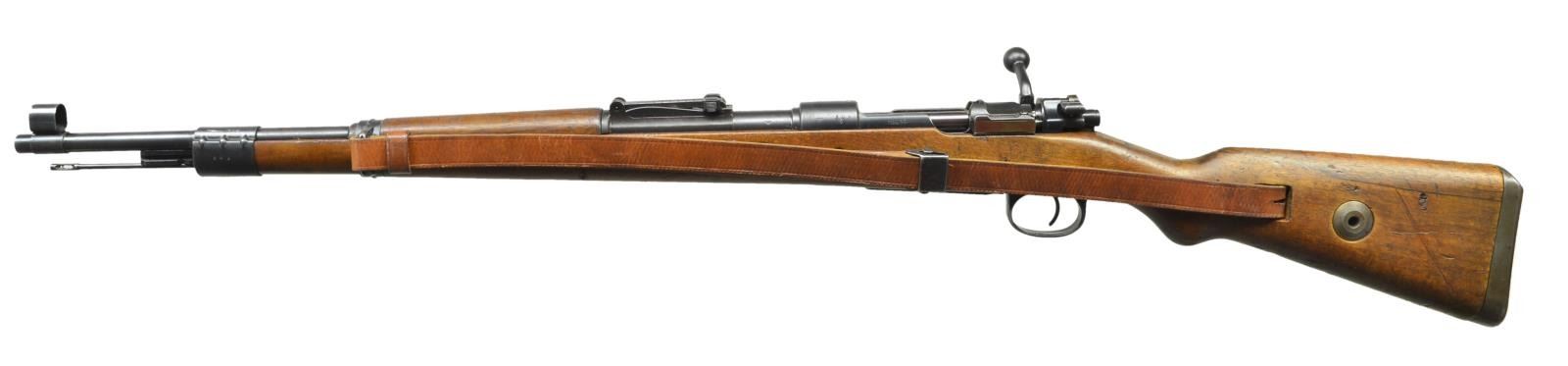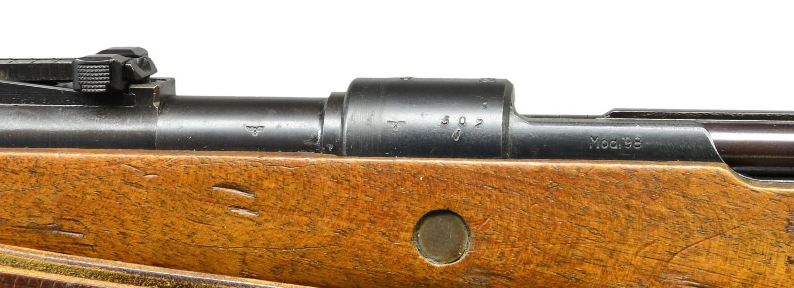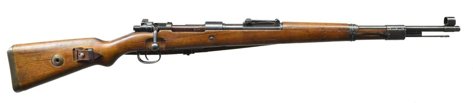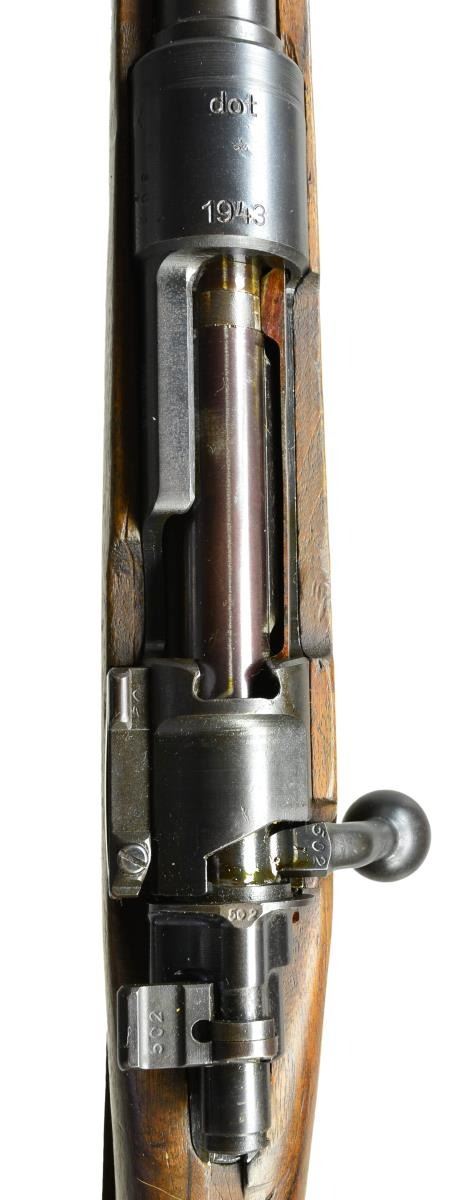 98K BOLT ACTION MILITARY RIFLE. Cal. 8mm Mauser. S# 502i. All visible numbers match. Bbl. 23 5/8". Receiver ring marked on top "dot 1943 eagle 63' acceptance mark. Receiver ring & bbl. have German eagle proofs on left side. Left receiver rail marked "Mod.98". Tangent rear sight graduated to 2,000m. Inverted V sight w/ protective hood. Bayonet bar & cleaning rod are present. Stamped upper & lower bands retained by single spring. Stamped trigger guard & floorplate. Floorplate marked "byf" & eagle "135". Walnut stock set. Handguard marked on top w/ "dot". Buttstock marked "dot" at belly. Cup type buttplate. Steel disassembly disk. Correct German leather sling. UNATTACHED ACCESSORIES: fabric storage sleeve. CONDITION: original finish stock set has moderate wear, scratches & handling marks throughout. Notable deep scratches on right side above trigger guard. Metal retains 90% original blue finish w/ thinning & light wear. Extractor has notable plum coloration. Very good shiny bore. (22-2086/RW). CURIO. $2,000-3,000.