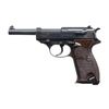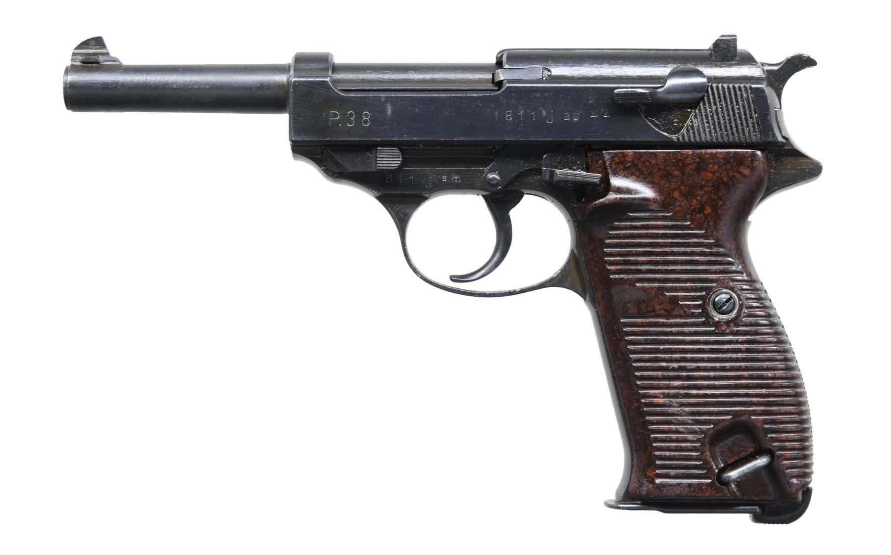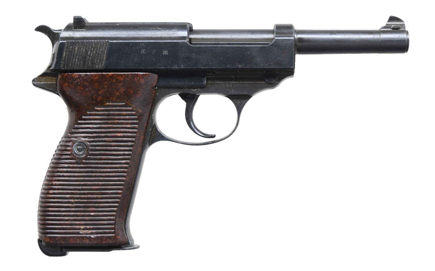 SEMI-AUTOMATIC PISTOL. Cal. 9mm Luger. S# 1811j. Bbl. 4 7/8". Standard configuration P.38 semi-automatic pistol mfg. at the Walther arsenal in 1944. Left side of the slide is marked "P.38", followed by the S#, as well as Walther's mfg. code and the 2-digit year of mfg. "ac 44", with Eagle/359 proofs and an eagle firing proof stamped on the right. Right side of the frame exhibits an R Guns import mark. Metal components exhibit what appears to be a Russian-reapplied blue finish. Frame is mounted with 2-piece grooved brown pressed resin grips. Bbl. is marked with an "fnh" mfg. code and an Eagle/WaA76 proof, indicating that this is one of 8,000 bbls. supplied to Walther in 1944 that were mfg. by Bohmische Waffenfabriken Prague's Strakonice plant. All serialized parts are matching and include the frame, slide, bbl., and locking block. MAGS: one 8-rd. UNATTACHED ACCESSORIES: plain white box. CONDITION: metal components retain the majority of their reapplied blue finish, exhibiting some superficial handling marks overall. Fair bore, exhibiting dark pitting while retaining strong rifling throughout. Grips show scattered marks and some minor losses from handling and storage, but otherwise remain sturdy and serviceable. (24-5487/MLW). CURIO. $300-500.