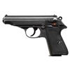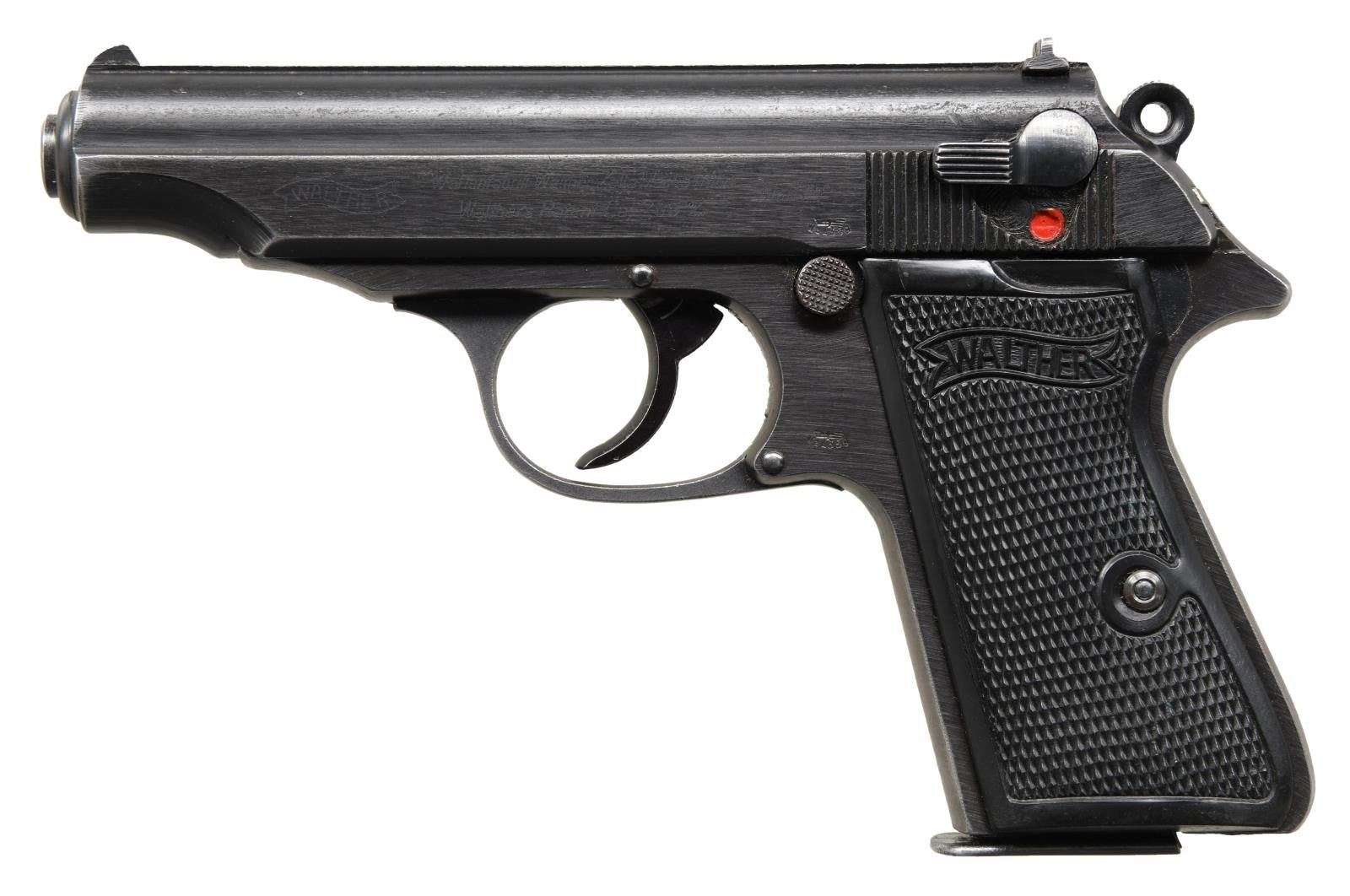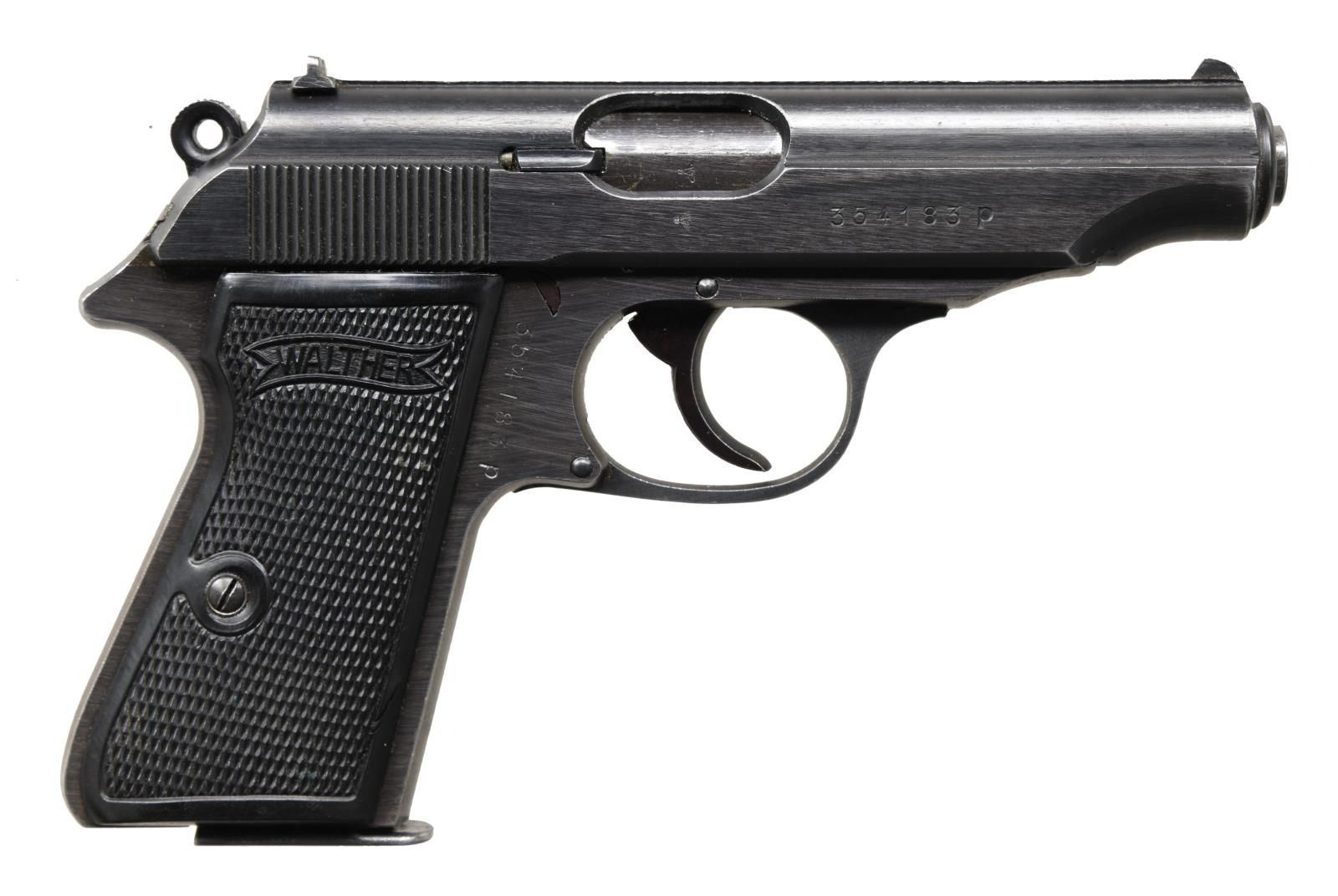 PISTOL. Cal. 7.65mm. S# 354183P. Bbl 3 7/8". Standard configuration Model PP manufactured by Walther during World War II. The left side of the slide is marked with the Walther banner logo followed by markings stipulating Walther's manufacturer information, the caliber designation, as well as the model designation. Left side of slide and frame exhibit a Walther Eagle/WaA359 waffenamt, indicating military acceptance. Right side of slide and chamber exhibit a Eagle/N commercial nitro proof. Metal components are blued, with the frame being mounted with 2 piece black checkered plastic Walther banner logo grips. Frame and slide are matching. MAGS: 1 8 rnd. CONDITION: metal components retain the majority of their original factory blue finish, exhibiting some mild wear and thinning overall that show through to gray patina. Brilliant mirror bore, exhibiting well defined rifling throughout. Grips show some light smoothing, with the right panel exhibiting a small crack, but otherwise remain sturdy and serviceable. (23-2624/MLW). CURIO. $600-1,000.