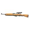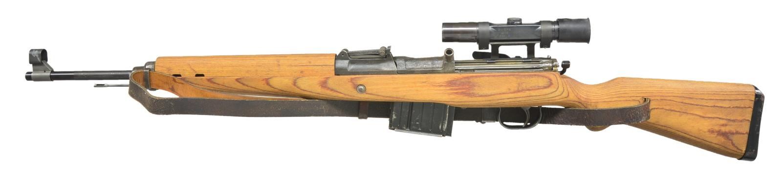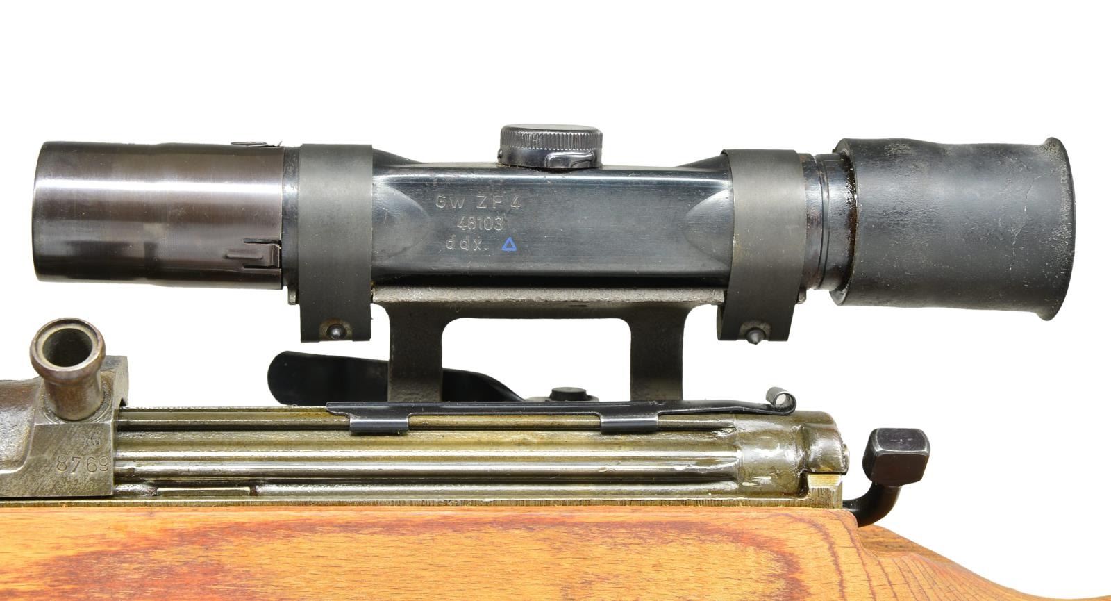 RIFLE WITH ZF4 TELESCOPIC SIGHT. Cal. 8mm Mauser. S# 8769c. Bbl. 21 3/4". Late production gun w/ forged appearance & dbl. lug receiver. Muzzle is not threaded. Serial numbers match on receiver, bolt, bolt carrier, firing pin carrier & locking flaps. Bolt housing & gas cyl. are not numbered. Receiver marked on left side w/ "K43 ac" "45" & German eagle "359". Tangent rear sight graduated to 1,200m. Blade type front sight w/ protective hood. Hollow bolt handle. Laminated stock set & handguard. Buttstock marked on left side w/ eagle "WaA 359". Trap buttplate finished w/ black enamel. Brown late production leather sling. Original ZF4 scope & mt. Scope marked on left side "GW" "ZF4" "ddx" & "48103". Scope mfg. by Voigtlander & Sohn. Scope made w/ pointed post reticle w/ horizontal crossbars. Scope has rain shield at ocular lens. Rear lens covered by rubber eye piece which is glued in place along w/ the amber filter. Scope mt. marked w/ slanted "3714" & eagle "359" inspection mark. Scope is equipped w/ original scope caps with leather objective lens cover & wood plug for ocular lens. MAGS: 1 detachable 10 rd. marked w/ "aye", eagle "WaA 843" & "K43". CONDITION: stock has very light wear & scattered handling marks w/ original thin wartime finish. Metal is turning gray w/ light wear. Front sight base is gray phosphate. Good shiny bore w/ sharp lands but appearance of light frosting in grooves. Scope retains lg. percentage of original blue finish. Mt. has gray wartime finish w/ light wear. Amber lens is installed under glued on eye cup & obscures the sight picture but it appears that the lenses & reticle are cloudy but serviceable. PROVENANCE: From the estate collection of Charles P. Obremski. (22-1389/RW). CURIO. $3,000-4,000.