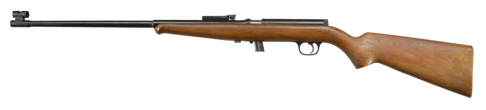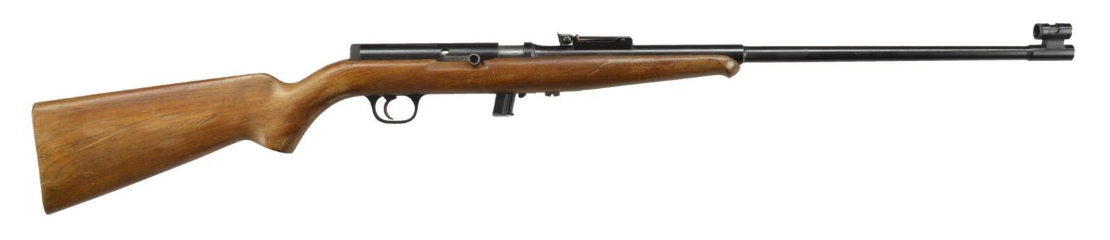 Cal. 22 Short. NSN. Mfg. in France as possibly A3 Model w/ 21.65" bbl. Globe post front sight & elevator rear sight (leaf replaced w/ copper wire). An unusual open bolt action w/ rib on breech face replacing firing pin & milled floor on right side of mag. well acts as shell deflector instead of having an extractor. Top of receiver has grooves for tip off scope mts. Schnabel tipped pistol grip stock. MAGS: 1 - 10 rd. CONDITION: Good overall. Blue has pinprick oxidation & light marks. Stock has lg. crack from rear sight bast to takedown screw on right side & lg. crack from top receiver through wrist to comb. Fair worn stock finish w/ moderate marks throughout. Very good bore. (22-1930/MD). MODERN. $300-500.